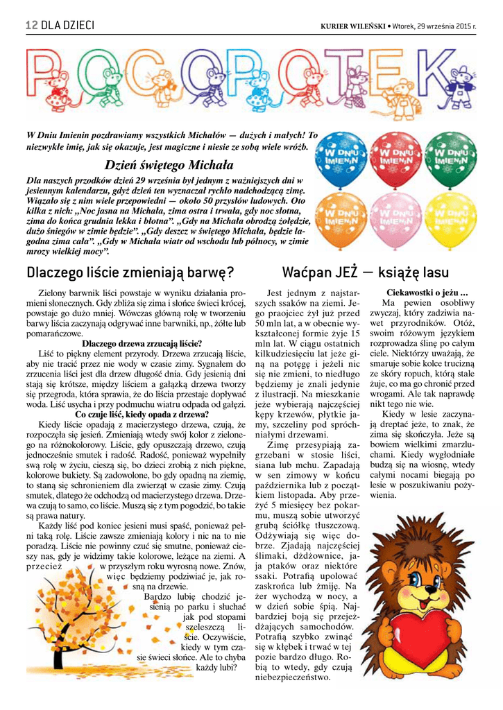 12 DLA DZIECI KURIER WILEŃSKI • Wtorek, 29 września 2015 r. W Dniu Imienin pozdrawiamy wszystkich Michałów — dużych i małych! To niezwykłe imię, jak się okazuje, jest magiczne i niesie ze sobą wiele wróżb. Dzień świętego Michała Dla naszych przodków dzień 29 września był jednym z ważniejszych dni w jesiennym kalendarzu, gdyż dzień ten wyznaczał rychło nadchodzącą zimę. Wiązało się z nim wiele przepowiedni — około 50 przysłów ludowych. Oto kilka z nich: „Noc jasna na Michała, zima ostra i trwała, gdy noc słotna, zima do końca grudnia lekka i błotna”. „Gdy na Michała obrodzą żołędzie, dużo śniegów w zimie będzie”. „Gdy deszcz w świętego Michała, będzie łagodna zima cała”. „Gdy w Michała wiatr od wschodu lub północy, w zimie mrozy wielkiej mocy”. Dlaczego liście zmieniają barwę? Zielony barwnik liści powstaje w wyniku działania promieni słonecznych. Gdy zbliża się zima i słońce świeci krócej, powstaje go dużo mniej. Wówczas główną rolę w tworzeniu barwy liścia zaczynają odgrywać inne barwniki, np., żółte lub pomarańczowe. Dlaczego drzewa zrzucają liście? Liść to piękny element przyrody. Drzewa zrzucają liście, aby nie tracić przez nie wody w czasie zimy. Sygnałem do zrzucenia liści jest dla drzew długość dnia. Gdy jesienią dni stają się krótsze, między liściem a gałązką drzewa tworzy się przegroda, która sprawia, że do liścia przestaje dopływać woda. Liść usycha i przy podmuchu wiatru odpada od gałęzi. Co czuje liść, kiedy opada z drzewa? Kiedy liście opadają z macierzystego drzewa, czują, że rozpoczęła się jesień. Zmieniają wtedy swój kolor z zielonego na różnokolorowy. Liście, gdy opuszczają drzewo, czują jednocześnie smutek i radość. Radość, ponieważ wypełniły swą rolę w życiu, cieszą się, bo dzieci zrobią z nich piękne, kolorowe bukiety. Są zadowolone, bo gdy opadną na ziemię, to staną się schronieniem dla zwierząt w czasie zimy. Czują smutek, dlatego że odchodzą od macierzystego drzewa. Drzewa czują to samo, co liście. Muszą się z tym pogodzić, bo takie są prawa natury. Każdy liść pod koniec jesieni musi spaść, ponieważ pełni taką rolę. Liście zawsze zmieniają kolory i nic na to nie poradzą. Liście nie powinny czuć się smutne, ponieważ cieszy nas, gdy je widzimy takie kolorowe, leżące na ziemi. A przecież w przyszłym roku wyrosną nowe. Znów, więc będziemy podziwiać je, jak rosną na drzewie. Bardzo lubię chodzić jesienią po parku i słuchać jak pod stopami szeleszczą liście. Oczywiście, kiedy w tym czasie świeci słońce. Ale to chyba każdy lubi? Waćpan JEŻ − książę lasu Jest jednym z najstarszych ssaków na ziemi. Jego praojciec żył już przed 50 mln lat, a w obecnie wykształconej formie żyje 15 mln lat. W ciągu ostatnich kilkudziesięciu lat jeże giną na potęgę i jeżeli nic się nie zmieni, to niedługo będziemy je znali jedynie z ilustracji. Na mieszkanie jeże wybierają najczęściej kępy krzewów, płytkie jamy, szczeliny pod spróchniałymi drzewami. Zimę przesypiają zagrzebani w stosie liści, siana lub mchu. Zapadają w sen zimowy w końcu października lub z początkiem listopada. Aby przeżyć 5 miesięcy bez pokarmu, muszą sobie utworzyć grubą ściółkę tłuszczową. Odżywiają się więc dobrze. Zjadają najczęściej ślimaki, dżdżownice, jaja ptaków oraz niektóre ssaki. Potrafią upolować zaskrońca lub żmiję. Na żer wychodzą w nocy, a w dzień sobie śpią. Najbardziej boją się przejeżdżających samochodów. Potrafią szybko zwinąć się w kłębek i trwać w tej pozie bardzo długo. Robią to wtedy, gdy czują niebezpieczeństwo. Ciekawostki o jeżu ... Ma pewien osobliwy zwyczaj, który zadziwia nawet przyrodników. Otóż, swoim różowym językiem rozprowadza ślinę po całym ciele. Niektórzy uważają, że smaruje sobie kolce trucizną ze skóry ropuch, którą stale żuje, co ma go chronić przed wrogami. Ale tak naprawdę nikt tego nie wie. Kiedy w lesie zaczynają dreptać jeże, to znak, że zima się skończyła. Jeże są bowiem wielkimi zmarzluchami. Kiedy wygłodniałe budzą się na wiosnę, wtedy całymi nocami biegają po lesie w poszukiwaniu pożywienia. DLA DZIECI 13 KURIER WILEŃSKI • Wtorek, 29 września 2015 r. Uwaga konkurs Pocopotka Rozwińcie swoją wyobraźnię i narysujcie, namalujcie, napiszcie opowiadanie lub wiersz, zróbcie wyklejankę, ulepcie z plasteliny, wytnijcie z papieru, wykonajcie kolaż Pożegnanie LATA Co będzie tematem przewodnim Waszej pracy — zależy tylko i wyłącznie od każdego z Was. Zastanówcie się, co najbardziej lubicie latem i w jaki sposób chcielibyście podziękować tej przepięknej i niezwykle wesołej oraz beztroskiej porze roku. Czekamy na Wasze prace w redakcji „Kuriera Wileńskiego” Mały jeż znalazł dwa żołędzie i zostawił je dla swojej przyjaciółki wiewiórki. Pomóżcie wiewióreczce do nich dotrzeć. (Birbynių 4, Vilnius 02121) przez cały miesiąc — do dnia 5 października. Jedynie prace pisemne, czyli opowiadania lub wiersze, możecie przesłać pocztą e-mail na adres Waszej Pucułki: [email protected]. Wszyscy pracownicy naszej redakcji i liczni goście, którzy odwiedzają nasze progi, są zawsze zachwyceni Waszymi pracami i bardzo szczęśliwi Waszą obecnością — bo Wasze prace, to cząsteczka każdego z Was! Nagrody już czekają! Czasu pozostało niewiele! Tak więc, do dzieła, moi Przyjaciele! Wakacyjne wspomnienia przywiezione w pamięci Zapraszam do pierwszej pracy konkursowej. Opowiadanie było dłuższe, ale ze względów ograniczonego miejsca, musiałam je skrócić. Mam nadzieję, że się nie gniewasz. Brawo, Lucjo, nagroda dla Ciebie jest gwarantowana! Wakacje, wakacje i po wakacjach! Żegnaj lato… Miło jest rozpocząć naukę w nowym roku szkolnym, ale pożegnać się z wakacjami, które w tym roku był