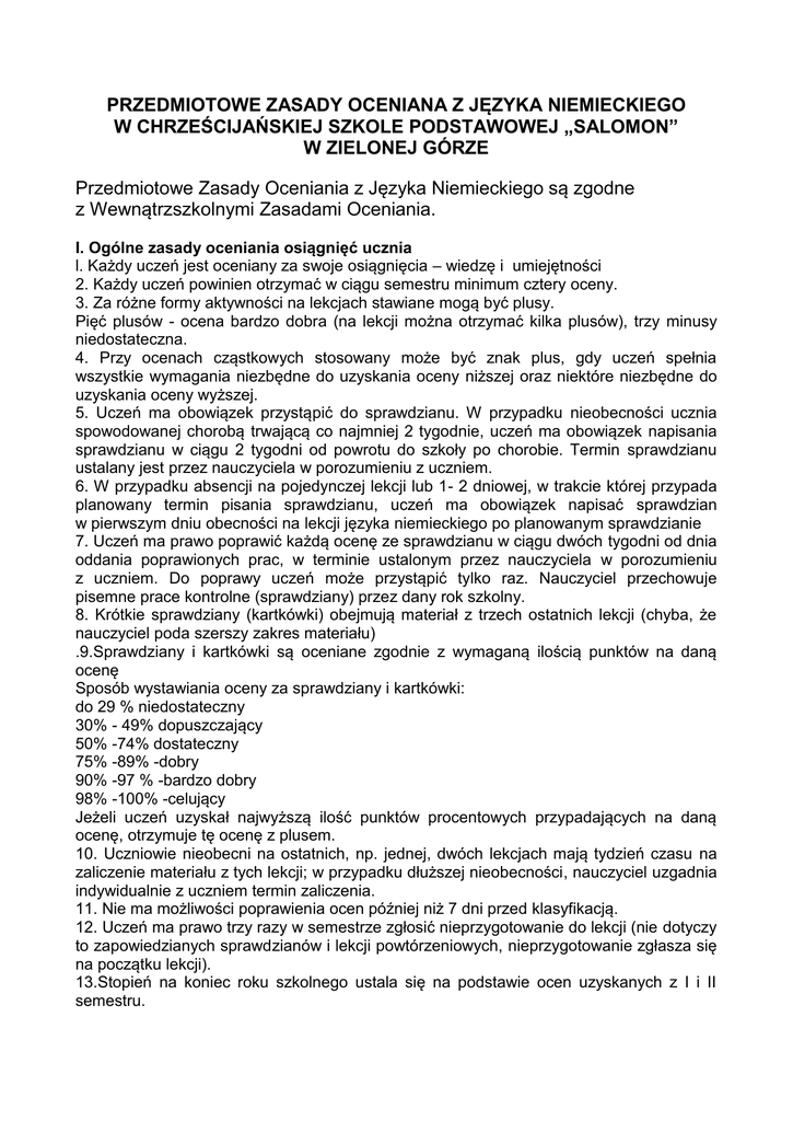 PRZEDMIOTOWE ZASADY OCENIANA Z JĘZYKA NIEMIECKIEGO W CHRZEŚCIJAŃSKIEJ SZKOLE PODSTAWOWEJ „SALOMON” W ZIELONEJ GÓRZE Przedmiotowe Zasady Oceniania z Języka Niemieckiego są zgodne z Wewnątrzszkolnymi Zasadami Oceniania. I. Ogólne zasady oceniania osiągnięć ucznia l. Każdy uczeń jest oceniany za swoje osiągnięcia – wiedzę i umiejętności 2. Każdy uczeń powinien otrzymać w ciągu semestru minimum cztery oceny. 3. Za różne formy aktywności na lekcjach stawiane mogą być plusy. Pięć plusów - ocena bardzo dobra (na lekcji można otrzymać kilka plusów), trzy minusy niedostateczna. 4. Przy ocenach cząstkowych stosowany może być znak plus, gdy uczeń spełnia wszystkie wymagania niezbędne do uzyskania oceny niższej oraz niektóre niezbędne do uzyskania oceny wyższej. 5. Uczeń ma obowiązek przystąpić do sprawdzianu. W przypadku nieobecności ucznia spowodowanej chorobą trwającą co najmniej 2 tygodnie, uczeń ma obowiązek napisania sprawdzianu w ciągu 2 tygodni od powrotu do szkoły po chorobie. Termin sprawdzianu ustalany jest przez nauczyciela w porozumieniu z uczniem. 6. W przypadku absencji na pojedynczej lekcji lub 1- 2 dniowej, w trakcie której przypada planowany termin pisania sprawdzianu, uczeń ma obowiązek napisać sprawdzian w pierwszym dniu obecności na lekcji języka niemieckiego po planowanym sprawdzianie 7. Uczeń ma prawo poprawić każdą ocenę ze sprawdzianu w ciągu dwóch tygodni od dnia oddania poprawionych prac, w terminie ustalonym przez nauczyciela w porozumieniu z uczniem. Do poprawy uczeń może przystąpić tylko raz. Nauczyciel przechowuje pisemne prace kontrolne (sprawdziany) przez dany rok szkolny. 8. Krótkie sprawdziany (kartkówki) obejmują materiał z trzech ostatnich lekcji (chyba, że nauczyciel poda szerszy zakres materiału) .9.Sprawdziany i kartkówki są oceniane zgodnie z wymaganą ilością punktów na daną ocenę Sposób wystawiania oceny za sprawdziany i kartkówki: do 29 % niedostateczny 30% - 49% dopuszczający 50% -74% dostateczny 75% -89% -dobry 90% -97 % -bardzo dobry 98% -100% -celujący Jeżeli uczeń uzyskał najwyższą ilość punktów procentowych przypadających na daną ocenę, otrzymuje tę ocenę z plusem. 10. Uczniowie nieobecni na ostatnich, np. jednej, dwóch lekcjach mają tydzień czasu na zaliczenie materiału z tych lekcji; w przypadku dłuższej nieobecności, nauczyciel uzgadnia indywidualnie z uczniem termin zaliczenia. 11. Nie ma możliwości poprawienia ocen później niż 7 dni przed klasyfikacją. 12. Uczeń ma prawo trzy razy w semestrze zgłosić nieprzygotowanie do lekcji (nie dotyczy to zapowiedzianych sprawdzianów i lekcji powtórzeniowych, nieprzygotowanie zgłasza się na początku lekcji). 13.Stopień na koniec roku szkolnego ustala się na podstawie ocen uzyskanych z I i II semestru. 14. Nauczyciel przekazuje informacje o ocenie: • Uczniowi –jako komentarz do każdej oceny, wyjaśnienie, uzasadnienie, wskazówki do dalszej pracy; • Rodzicom - na ich prośbę, jako informacje o aktualnym rozwoju dziecka, jego uzdolnieniach i trudnościach; 15. Nie później niż trzy tygodnie przed klasyfikacyjnym posiedzeniem Rady Pedagogicznej nauczyciel informuje ucznia i jego rodziców o przewidywanej dla niego ocenie. 16. Uczeń zgłasza wolę poprawienia przewidywalnej oceny klasyfikacyjnej w ciągu trzech dni od uzyskania o niej informacji. 17. Poprawa przewidywanej oceny klasyfikacyjnej obejmuje materiał leksykalno – gramatyczny z całego semestru, a oceny rocznej materiał z całego roku szkolnego i ma formę 45 - 90 minutowego sprawdzianu pisemnego. Sprawdzian ten odbywa sie w terminie uzgodnionym z nauczycielem, jednak nie później niż na 7 dni przed terminem wystawienia oceny semestralnej lub rocznej. Sprawdzian obejmuje kryteria na ocenę, na którą uczeń poprawia proponowaną ocenę, dlatego też uczeń musi uzyskać przynajmniej 90% punktów. 18. Egzamin klasyfikacyjny i poprawkowy składa się z dwóch części:sprawdzianu pisemnego i odpowiedzi ustnej i obejmuje materiał leksykalno – gramatyczny z całego semestru lub roku szkolnego. Sposób wystawiania oceny –taki jak przy sprawdzianach. II. SPOSOBY SPRAWDZANIA OSIAGNIĘĆ UCZNIÓW. Obowiązkowe: 1. Bieżąca kontrola wykonywania zadań, odpowiedź ustna (aktywność na lekcji, prezentacja, referat). 2. Kartkówki (15 min.) z trzech ostatnich lekcji. 3. Praca domowa. 4. Zadania dodatkowe. 5. Sprawdziany pisemne. Nieobowiązkowe: 1. Praca twórcza indywidualna i zespołowa w formie: • prezentacji multimedialnej, • dydaktycznych programów komputerowych, • wideoteki, • wykonanie gazetek, plansz, tabel. 2. Zadania dodatkowe — autoreferaty opracowane metoda projektu. III. Kryteria na poszczególną ocenę klasyfikacyjną (śródroczną i końcową). Celujący: znakomite opanowanie słownictwa i struktur gramatycznych w sposób kreatywny, w zakresie wykraczającym poza program. Wypowiadanie własnego zdania, opinii, sądu; uzasadnienie swojego zdania, rozumienie tekstów czytanych i ze słuchu bez pomocy słownika; reagowanie w sytuacjach dnia codziennego w swobodny sposób. Bezbłędne opanowanie zasad pisowni. Prace pisemne zaliczane w terminie na oceny celujące. Zakwalifikowanie się do etapu wojewódzkiego konkursu przedmiotowego powoduje również otrzymanie oceny celującej. Bardzo dobry: bardzo dobre opanowanie słownictwa i struktur gramatycznych w zakresie programu danej klasy. Umiejętność nawiązywania i podtrzymywania rozmowy. Wypowiadanie własnego zdania, opinii, uzasadnienia na temat przeczytanego tekstu, oglądanego filmu, przerobionego zagadnienia tematycznego. Rozumienie tekstu czytanego i słyszanego przy minimalnym użyciu słownika. Dobra intonacja i ortografia. Prace pisemne zaliczane w terminie na oceny bardzo dobre. Dobry: nieznaczne błędy leksykalne i gramatyczne w zakresie programu nauczania w danej klasie. Umiejętność nawiązywania i podtrzymywania rozmow