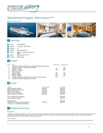 Rejs Maltańska Przygoda - MSC Armonia Rejs z polskim pilotem Informacje Cena: od 619 EUR/os Termin: 11.09.2015 - 20.09.2015 Ilość dni: 10 Region: Morze Śródziemne Trasa: Statek: Włochy > Francja > Hiszpania > Malta MSC Armonia Armator: MSC Cruises Program Dzień 1 2 3 4 5 6 7 8 9 10 Opis Spotkanie z pilotem w Katowicach, przejazd autokarem do La Spezia La Spezia / Włochy, zaokrętowanie na statek Marsylia / Francja Majorka / Hiszpania Dzień na morzu Valletta / Malta Mesyna / Włochy Salerno / Włochy La Spezia / Włochy, wyokrętowanie ze statku, wyjazd do Polski Przyjazd do Katowic w godzinach porannych Wpłynięcie Wypłynięcie 1200 1400 1900 1800 2330 1330 0800 0700 1000 1930 1800 1300 Cennik Usługa kabina wewnętrzna bella kabina wewnętrzna fantastica kabina z oknem bella kabina z oknem fantastica kabina z balkonem fantastica Cena katalog. 669 EUR 719 EUR 769 EUR 819 EUR 859 EUR 3 lub 4 osoba dorosła w kabinie 3 lub 4 dziecko w kabinie opłaty portowe apartament z balkonem (suite) fantastica * ceny za 1 os. w kabinie dwuosobowej Promocja 619 EUR 669 EUR 719 EUR 769 EUR 809 EUR 809 EUR 299 EUR 979 EUR 120 EUR 929 EUR Dodatkowe informacje Cena obejmuje: rejs statkiem, zakwaterowanie w kabinie 2 os. w wybranej kategorii, pełne wyżywienie (śniadanie, lunch, podwieczorek, obiadokolację oraz przekąski dostępne w bufecie w ciągu dnia) napoje kawa, herbata, woda dostępne w restauracji bufetowej, korzystanie z basenu, siłowni oraz urządzeń sportowo – rekreacyjnych, serwis kabinowy i bagażowy podczas wejścia i zejścia ze statku, udział we wszystkich imprezach organizowanych na statku (widowiska w teatrze, animacje, koncerty). Cena nie obejmuje: opłat portowych, ubezpieczenia KL, NW i bagażu, kosztów dojazdu do portu, wycieczek fakultatywnych zamawianych na pokładzie statku, korzystania z punktów usługowych (pralnia, fotograf, SPA itp.) 1/2 Obowiązkowych napiwków dla załogi osoba dorosła 8,5 EUR/os./dzień dzieci 3-13 lat 4,25 EUR/os./dzień. All Inclusive (opcjonalnie) Istnieje możliwość wykupienia formuły all inclusive na czas trwania rejsu. Pakiet obejmuje napoje alkoholowe i bezalkoholowe dostępne we wszystkich barach bez ograniczeń (Napoje objęte pakietem: piwo, wino, napoje gazowane, likiery, koktajle, wódka, koniak, whisky itp.) Koszt pakietu 26 EUR/dzień osoba dorosła i 12 EUR/dzień dziecko. Formuła all inclusive obowiązkowa jest na czas całego rejsu dla wszystkich osób podróżujących w jednej kabinie. 2/2 Powered by TCPDF (www.tcpdf.org)
