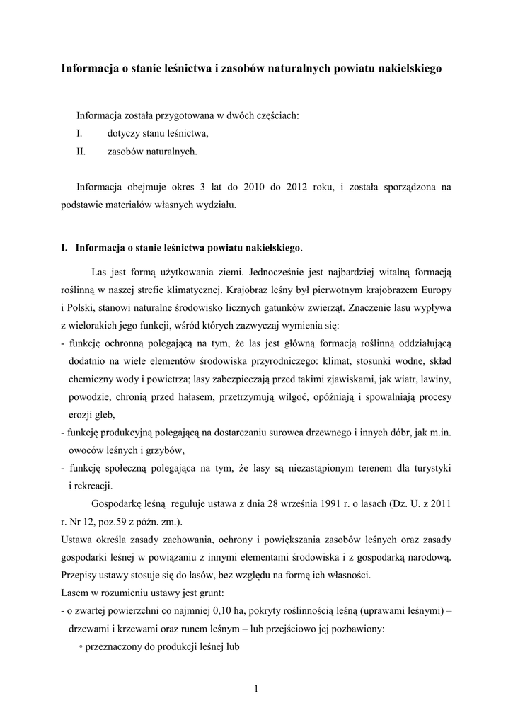 Informacja o stanie leśnictwa i zasobów naturalnych powiatu nakielskiego Informacja została przygotowana w dwóch częściach: I. dotyczy stanu leśnictwa, II. zasobów naturalnych. Informacja obejmuje okres 3 lat do 2010 do 2012 roku, i została sporządzona na podstawie materiałów własnych wydziału. I. Informacja o stanie leśnictwa powiatu nakielskiego. Las jest formą użytkowania ziemi. Jednocześnie jest najbardziej witalną formacją roślinną w naszej strefie klimatycznej. Krajobraz leśny był pierwotnym krajobrazem Europy i Polski, stanowi naturalne środowisko licznych gatunków zwierząt. Znaczenie lasu wypływa z wielorakich jego funkcji, wśród których zazwyczaj wymienia się: - funkcję ochronną polegającą na tym, że las jest główną formacją roślinną oddziałującą dodatnio na wiele elementów środowiska przyrodniczego: klimat, stosunki wodne, skład chemiczny wody i powietrza; lasy zabezpieczają przed takimi zjawiskami, jak wiatr, lawiny, powodzie, chronią przed hałasem, przetrzymują wilgoć, opóźniają i spowalniają procesy erozji gleb, - funkcję produkcyjną polegającą na dostarczaniu surowca drzewnego i innych dóbr, jak m.in. owoców leśnych i grzybów, - funkcję społeczną polegająca na tym, że lasy są niezastąpionym terenem dla turystyki i rekreacji. Gospodarkę leśną reguluje ustawa z dnia 28 września 1991 r. o lasach (Dz. U. z 2011 r. Nr 12, poz.59 z późn. zm.). Ustawa określa zasady zachowania, ochrony i powiększania zasobów leśnych oraz zasady gospodarki leśnej w powiązaniu z innymi elementami środowiska i z gospodarką narodową. Przepisy ustawy stosuje się do lasów, bez względu na formę ich własności. Lasem w rozumieniu ustawy jest grunt: - o zwartej powierzchni co najmniej 0,10 ha, pokryty roślinnością leśną (uprawami leśnymi) – drzewami i krzewami oraz runem leśnym – lub przejściowo jej pozbawiony: ◦ przeznaczony do produkcji leśnej lub 1 ◦ stanowiący rezerwat przyrody lub wchodzący w skład parku narodowego albo ◦ wpisany do rejestru zabytków; - związany z gospodarką leśną, zajęty pod wykorzystywane dla potrzeb gospodarki leśnej: ◦ budynki i budowle, ◦ urządzenia melioracji wodnych, ◦ linie podziału przestrzennego lasu, ◦ drogi leśne, ◦ tereny pod liniami energetycznymi, ◦ szkółki leśne, ◦ miejsca składowania drewna, ◦ wykorzystywany na parkingi leśne i urządzenia turystyczne. Nadzór nad gospodarką leśną sprawują: 1 – minister właściwy do spraw środowiska – w lasach stanowiących własność Skarbu Państwa; 2 – starosta – w lasach niestanowiących własności Skarbu Państwa. Zadania starosty (w ramach nadzoru) są zadaniami z zakresu administracji rządowej. Na podstawie art. 5 ust. 3 w/w ustawy o lasach, starosta może, w drodze porozumienia, powierzyć prowadzenie w jego imieniu spraw z zakresu nadzoru, w tym wydawanie decyzji administracyjnych w pierwszej instancji, nadleśniczemu Lasów Państwowych. W odniesieniu do Powiatu Nakielskiego porozumienie takie zostało zawarte 7 kwietnia 1999 roku pomiędzy starostą Nakielskim a Nadleśniczym Nadleśnictwa Szubin i jest kontynuowane do dziś. Za realizację porozumienia zgodnie z art. 5 ust 3a przekazywane są Nadleśnictwu Szubin środki finansowe w kwartalnych transzach zgodnie z protokołem do porozumienia. W latach 2010- 2012 środki finansowe przekazane Nadleśnictwu Szubin za Nadzór w lasach niestanowiących własność Skarbu Państwa wynosiły: w 2010 r. – 65 825,00 zł, w 2011 r. – 68 380,00 zł, w 2012 r. – 70 956,00 zł. W 2013 roku należność za nadzór będzie na poziomie kwoty z 2012 r. Wynika to z tego, że stawka za nadzór jednego ha lasów niepaństwowych nie uległa zmianie w stosunku do 2012 r. Stawka za nadzór w lasach nie stanowiących własności Skarbu Państwa w 2011 r. wynosiła 26 zł/ha, w 2012 r. 27 zł/ha. W 2013 r. stawka wynosi 27 zł/ha. Powierzchnia lasów w powiecie wynosi 26 332 ha z czego ponad 90 % stanowią lasy państwowe, a 9,84 % to lasy niestanowiące własności Skarbu Państwa. Wśród których 2 największą powierzchnię stanowią lasy osób fizycznych (7,87 % ogólnej powierzchni lasów). Pozostałe lasy to lasy gminne (0,73%), spółdzielni (0,17%), kościołów i związków wyznaniowych (0,41%) oraz lasy spółek prawa handlowego i partii politycznych (0,66 %). W porównaniu do struktury własnościowej lasów w kraju 81% to lasy państwowe a 19 % to lasy niepaństwowe. Lasów prywatnych najwięcej jest w województwie małopolskim (43,3%) i mazowieckim (42,9%) a najmniej w lubuskim (1,2 %) i zachodniopomorskim (1,6%). W strukturze lasów państwowych występują jednostki administracyjne nadleśnictwa. Na terenie powiatu największą powierzchnię zajmuje Nadleśnictwo Szubin (obejmując centralną i południową część powiatu). W północnej części powiatu znajduje się Nadleśnictwo Runowo obejmujące prawie całą powierzchnię gminy Mrocza (bez obrębu Izabela, która należy do Nadleśnictwa Szubin). Wschodnia część powiatu na północ od Kanału Bydgoskiego obejmująca obręby Michalin, Gumnowice, Kazin, Minikowo i Ślesin należy do Nadleśnictwa Żołędowo. Tereny położone na południe od w/w kanału od Występu po Zamość to obszar Nadleśnictwa Bydgoszcz. Wymienione Nadleśnictwa organizacyjnie są podległe Regionalnej Dyrekcji Lasów Państwowych w Toruniu. Niewielki skrawek powiatu w południowo-zachodniej części obejmujący obręby Dobieszewa i Dobieszewka należą do Nadleśnictwa Podanin RDLP w Pile. Nadleśnictwo Szubin prowadzi gospodarkę leśną na powierzchni prawie 26 tys. ha. Obszar ten podzielony został na następujące obręby: - Obręb Łabiszyn, - Obręb Szubin, - Obręb Samostrzel. Nadleśnictwo Bydgoszcz na terenie powiatu administruje lasy położone od Występu i Potulic po Brzózki, Olek, Żurczyn, Zamość i granicę wschodnią powiatu. Nadleśnictwo Runowo na terenie powia