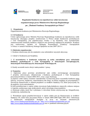 MINISTERSTWO ROZWOJU REGIONALNEGO Regulamin Konkursu na najciekawszy szlak turystyczny organizowanego przez Ministerstwo Rozwoju Regionalnego pn. „Śladami Funduszy Europejskich po Polsce” 1. Organizator Organizatorem konkursu jest Ministerstwo Rozwoju Regionalnego. 2. Cel konkursu Celem ogłoszonego przez Ministra Rozwoju Regionalnego konkursu na najciekawszy szlak turystyczny ukazujący projekty zrealizowane w Polsce dzięki funduszom pochodzącym z Unii Europejskiej, jest popularyzacja wiedzy z tej dziedziny oraz stymulowanie zainteresowania tematyką funduszy unijnych oraz promocja najlepszych projektów. Konkurs jest realizowany zgodnie ze Strategią Komunikacji Funduszy Europejskich w Polsce w ramach Narodowej Strategii Spójności na lata 2007-2013 r. 3. Założenia organizacyjne 1. Konkurs skierowany jest do studentów oraz miłośników turystyki aktywnej. 2. Udział w Konkursie jest bezpłatny. 3. Z uczestnictwa w konkursie wyłączone są osoby zatrudnione przy wdrażaniu funduszy pochodzących z Unii Europejskiej w Instytucjach Zarządzających, Instytucjach Pośredniczących, Instytucjach Wdrażających. 4. Każdy uczestnik może złożyć maksymalnie 1 pracę. 4. Tematyka 1. Zgłaszane prace powinny przedstawiać opis szlaku zawierającego przynajmniej 3 projekty (inwestycje), sfinansowane z funduszy pochodzących z Unii Europejskiej przyznanych Polsce w latach 2004-2013, wraz z jego ilustracją; a) poprzez szlak należy rozumieć samodzielnie wyznaczoną przez uczestnika konkursu trasę (pieszą, rowerową, kajakową, samochodową lub inną), na której znajdują się przynajmniej 3 inwestycje finansowane w ramach projektów ze środków funduszy UE, które przyczyniły się do poprawy życia mieszkańców, b) jeśli przedstawiane w opisie szlaku inwestycje będą dodatkowo stanowiły ciekawe miejsca w regionie, podnoszące jego atrakcyjność, prace otrzymają więcej punktów, c) ilustracja szlaku może być wykonana w dowolnej formie artystycznej np. fotograficznej, rysunkowej, malarskiej itp. 2. Warunkiem ujęcia projektu/inwestycji w opisie szlaku jest jej finansowanie ze środków funduszy UE, które były przyznane Polsce w latach 2004-2006 bądź 2007-2013. Informacje o funduszach europejskich dostępne są m.in. na stronach internetowych http://www.funduszeeuropejskie.gov.pl, http://www.funduszestrukturalne.gov.pl, http://www.mapa.funduszestrukturalne.gov.pl oraz w punktach informacyjnych. 3. Wybór projektu/inwestycji, do ujęcia na opisywanym szlaku, nie jest ograniczony tematycznie ani terytorialnie, opisywane inwestycje mogą dotyczyć dowolnej tematyki (np.: opis drogi, opis oczyszczalni ścieków, opis wyremontowanego zabytku) i być realizowane na dowolnym terenie (np. na terenie gminy, powiatu, województwa, bądź całego kraju). 4. Opis każdej następnej inwestycji (powyżej trzech) zwiększy ilość przyznanych punktów. 5. Dodatkowo punktowane jest również oryginalne i ciekawe ujęcie tematu. 5. Zgłaszanie prac 1. Prace na konkurs należy złożyć w formie papierowej i elektronicznej wraz z wypełnionym i podpisanym formularzem zgłoszeniowym stanowiącym załącznik nr 1 do Regulaminu, w Kancelarii Ministerstwa Rozwoju Regionalnego, ul. Wspólna 2/4 w godz. 8:15 - 16:15 lub wysłać na adres do korespondencji: Ministerstwo Rozwoju Regionalnego Departament Koordynacji i Wdrażania Programów Regionalnych ul. Wspólna 2/4 00-926 Warszawa z dopiskiem na kopercie „Konkurs - Śladami Funduszy Europejskich po Polsce” 2. Termin nadsyłania prac upływa 15 listopada 2010 r. (decyduje data stempla pocztowego). 3. Prace nadesłane po terminie nie będą rozpatrywane. 4. Prace zgłoszone na konkurs nie będą zwracane. 5. Nadesłane prace stają się własnością organizatora. 6. Na organizatora z chwilą otrzymania prac, przechodzą nieodpłatnie autorskie prawa majątkowe do tych prac, na następujących polach eksploatacji: a) utrwalanie i zwielokrotnienie każdą znaną techniką, w szczególności techniką drukarską, fotograficzną, reprograficzną, cyfrową (w tym w drodze skanowania i wydruku cyfrowego), filmową; b) wprowadzenie do obrotu, najem, użyczenie oryginału oraz egzemplarzy; c) publiczne wystawienie, wyświetlenie, nadanie, emitowanie oraz publiczne udostępnienie utworu w taki sposób, aby każdy mógł mieć do niego dostęp w miejscu i czasie przez siebie wybranym;. wskazanych w art. 50 ustawy z dnia 4 lutego 1994 r. o prawie autorskim i prawach pokrewnych (Dz. U. z 2006 r. Nr 90, poz. 631 z późn. zm.). 6. Ocena prac 1. W celu przeprowadzenia konkursu powołuje się Komisję Konkursową w składzie: a) Przewodniczący delegowany przez Instytucję Koordynującą Programy Rozwoju Regionalnego, b) Członkowie wyznaczeni przez Przewodniczącego Komisji z ww. Instytucji Koordynującej oraz np. innych instytucji zaangażowanych w realizację Programów, organizacji turystycznych czy innych instytucji zewnętrznych, c) Sekretarz Komisji delegowany z Instytucji Koordynującej Programy Rozwoju Regionalnego. 2. Zadaniem Komisji Konkursowej jest: a) kwalifikacja do oceny nadesłanych prac, b) ocena nadesłanych prac, c) przyznanie nagród. 3. Komisja, ocenia nadesłane prace, przyznając im określoną ilość punktów, wg następujących kryteriów oceny: a) formalnych: - czy praca została złożona w terminie, - czy praca została złożona w wersji papierowej i elektronicznej, - czy praca zawiera opis co najmniej 3 inwestycji finansowanych z funduszy Unii Europejskiej przyznanych Polsce w latach 2004-2013, - czy do opisu szlaku dołączone są ilustracje inwestycji - czy do pracy dołączony został podpisany przez uczestnika formularz zgłoszeniowy. b) merytorycznych: - czy inwestycja przyczyniła się do poprawy życia mieszkańców, - czy inwestycja stanowi ciekawe miejsce i podnosi atrakcyjność regionu, - czy opis szlaku jest ciekawy (jakość stylu i języka, pomysłowość, oryginalność). 4. Decyzje Komisji Konkursowej 