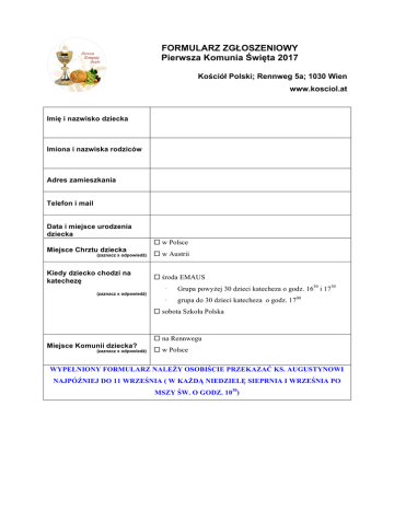 FORMULARZ ZGŁOSZENIOWY Pierwsza Komunia Święta 2017 Kościół Polski; Rennweg 5a; 1030 Wien www.kosciol.at Imię i nazwisko dziecka Imiona i nazwiska rodziców Adres zamieszkania Telefon i mail Data i miejsce urodzenia dziecka ! w Polsce Miejsce Chrztu dziecka (zaznacz x odpowiedź) Kiedy dziecko chodzi na katechezę ! w Austrii ! środa EMAUS • Grupa powyżej 30 dzieci katecheza o godz. 1630 i 1730 • grupa do 30 dzieci katecheza o godz. 1700 (zaznacz x odpowiedź) ! sobota Szkoła Polska ! na Rennwegu Miejsce Komunii dziecka? (zaznacz x odpowiedź) ! w Polsce WYPEŁNIONY FORMULARZ NALEŻY OSOBIŚCIE PRZEKAZAĆ KS. AUGUSTYNOWI NAJPÓŹNIEJ DO 11 WRZEŚNIA ( W KAŻDĄ NIEDZIELĘ SIEPRNIA I WRZEŚNIA PO MSZY ŚW. O GODZ. 1030)