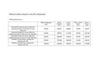 Podatki od środków transportu w roku 2012 w Białogardzie Tabela porównawcza Samochód ciężarowy (masa całkowita pojazdu powyżej 3,5 tony do 5,5 tony włącznie) Samochód ciężarowy (masa całkowita pojazdu powyżej 5,5 tony do 9 ton włącznie) Samochód ciężarowy (masa całkowita pojazdu powyżej 9 tony do 12 ton włącznie) Autobusy (liczba miejsc siedzących – mniejsza niż 30) Autobusy (liczba miejsc siedzących – mniejsza niż 30) Miasto Białogard 2012 Gmina Białogard 2011 Gmina Tychowo 2011 Miasto i Gmina Karlino 2011 Miasto Świdwin 2011 589,00 600,00 660,00 720,00 740,00 820,00 800,00 1110,00 790,00 1235,00 936,00 1000,00 1340,00 976,00 1482,00 820,00 1700,00 1600,00 914,00 801,00 1569,00 2200,00 1980,00 1928,00 1738,00