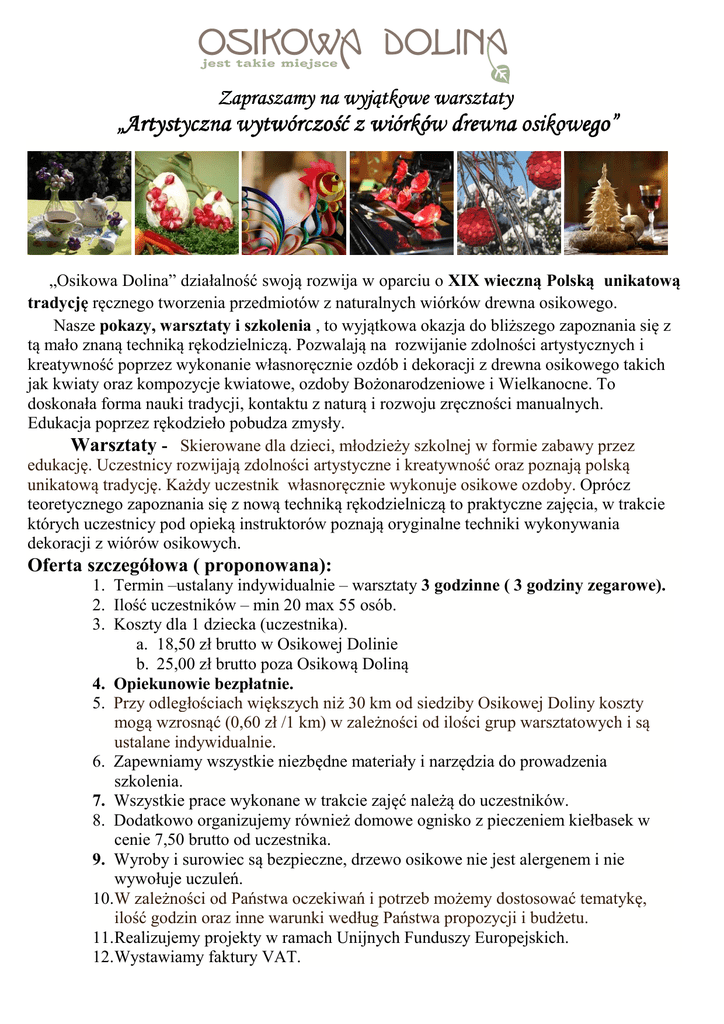 Zapraszamy na wyjątkowe warsztaty „Artystyczna wytwórczość z wiórków wiórków drewna osikowego” osikowego” „Osikowa Dolina” działalność swoją rozwija w oparciu o XIX wieczną Polską unikatową tradycję ręcznego tworzenia przedmiotów z naturalnych wiórków drewna osikowego. Nasze pokazy, warsztaty i szkolenia , to wyjątkowa okazja do bliższego zapoznania się z tą mało znaną techniką rękodzielniczą. Pozwalają na rozwijanie zdolności artystycznych i kreatywność poprzez wykonanie własnoręcznie ozdób i dekoracji z drewna osikowego takich jak kwiaty oraz kompozycje kwiatowe, ozdoby Bożonarodzeniowe i Wielkanocne. To doskonała forma nauki tradycji, kontaktu z naturą i rozwoju zręczności manualnych. Edukacja poprzez rękodzieło pobudza zmysły. Warsztaty - Skierowane dla dzieci, młodzieży szkolnej w formie zabawy przez edukację. Uczestnicy rozwijają zdolności artystyczne i kreatywność oraz poznają polską unikatową tradycję. Każdy uczestnik własnoręcznie wykonuje osikowe ozdoby. Oprócz teoretycznego zapoznania się z nową techniką rękodzielniczą to praktyczne zajęcia, w trakcie których uczestnicy pod opieką instruktorów poznają oryginalne techniki wykonywania dekoracji z wiórów osikowych. Oferta szczegółowa ( proponowana): 1. Termin –ustalany indywidualnie – warsztaty 3 godzinne ( 3 godziny zegarowe). 2. Ilość uczestników – min 20 max 55 osób. 3. Koszty dla 1 dziecka (uczestnika). a. 18,50 zł brutto w Osikowej Dolinie b. 25,00 zł brutto poza Osikową Doliną 4. Opiekunowie bezpłatnie. 5. Przy odległościach większych niż 30 km od siedziby Osikowej Doliny koszty mogą wzrosnąć (0,60 zł /1 km) w zależności od ilości grup warsztatowych i są ustalane indywidualnie. 6. Zapewniamy wszystkie niezbędne materiały i narzędzia do prowadzenia szkolenia. 7. Wszystkie prace wykonane w trakcie zajęć należą do uczestników. 8. Dodatkowo organizujemy również domowe ognisko z pieczeniem kiełbasek w cenie 7,50 brutto od uczestnika. 9. Wyroby i surowiec są bezpieczne, drzewo osikowe nie jest alergenem i nie wywołuje uczuleń. 10.W zależności od Państwa oczekiwań i potrzeb możemy dostosować tematykę, ilość godzin oraz inne warunki według Państwa propozycji i budżetu. 11.Realizujemy projekty w ramach Unijnych Funduszy Europejskich. 12.Wystawiamy faktury VAT. Wariant I Warsztaty 3 godziny – tematyka całoroczna Uczestnicy szkolenia wykonają następujące dekoracje: 1. Osikowy koszyk Stokrotek 2. Osikowa zakładka do książki Wariant II Warsztaty 3 godziny – tematyka całoroczna Uczestnicy szkolenia wykonają następujące dekoracje: 1. Osikowy Aniołek 2. Osikowy Kotek Wariant III Warsztaty 3 godziny – tematyka Święta Bożego Narodzenia Uczestnicy szkolenia wykonają następujące dekoracje: 1. Bombka Obiata 2. Osikowa Gwiazdka Wariant IV Warsztaty 3 godziny – tematyka Święta Bożego Narodzenia Uczestnicy szkolenia wykonają następujące dekoracje: 1. Osikową Choinkę 2. Kartkę Świąteczną Wariant V Warsztaty 3 godziny – tematyka Święta Bożego Narodzenia Uczestnicy szkolenia wykonają następujące dekoracje: 1. Osikowy Dzwonek 2. Osikowa Gwiazdka Zapraszamy do współpracy. Roman Noszczyk 42-350 Koziegłowy, ul. Żarecka 52, Tel. +48 34 366-14-95, 601-933-445 www.osikowadolina.pl, [email protected]