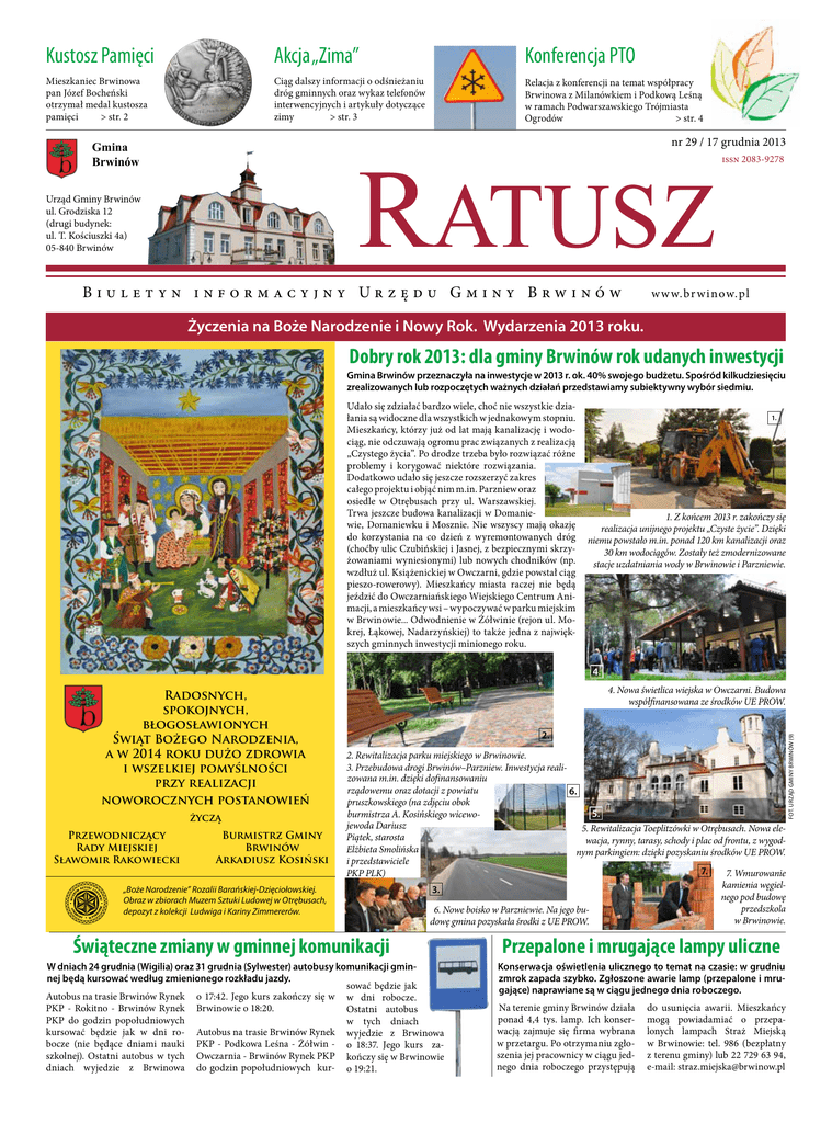Kustosz Pamięci Akcja „Zima” Konferencja PTO Mieszkaniec Brwinowa pan Józef Bocheński otrzymał medal kustosza pamięci > str. 2 Ciąg dalszy informacji o odśnieżaniu dróg gminnych oraz wykaz telefonów interwencyjnych i artykuły dotyczące zimy > str. 3 Relacja z konferencji na temat współpracy Brwinowa z Milanówkiem i Podkową Leśną w ramach Podwarszawskiego Trójmiasta Ogrodów > str. 4 nr 29 / 17 grudnia 2013 RAtusz Gmina Brwinów Urząd Gminy Brwinów ul. Grodziska 12 (drugi budynek: ul. T. Kościuszki 4a) 05-840 Brwinów Biuletyn informacyjny Urzędu Gminy Brwinów issn 2083-9278 w w w. br w i now. pl Życzenia na Boże Narodzenie i Nowy Rok. Wydarzenia 2013 roku. Dobry rok 2013: dla gminy Brwinów rok udanych inwestycji Gmina Brwinów przeznaczyła na inwestycje w 2013 r. ok. 40% swojego budżetu. Spośród kilkudziesięciu zrealizowanych lub rozpoczętych ważnych działań przedstawiamy subiektywny wybór siedmiu. Udało się zdziałać bardzo wiele, choć nie wszystkie działania są widoczne dla wszystkich w jednakowym stopniu. Mieszkańcy, którzy już od lat mają kanalizację i wodociąg, nie odczuwają ogromu prac związanych z realizacją „Czystego życia”. Po drodze trzeba było rozwiązać różne problemy i korygować niektóre rozwiązania. Dodatkowo udało się jeszcze rozszerzyć zakres całego projektu i objąć nim m.in. Parzniew oraz osiedle w Otrębusach przy ul. Warszawskiej. Trwa jeszcze budowa kanalizacji w Domaniewie, Domaniewku i Mosznie. Nie wszyscy mają okazję do korzystania na co dzień z wyremontowanych dróg (choćby ulic Czubińskiej i Jasnej, z bezpiecznymi skrzyżowaniami wyniesionymi) lub nowych chodników (np. wzdłuż ul. Książenickiej w Owczarni, gdzie powstał ciąg pieszo-rowerowy). Mieszkańcy miasta raczej nie będą jeździć do Owczarniańskiego Wiejskiego Centrum Animacji, a mieszkańcy wsi – wypoczywać w parku miejskim w Brwinowie... Odwodnienie w Żółwinie (rejon ul. Mokrej, Łąkowej, Nadarzyńskiej) to także jedna z największych gminnych inwestycji minionego roku. 1. 1. Z końcem 2013 r. zakończy się realizacja unijnego projektu „Czyste życie”. Dzięki niemu powstało m.in. ponad 120 km kanalizacji oraz 30 km wodociągów. Zostały też zmodernizowane stacje uzdatniania wody w Brwinowie i Parzniewie. 4. życzą Przewodniczący Rady Miejskiej Sławomir Rakowiecki Burmistrz Gminy Brwinów Arkadiusz Kosiński „Boże Narodzenie” Rozalii Barańskiej-Dzięciołowskiej. Obraz w zbiorach Muzem Sztuki Ludowej w Otrębusach, depozyt z kolekcji Ludwiga i Kariny Zimmererów. 4. Nowa świetlica wiejska w Owczarni. Budowa współfinansowana ze środków UE PROW. 2. 2. Rewitalizacja parku miejskiego w Brwinowie. 3. Przebudowa drogi Brwinów–Parzniew. Inwestycja realizowana m.in. dzięki dofinansowaniu rządowemu oraz dotacji z powiatu 6. pruszkowskiego (na zdjęciu obok 5. burmistrza A. Kosińskiego wicewojewoda Dariusz 5. Rewitalizacja Toeplitzówki w Otrębusach. Nowa elePiątek, starosta wacja, rynny, tarasy, schody i plac od frontu, z wygodElżbieta Smolińska nym parkingiem: dzięki pozyskaniu środków UE PROW. i przedstawiciele 7. PKP PLK) 7. Wmurowanie kamienia węgiel3. nego pod budowę przedszkola 6. Nowe boisko w Parzniewie. Na jego buw Brwinowie. dowę gmina pozyskała środki z UE PROW. Świąteczne zmiany w gminnej komunikacji W dniach 24 grudnia (Wigilia) oraz 31 grudnia (Sylwester) autobusy komunikacji gminnej będą kursować według zmienionego rozkładu jazdy. sować będzie jak Autobus na trasie Brwinów Rynek o 17:42. Jego kurs zakończy się w w dni robocze. PKP - Rokitno - Brwinów Rynek Brwinowie o 18:20. Ostatni autobus PKP do godzin popołudniowych w tych dniach kursować będzie jak w dni ro- Autobus na trasie Brwinów Rynek wyjedzie z Brwinowa bocze (nie będące dniami nauki PKP - Podkowa Leśna - Żółwin - o 18:37. Jego kurs zaszkolnej). Ostatni autobus w tych Owczarnia - Brwinów Rynek PKP kończy się w Brwinowie dniach wyjedzie z Brwinowa do godzin popołudniowych kur- o 19:21. Przepalone i mrugające lampy uliczne Konserwacja oświetlenia ulicznego to temat na czasie: w grudniu zmrok zapada szybko. Zgłoszone awarie lamp (przepalone i mrugające) naprawiane są w ciągu jednego dnia roboczego. Na terenie gminy Brwinów działa ponad 4,4 tys. lamp. Ich konserwacją zajmuje się firma wybrana w przetargu. Po otrzymaniu zgłoszenia jej pracownicy w ciągu jednego dnia roboczego przystępują do usunięcia awarii. Mieszkańcy mogą powiadamiać o przepalonych lampach Straż Miejską w Brwinowie: tel. 986 (bezpłatny z terenu gminy) lub 22 729 63 94, e-mail: [email protected] FOT. URZĄD GMINY BRWINÓW (9) Radosnych, spokojnych, błogosławionych Świąt Bożego Narodzenia, a w 2014 roku dużo zdrowia i wszelkiej pomyślności przy realizacji noworocznych postanowień 2 ratusz Biuletyn informacyjny Urzędu Gminy Brwinów nr 29 17 grudnia 2013 R „ FOT. MARTYNA JÓZEFIAK - WCEO Chodnik w tunelu: nadzieja na remont FOT. URZĄD GMINY BRWINÓW Egzamin zdany pomyślnie! Certyfikaty dla gminy Brwinów „ ozwiązanie problemu zalewania tunelu w Brwinowie (czy ktoś jeszcze pamięta, że do 2010 roku po kilkanaście razy rocznie tunel bywał zalewany i nieprzejezdny?) to była betka w porównaniu z rozwikłaniem węzła gordyjskiego, jakim był stan własnościowy gruntu wzdłuż chodnika od ronda do Rynku... Udało się! - Arkadiusz Kosiński, burmistrz gminy Brwinów Kustosz pamięci historycznej „Gmina Fair Play” oraz „Samorządowy Lider Edukacji” to tytuły przyznawane w programach certyfikacyjnych. Niezależni eksperci, powołani przez Krajową Izbę Gospodarczą oraz Fundację Rozwoju Edukacji i Szkolnictwa Wyższego, pozytywnie ocenili działania gminy Brwinów. K oniec roku to okazja do podsumowań oraz nagród. Gala w Sali Kongresowej w dniu 6 grudnia była podsumowaniem tegorocznej edycji prestiżowego programu Gmina Fair Play. Certyfikat z rąk Olgierda Dziekońs