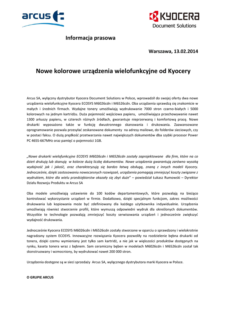 Informacja prasowa Warszawa, 13.02.2014 Nowe kolorowe urządzenia wielofunkcyjne od Kyocery Arcus SA, wyłączny dystrybutor Kyocera Document Solutions w Polsce, wprowadził do swojej oferty dwa nowe urządzenia wielofunkcyjne Kyocera ECOSYS M6026cdn i M6526cdn. Oba urządzenia sprawdzą się znakomicie w małych i średnich firmach. Wydajne tonery umożliwiają wydrukowanie 7000 stron czarno-białych i 5000 kolorowych na jednym kartridżu. Duża pojemność wejściowa papieru, umożliwiająca przechowywanie nawet 1300 arkuszy papieru, w czterech różnych źródłach, gwarantuje nieprzerwaną i komfortową pracę. Nowe drukarki wyposażono także w funkcję dwustronnego skanowania i drukowania. Zaawansowane oprogramowanie pozwala przesyłać zeskanowane dokumenty na adresy mailowe, do folderów sieciowych, czy w postaci faksu. O dużą prędkość przetwarzania nawet największych dokumentów dba szybki procesor Power PC 465S-667MHz oraz pamięć o pojemności 1GB. „Nowe drukarki wielofunkcyjne ECOSYS M6026cdn i M6526cdn zostały zaprojektowane dla firm, które na co dzień drukują lub skanują w kolorze dużą liczbę dokumentów. Nowe urządzenia gwarantują zarówno wysoką wydajność jak i jakość, oraz charakteryzują się bardzo łatwą obsługą, znaną z innych modeli Kyocery. Jednocześnie, dzięki zastosowaniu nowoczesnych rozwiązań, urządzenia pomagają zmniejszyć koszty związane z wydrukiem, które dla wielu przedsiębiorstw okazały się zbyt duże” – powiedział Łukasz Rumowski – Dyrektor Działu Rozwoju Produktu w Arcus SA Oba modele umożliwiają ustawienie do 100 kodów departamentowych, które pozwalają na bieżąco kontrolować wykorzystanie urządzeń w firmie. Dodatkowo, dzięki specjalnym funkcjom, zakres możliwości drukowania lub kopiowania może być zdefiniowany dla każdego użytkownika indywidualnie. Urządzenia umożliwiają również stworzenie profili, które wymuszą odpowiedni wydruk dla określonych dokumentów. Wszystkie te technologie pozwalają zmniejszyć koszty serwisowania urządzeń i jednocześnie zwiększyć wydajność drukowania. Jednocześnie Kyocera ECOSYS M6026cdn i M6526cdn zostały stworzone w oparciu o sprawdzony i wielokrotnie nagradzany system ECOSYS. Innowacyjne rozwiązania Kyocera pozwoliły na rozdzielenie bębna drukarki od tonera, dzięki czemu wymieniany jest tylko sam kartridż, a nie jak w większości produktów dostępnych na rynku, kaseta tonera wraz z bębnem. Sam ceramiczny bęben w modelach M6026cdn i M6526cdn został tak skonstruowany i wzmocniony, by wydrukować nawet 200 000 stron. Urządzenia dostępne są w sieci sprzedaży Arcus SA, wyłącznego dystrybutora marki Kyocera w Polsce. O GRUPIE ARCUS ARCUS SA jest jednym z największych na polskim rynku dostawców zintegrowanych systemów zarządzania dokumentem i korespondencją masową. ARCUS SA jest przedstawicielem Kyocera Document Solutions oraz Pitney Bowes w Polsce. ARCUS SA i spółka zależna T-matic Systems SA dostarczają również kompleksowe rozwiązania oraz usługi z zakresu telematyki i inteligentnych sieci, a także integracji rozwiązań ICT (technologie informacyjno-telekomunikacyjne). Trzecią spółką wchodzącą w skład GRUPY ARCUS jest DocuSoft Sp. z o.o. produkująca systemy do obiegu informacji. Do największych klientów GRUPY ARCUS należą banki, firmy ubezpieczeniowe, firmy z branży telekomunikacyjnej, operatorzy pocztowi i logistyczni oraz administracja publiczna na szczeblu centralnym i lokalnym. O KYOCERA Document Solutions Europe B.V. KYOCERA Document Solutions jest jednym z wiodących na świecie dostawców rozwiązań z zakresu zarządzaniem dokumentami. Zakres produktów i usług firmy obejmuje drukarki ECOSYS, niezawodne urządzenia wielofunkcyjne, wysokiej jakości materiały eksploatacyjne i szeroki zakres rozwiązań programowych i Managed Services Document (MDS). Oferta KYOCERA Document Solutions zawiera innowacyjne produkty z komponentami o długiej żywotności. Ich użytkownicy korzystają z niskiego całkowitego kosztu posiadania (TCO) rozwiązań oraz wysokiej wydajności w każdym miejscu pracy. Oferta rozwiązań i usługi Managed Document Services umożliwiają klientom zmniejszenie kosztów, pozytywny wpływ na środowisko oraz poprawę efektywności i niezawodności procesów biznesowych w tym samym czasie. Więcej informacji na stronie: www.kyoceradocumentsolutions.pl. KYOCERA Document Solutions Inc. jest spółką zależną firmy Kyocera Corporation, która w 2009 roku obchodziła swoją 50. rocznicę. Zajmująca 492 miejsce na liście 2000 największych światowych firm notowanych na giełdzie magazynu Forbes, Kyocera jest wiodącym producentem nowoczesnej ceramiki, komponentów elektronicznych, ogniw słonecznych i elektronicznego sprzętu biurowego. Długoterminową strategią wzrostu KYOCERA są działania wspierające sektory telekomunikacji, przetwarzanie informacji, ochrony środowiska oraz poprawy jakości życia. Kontakt dla mediów: Michał Gembal Dyrektor Marketingu ARCUS SA tel. (22) 53 60 900 e-mail: [email protected]