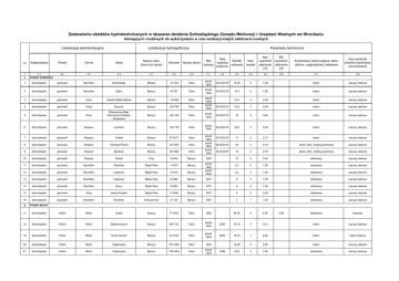 Zestawienie obiektów hydrotechnicznych w obszarze działania Dolnośląskiego Zarządu Melioracji i Urządzeń Wodnych we Wrocławiu Istniejących i możliwych do wykorzystania w celu realizacji małych elektrowni wodnych Lokalizacja administracyjna Lp. 1 I Województwo 2.1 POWIAT GÓROWSKI Lokalizacja hydrograficzna Parametry techniczne Ilość świateł Max wysokość piętrzenia (m) Min wysokość piętrzenia (m) Konstrukcja: beton;ceglana; beton oblicow. cegłą,dokowa; żelbetowa Opis zamknięć (również zamknięcia remontowane) 4.3 4.4 4.5 4.6 4.7 4.8 Data Światło ostatniej całkowite moderniz. Powiat Gmina Adres Nazwa cieku, zbiorn.lub kanału Kilometr Nazwa zlewni Rok budowy 2.2 2.3 2.4 3.1 3.2 3.3 4.1 4.2 1 dolnośląskie górowski Niechlów Bartodzieje Barycz 5+120 Odra przed 1945 2014/2015 14,25 3 1,50 beton zasuwy stalowe 2 dolnośląskie górowski Niechlów Żabin Barycz 8+767 Odra przed 1945 2014/2015 14,4 2 1,80 beton zasuwy stalowe 3 dolnośląskie górowski Góra Osetno Małe-Kietlów Barycz 13+685 Odra 15,3 3 2,50 beton zasuwy stalowe 4 dolnośląskie górowski Góra Ryczeń Barycz 20+795 Odra Barycz 26+160 przed 1945 przed 1945 2014/2015 15,0 3 2,00 beton zasuwy stalowe Odra przed 1945 2014/2015 15 3 3,60 beton zasuwy stalowe przed 1945 2014/2015 16,5 3 4,00 beton zasuwy stalowe 2014/2015 11 2 2,10 beton zasuwy stalowe 2014/2015 10 2 2,10 beton oblic. kostką granitową zasuwy stalowe 2014/2015 10 2 2,10 beton oblic. kostką granitową zasuwy stalowe 10 2 2,40 żelbetowy zasuwy stalowe 2,4 2 1,50 żelbetowy zasuwy stalowe 2,4 2 1,30 żelbetowy zasuwy stalowe 5 dolnośląskie górowski Góra Wierzowice Małe, Wierzowice Wielkie, Grabowno 6 dolnośląskie górowski Wąsosz Lechitów Barycz 30+778 Odra 7 dolnośląskie górowski Wąsosz Pobiel Barycz 37+677 Odra 8 dolnośląskie górowski Wąsosz Ostrawa-Pobiel Barycz 42+345 Odra 9 dolnośląskie górowski Wąsosz Bartków Barycz 46+388 Odra 10 dolnośląskie górowski Wąsosz Pobiel Orla 5+038 Barycz przed 1945 przed 1945 przed 1945 1993 przed 1945 przed 1945 11 dolnośląskie górowski Niechlów Niechlów Śląski Rów 1+870 Barycz 12 dolnośląskie górowski Niechlów Łękanów Śląski Rów 3+570 Barycz 13 dolnośląskie górowski Niechlów Łękanów Śląski Rów 6+280 Barycz 1975 6 2 1,45 żelbetowy zasuwy stalowe 14 dolnośląskie górowski Niechlów Siciny Śląski Rów 9+680 Barycz 1975 6 2 1,80 żelbetowy zasuwy stalowe 15 dolnośląskie górowski Góra Nowa Wioska Śląski Rów 13+880 Barycz 1975 6 2 2,00 żelbetowy zasuwy stalowe 16 dolnośląskie górowski Niechlów Niechlów Wiewiernica 2+136 Barycz 1987 3 1 1,20 żelbetowy zasuwy stalowe II POWIAT MILICKI 17 dolnośląskie milicki Milicz Sułów Barycz 77+635 Odra 1982 24,00 4 4,60 żelbetowa klapowe 18 dolnośląskie milicki Milicz Sławoszowice Barycz 89+733 Odra przed 1945 2000 15,10 3 3,51 beton zasuwy stalowe 19 dolnośląskie milicki Milicz Nowy Zamek Barycz 97+345 Odra przed 1945 2000 16,70 1 2,00 beton walec stalowy 20 dolnośląskie milicki Milicz Gądkowice Barycz 101+850 Odra 1970 12,00 3 2,50 beton zasuwy stalowe 21 dolnośląskie milicki Milicz Gądkowice Barycz 105+625 Odra przed 1945 9,00 3 1,60 żelbetowa zasuwy stalowe 1996 3,90 22 dolnośląskie milicki Milicz Wróbliniec Barycz 109+000 Odra 1969 12,00 3 1,60 żelbetowa zasuwy stalowe 2014/2015 11,40 6 2,79 betonowo-ceglana zasuwy drewniane 2014/2015 10,50 5 0,93 betonowo-ceglana zasuwy drewniane 5,90 2 0,97 beton zasuwy drewniane 23 dolnośląskie milicki Milicz Ruda Milicka Prądnia 2+560 Barycz przed 1945 24 dolnośląskie milicki Milicz Grabownica Prądnia 6+100 Barycz przed 1945 25 dolnośląskie milicki Milicz Czatkowice Prądnia 10+380 Barycz 26 dolnośląskie milicki Krośnice Kotlarka Prądnia 12+150 Barycz 2,90 2 1,60 beton zasuwy drewniane 27 dolnośląskie milicki Krośnice Kotlarka Prądnia 13+310 Barycz 1968 3,80 4 1,60 beton zasuwy drewniane 3,60 4 beton zasuwy drewniane przed 1945 przed 1945 1984 28 dolnośląskie milicki Krośnice Żeleźniki Prądnia 14+700 Barycz przed 1945 29 dolnośląskie milicki Krośnice Żeleźniki Prądnia 15+250 Barycz przed 1945 4,05 3 0,75 beton zasuwy drewniane 30 dolnośląskie milicki Krośnice Żeleźniki Prądnia 16+080 Barycz przed 1945 4,00 4 1,20 beton zasuwy drewniane 31 dolnośląskie milicki Krośnice Brzostawa Prądnia 18+430 Barycz przed 1945 2,85 3 1,06 beton zasuwy drewniane 32 dolnośląskie milicki Krośnice Brzostawa Prądnia 19+860 Barycz przed 1945 4,00 4 1,55 beton zasuwy stalowe 33 dolnośląskie milicki Krośnice Lędziny Prądnia 20+930 Barycz przed 1945 3,00 3 1,88 beton zasuwy drewniane 34 dolnośląskie milicki Krośnice Grabownica Prądnia II 0+100 Barycz 3,80 4 1,20 beton zasuwy drewniane 35 dolnośląskie milicki Krośnice Grabownica Prądnia II 1+220 Barycz 3,80 4 1,00 beton zasuwy drewniane 36 dolnośląskie milicki Krośnice Grabownica Prądnia II 2+130 Barycz 4,00 4 1,20 beton zasuwy stalowe 37 dolnośląskie milicki Krośnice Grabownica Prądnia II 3+025 Barycz 3,60 3 1,50 beton zasuwy drewniane 38 dolnośląskie milicki Krośnice Brzostawa Prądnia II 3+470 Barycz 3,60 3 1,00 beton zasuwy stalowe 39 dolnośląskie milicki Krośnice Brzostawa Prądnia II 4+670 Barycz 3,60 3 1,00 beton zasuwy stalowe 40 dolnośląskie milicki Krośnice Brzostawa Prądnia II 5+260 Barycz 3,00 2 1,00 beton zasuwy drewniane 41 dolnośląskie milicki Krośnice Brzostawa Prądnia II 5+780 Barycz 3,00 3 1,26 beton zasuwy drewniane 42 dolnośląskie milicki Krośnice Luboradów Grabownica 2+940 Barycz 3,80 2 1,20 beton zasuwy drewniane 3,90 3 beton zasuwy drewniane 3,00 1 0,97 beton zasuwy drewniane przed 1945 przed 1945 przed 1945 przed 1945 przed 1945 przed 1945 przed 1945 przed 1945 1990 przed 1945 przed 1945 43 dolnośląskie milicki Krośnice Grabownica Grabownica 3+880 Barycz 44 dolnośląskie milicki Krośnice Grabownica Grabownica 4+390 Barycz 45 dolnośląskie milicki Milicz Potasznia Rybnica 1+822 Barycz przed 1945 6,