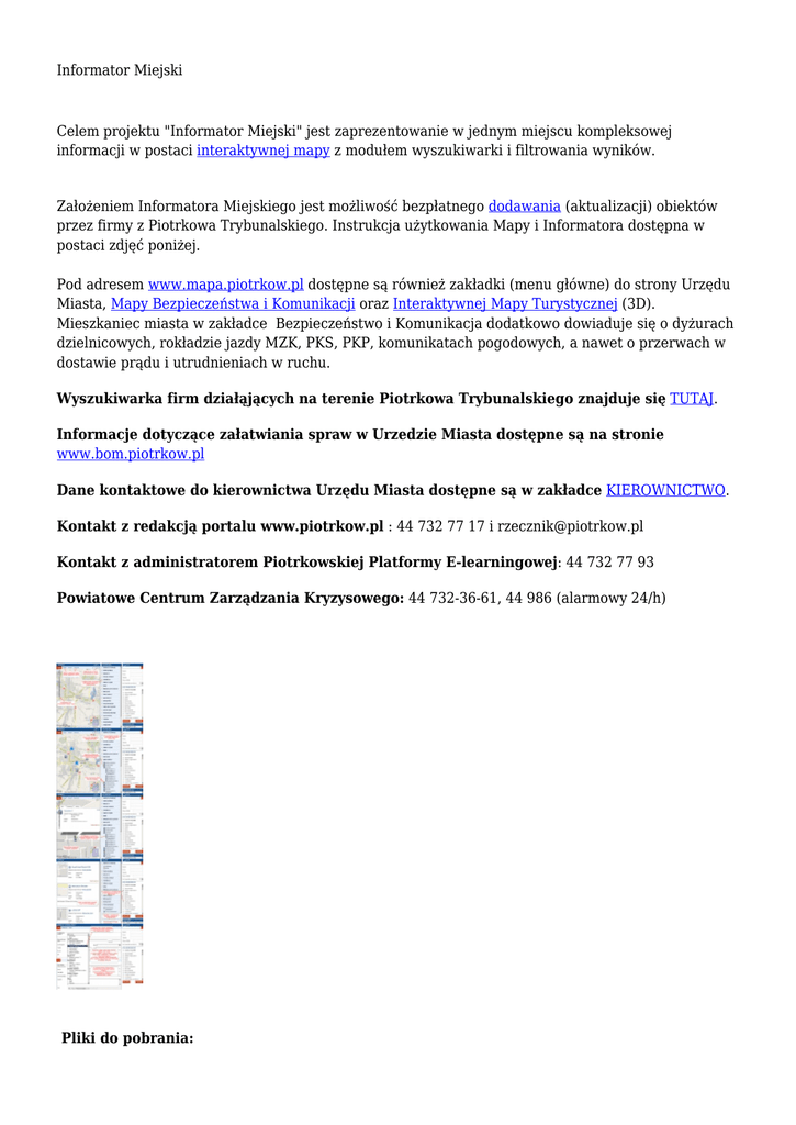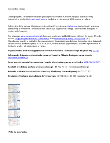 Informator Miejski Celem projektu "Informator Miejski" jest zaprezentowanie w jednym miejscu kompleksowej informacji w postaci interaktywnej mapy z modułem wyszukiwarki i filtrowania wyników. Założeniem Informatora Miejskiego jest możliwość bezpłatnego dodawania (aktualizacji) obiektów przez firmy z Piotrkowa Trybunalskiego. Instrukcja użytkowania Mapy i Informatora dostępna w postaci zdjęć poniżej. Pod adresem www.mapa.piotrkow.pl dostępne są również zakładki (menu główne) do strony Urzędu Miasta, Mapy Bezpieczeństwa i Komunikacji oraz Interaktywnej Mapy Turystycznej (3D). Mieszkaniec miasta w zakładce Bezpieczeństwo i Komunikacja dodatkowo dowiaduje się o dyżurach dzielnicowych, rokładzie jazdy MZK, PKS, PKP, komunikatach pogodowych, a nawet o przerwach w dostawie prądu i utrudnieniach w ruchu. Wyszukiwarka firm działąjących na terenie Piotrkowa Trybunalskiego znajduje się TUTAJ. Informacje dotyczące załatwiania spraw w Urzedzie Miasta dostępne są na stronie www.bom.piotrkow.pl Dane kontaktowe do kierownictwa Urzędu Miasta dostępne są w zakładce KIEROWNICTWO. Kontakt z redakcją portalu www.piotrkow.pl : 44 732 77 17 i [email protected] Kontakt z administratorem Piotrkowskiej Platformy E-learningowej: 44 732 77 93 Powiatowe Centrum Zarządzania Kryzysowego: 44 732-36-61, 44 986 (alarmowy 24/h) Pliki do pobrania: Ścieżki rowerowe w Piotrkowie (mapa 2013) Strefa płatnego parkowania (mapa 2013) tagi: strefa płatnego parkowania, mapy Piotrków, informator miejski, ścieżki rowerowe, przerwy w dostawie prądu, kontakty, teleadresowe, redakcja, platforma elearningowa,