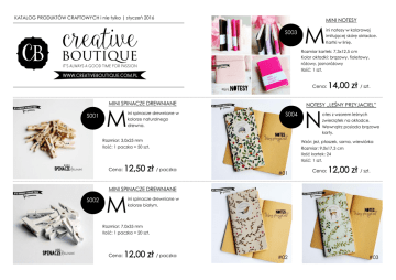 KATALOG PRODUKTÓW CRAFTOWYCH i nie tylko | styczeń 2016 S003 M MINI NOTESY ini notesy w kolorowej imitującej skórę okładce. Kartki w linię. Rozmiar kartek: 7,3x12,5 cm Kolor okładki: brązowy, fioletowy, różowy, jasnoróżowy Ilość: 1 szt. Cena: MINI SPINACZE DREWNIANE S001 M ini spinacze drewniane w kolorze naturalnego drewna. NOTESY „LEŚNY PRZYJACIEL” S004 Rozmiar: 3,0x25 mm Ilość: 1 paczka = 50 szt. Cena: 12,50 zł / paczka 14,00 zł / szt. N otes z wzorem leśnych zwierzątek na okładce. Wewnątrz posiada brązowe karty. Wzór: jeż, ptaszek, sarna, wiewiórka Rozmiar: 9,0x17,3 cm Ilość kartek: 24 Ilość: 1 szt. #01 Cena: 12,00 zł / szt. MINI SPINACZE DREWNIANE S002 M ini spinacze drewniane w kolorze białym. Rozmiar: 7,0x35 mm Ilość: 1 paczka = 20 szt. Cena: 12,00 zł / paczka #02 #03 S006 N NAKLEJKI aklejki z napisami na przezroczystej folii. Zestaw zawiera 8 arkuszy: 4 w kolorze czarno-białym i 4 kolorowe. Rozmiar arkusza: 10x16 cm Ilość: 1 zestaw = 8 arkuszy Cena: #04 19,50 zł / zestaw NOTES „ZIMOWY SWETER” S005 N otes z wzorem przypominającym ścieg zimowego swetra. Wewnątrz posiada brązowe karty. Trzy wzory. Rozmiar: 9,0x17,3 cm Ilość kartek: 24 Ilość: 1 szt. #01 Cena: 12,00 zł / szt. STEMPEL DEKORACYJNY S007 S tempel gumowy na drewnianym klocku. Wzór: #01—FOR YOU #02—LOVE #03—THANK YOU Rozmiar: 3,9x2,4 cm Ilość: 1 szt. #02 #03 #01 Cena: 12,00 zł / szt. #02 #03 NAKLEJKI VINTAGE „KWIATY” S008 N aklejki vintage z wzorem kwiatowym (kwiaty w różnych kolorach). Rozmiar naklejki: 4,5x6,5 cm Ilość: 1 zestaw = 52 naklejki Cena: 15,00 zł / zestaw NAKLEJKI „THANK YOU” S009 N aklejki dekoracyjne w trzech różnych kształtach do ozdabiania prezentów , tagów czy karnetów. Rozmiar arkusza: 11,7x15,6 cm Ilość: 1 zestaw = 6 arkuszy (po dwa z każdego rodzaju) Cena: 15,00 zł / zestaw #01 S010 SPINACZE OZDOBNE D rewniane spinacze ozdobne w dwóch motywach: ANIMALS (#01) oraz FOOD (#02) SPINACZE OZDOBNE „MISIE” S012 Rozmiar: 7,0x35 mm Ilość: 1 zestaw = 8 spinaczy + sznurek Cena: D rewniane spinacze ozdobne z motywem misiów. Ilość: 1 zestaw = 14 spinaczy Cena: 10,50 zł / zestaw #02 11,00 zł / zestaw MINI STEMPEL DEKORACYJNY S013 S tempel gumowy na drewnianym klocku. Wzór: # 01—FOR YOU, #02— LOVE, #03—THANK YOU, #04—MY FRIEND, #05—MISS YOU, #06—GOOD LUCK. Rozmiar: 3,0x2,3 cm Ilość: 1 szt. #01 Cena: 7,00 zł / szt. SPINACZE OZDOBNE S011 D rewniane spinacze ozdobne z motywem zwierzątek: misia, pieska oraz króliczka. Ilość: 1 zestaw = 6 spinaczy Cena: 9,50 zł / zestaw #02 #03 S015 S STEMPEL DATOWNIK tempel gumowy z plastikowym uchwytem w kolorze różowym lub białym. Stempluje datę oraz 11 wzorów (w języku angielskim). Rozmiar : 8,0x7,8 cm Ilość: 1 szt. Cena: #04 22,00 zł / szt. #05 #06 MINI STEMPEL DATOWNIK S014 M ini stempel gumowy z plastikowym uchwytem w kolorze zielonym lub różowym. Rozmiar: 3,5x8,0 cm Ilość: 1 szt. Cena: 15,00 zł / szt. S016 SZNUREK OZDOBNY (MIX KOLORÓW) B awełniany sznurek ozdobny ze skręconych pasm. Kolorystyka: niebiesko-fioletowa, zielona, żółto-pomarańczowo-brązowa, różowo-czerwono-bordowa Ilość: 1 zestaw w 1 kolorystyce = 6 kolorów po 7m Cena: 16,00 zł / zestaw #03 #01 #02 #02 #05 #04 #03 #01 S017 #04 ZAKŁADKI SAMOPRZYLEPNE „TO DO LIST” Z akładki samoprzylepne z nadrukiem zwierzątek (kaczuszki, świnki, króliczki, niedźwiadki i pingwiny, owieczki, misie panda). Rozmiar zakładek: 30x70 mm Ilość: 1 zestaw - 4 wzory po 20 szt. Cena: 8,00 zł / zestaw #06 #01 S019 SZNUREK OZDOBNY W SZPULACH B #06 #07 #08 #09 awełniany sznurek ozdobny ze skręconych pasm. Kolory: błękitny, niebieski, czarny, szary, jasnoszary, jasnozielony, zielony, jasnoróżowy, różowy, jasnoróżowo-malinowo-biały Ilość: 1 szpula = 100 m Cena: 28,00 zł / szpula #03 #02 #04 #05 Cena: #10 7,00 zł / 15m #01 S SZKLANE KABOSZONY #06 #07 #08 #09 #10 #11 zklane kaboszony z motywem zegara. Dostępne zestawy po 3,4,5 oraz 6 sztuk. Rozmiar: 18x25 mm 4,50 zł / zestaw 3 szt. Cena: 6,00 zł / zestaw 4 szt. Cena: S020 #03 #02 #04 #05 #12 #13 #18 #19 #20 #21 #15 #14 #16 #17 SZKLANE KABOSZONY 7,50 zł / zestaw 5 szt. Cena: 9,00 zł / zestaw 6 szt. Cena: #22 S021 T TAŚMA DEKORACYJNA BROKATOWA #03 aśma dekoracyjna samoprzylepna brokatowa typu washi w kolorze srebrnym, różowym i ciemnoróżowym. Rozmiar: szerokość 1,5 cm, długość taśmy 5 m. Ilość: 1 sztuka Cena: #01 6,00 zł / szt. #02 #02 T aśma dekoracyjna samoprzylepna papierowa typu washi. Rozmiar: szerokość 1,5 cm. Ilość: 1 sztuka Cena: #01 #05 #06 #07 #03 TAŚMA DEKORACYJNA S022 #04 9,50 zł / szt. #05 #04 #08 S023 TAŚMA DEKORACYJNA CZARNO-BIAŁA T #06 #07 #08 #09 aśma dekoracyjna samoprzylepna typu washi. Rozmiar: szerokość 1,5 cm, długość 10m. Ilość: 1 sztuka #01 #02 Cena: 9,00 zł / szt. #03 #17 #10 #12 #14 #11 #16 #18 #19 #20 #21 #13 #15 Zestaw świąteczny 25,50 zł / 3 szt. S024 TAŚMA DEKORACYJNA CZARNO-BIAŁA T aśma dekoracyjna papierowa samoprzylepna typu washi. METALOWE RAMKI NA ETYKIETY S025 Rozmiar: szerokość 1,5 cm, długość 10m. Rozmiar: 6,0x1,7 cm Kolor: antyczny brąz Ilość: 1 szt. Ilość: 1 sztuka #01 Cena: M etalowe ramki vintage na etykiety. Do ramki dołączone są dwie śrubki. 10,50 zł / szt. Cena: 0,86 zł / szt. TAŚMA DEKORACYJNA S026 T aśma dekoracyjna samoprzylepna papierowa typu washi. Rozmiar: szerokość 1,5 cm, długość 10 m. Ilość: 1 sztuka #02 #04 #03 #01 #02 Cena: 9,00 zł / szt. #03 #04 #10 #05 METALOWE ĆWIEKI S027 M etalowe ćwieki z okrągłą główką. Rozmiar: Ø 5 mm, długość 9 mm Kolor: #01 srebrny, #02 antyczny brąz, #03 biały, #04 czarny Ilość: 1 opakowanie = 25 szt. #06 #07 #01 #08 #09 #02 Cena: 3,50 zł / opakowanie #03 #02 #04 #03 METALOWE ĆWIEKI S028 M etalowe ćwieki z okrągłą główką. Rozmiar: Ø 6 mm, długość 14 mm Kolor: srebrny. Ilość: 1 opakowanie = 50 szt. Cena: 8,00 zł / opakowanie #04 TUSZE PIGMENTOWE S029 