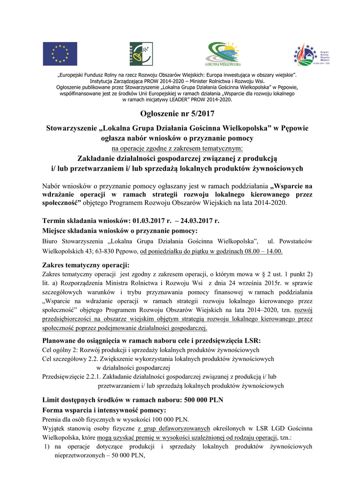 „Europejski Fundusz Rolny na rzecz Rozwoju Obszarów Wiejskich: Europa inwestująca w obszary wiejskie”. Instytucja Zarządzająca PROW 2014-2020 – Minister Rolnictwa i Rozwoju Wsi. Ogłoszenie publikowane przez Stowarzyszenie „Lokalna Grupa Działania Gościnna Wielkopolska” w Pępowie, współfinansowane jest ze środków Unii Europejskiej w ramach działania „Wsparcie dla rozwoju lokalnego w ramach inicjatywy LEADER” PROW 2014-2020. Ogłoszenie nr 5/2017 Stowarzyszenie „Lokalna Grupa Działania Gościnna Wielkopolska” w Pępowie ogłasza nabór wniosków o przyznanie pomocy na operacje zgodne z zakresem tematycznym: Zakładanie działalności gospodarczej związanej z produkcją i/ lub przetwarzaniem i/ lub sprzedażą lokalnych produktów żywnościowych Nabór wniosków o przyznanie pomocy ogłaszany jest w ramach poddziałania „Wsparcie na wdrażanie operacji w ramach strategii rozwoju lokalnego kierowanego przez społeczność” objętego Programem Rozwoju Obszarów Wiejskich na lata 2014-2020. Termin składania wniosków: 01.03.2017 r. – 24.03.2017 r. Miejsce składania wniosków o przyznanie pomocy: Biuro Stowarzyszenia „Lokalna Grupa Działania Gościnna Wielkopolska”, ul. Powstańców Wielkopolskich 43; 63-830 Pępowo, od poniedziałku do piątku w godzinach 08.00 – 14.00. Zakres tematyczny operacji: Zakres tematyczny operacji jest zgodny z zakresem operacji, o którym mowa w § 2 ust. 1 punkt 2) lit. a) Rozporządzenia Ministra Rolnictwa i Rozwoju Wsi z dnia 24 września 2015r. w sprawie szczegółowych warunków i trybu przyznawania pomocy finansowej w ramach poddziałania „Wsparcie na wdrażanie operacji w ramach strategii rozwoju lokalnego kierowanego przez społeczność” objętego Programem Rozwoju Obszarów Wiejskich na lata 2014–2020, tzn. rozwój przedsiębiorczości na obszarze wiejskim objętym strategią rozwoju lokalnego kierowanego przez społeczność poprzez podejmowanie działalności gospodarczej. Planowane do osiągnięcia w ramach naboru cele i przedsięwzięcia LSR: Cel ogólny 2: Rozwój produkcji i sprzedaży lokalnych produktów żywnościowych Cel szczegółowy 2.2. Zwiększenie wykorzystania lokalnych produktów żywnościowych w działalności gospodarczej Przedsięwzięcie 2.2.1. Zakładanie działalności gospodarczej związanej z produkcją i/ lub przetwarzaniem i/ lub sprzedażą lokalnych produktów żywnościowych Limit dostępnych środków w ramach naboru: 500 000 PLN Forma wsparcia i intensywność pomocy: Premia dla osób fizycznych w wysokości 100 000 PLN. Wyjątek stanowią osoby fizyczne z grup defaworyzowanych określonych w LSR LGD Gościnna Wielkopolska, które mogą uzyskać premię w wysokości uzależnionej od rodzaju operacji, tzn.: 1) na operacje dotyczące produkcji i sprzedaży lokalnych produktów żywnościowych nieprzetworzonych – 50 000 PLN, 2) na operacje dotyczące produkcji, przetwarzania i sprzedaży lokalnych produktów żywnościowych pochodzenia roślinnego – 70 000 PLN, 3) na operacje dotyczące produkcji, przetwarzania i sprzedaży lokalnych produktów żywnościowych pochodzenia zwierzęcego – 100 000 PLN. Grupy defaworyzowane określone w LSR LGD Gościnna Wielkopolska to kobiety i osoby w wieku 50+. Warunki wsparcia: 1. Złożenie przez uprawniony podmiot wskazany w ogłoszeniu wymaganych dokumentów potwierdzających spełnienie warunków udzielenia wsparcia oraz kryteriów wyboru operacji. 2. Złożenie dokumentów w miejscu i czasie podanym w ogłoszeniu. 3. Zgodność operacji ze Strategią rozwoju lokalnego kierowanego przez społeczność (LSR) LGD Gościnna Wielkopolska na lata 2016-2023. 4. Zgodność operacji z warunkami przyznania pomocy określonymi w PROW na lata 2014-2020. Tryb składania wniosków: Wnioski należy składać bezpośrednio w miejscu i terminie wskazanym w ogłoszeniu. Wniosek wraz z załącznikami i wymaganymi dokumentami na odpowiednich formularzach należy składać w opisanym segregatorze w 1 egzemplarzu w wersji papierowej oraz w formie dokumentu elektronicznego. Informacja o miejscu udostępnienia dokumentów dotyczących naboru: Kryteria wyboru operacji wraz ze wskazaniem minimalnej liczby punktów, której uzyskanie jest warunkiem wyboru operacji, Strategia rozwoju lokalnego kierowanego przez społeczność (LSR) LGD Gościnna Wielkopolska, formularz wniosku o przyznanie pomocy, formularz wniosku o płatność, formularz umowy o udzielenie wsparcia oraz formularze dokumentów potwierdzających spełnienie kryteriów wyboru operacji znajdują się w siedzibie LGD oraz na stronie internetowej Stowarzyszenia „Lokalna Grupa Działania Gościnna Wielkopolska” www.goscinnawielkopolska.pl Wymagane dokumenty, potwierdzające spełnienie warunków udzielenia wsparcia oraz kryteriów wyboru operacji: - wniosek o przyznanie pomocy z załącznikami, - oświadczenie o realizacji wskaźników rezultatu na formularzu udostępnionym przez LGD, - oświadczenie o innowacyjności na formularzu udostępnionym przez LGD, - oświadczenie o wykorzystaniu rozwiązań lub technologii sprzyjających ochronie środowiska i/ lub klimatu na formularzu udostępnionym przez LGD. Informacje dodatkowe: Informacje udzielane są w Biurze Stowarzyszenia „Lokalna Grupa Działania Gościnna Wielkopolska”, ul. Powstańców Wielkopolskich 43; 63-830 Pępowo; tel. 65 573 6300; 607 879 665 w godzinach pracy Biura. Załączniki: (w wersji elektronicznej dostępne na www.goscinnawielkopolska.pl) 1) Wniosek z załącznikami 2) Oświadczenie o realizacji wskaźników rezultatu na formularzu udostępnionym przez LGD 3) Oświadczenie o innowacyjności na formularzu udostępnionym przez LGD 4) Oświadczenie o wykorzystaniu rozwiązań lub technologii sprzyjających ochronie środowiska i/ lub klimatu na formularzu udostępnionym przez LGD 5) Kryteria wyboru operacji ze wskazaniem minimalnej liczby punktów, której uzyskanie jest warunkiem wyboru operacji 6) Karta oceny opera