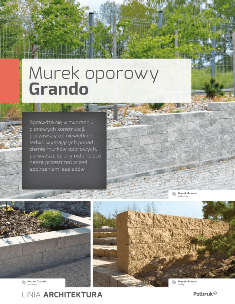 Murek oporowy Grando Sprawdza się w tworzeniu pionowych konstrukcji, począwszy od niewielkich, ledwo wystających ponad ziemię murków oporowych, po wyższe ściany osłaniające naszą przestrzeń przed spojrzeniami sąsiadów. Murek Grando paloma Murek Grando paloma LINIA ARCHITEKTURA Murek Grando żółty Murek oporowy Grando Kształt | Wymiary bloczek połówkowy dwustronnie łamany 25×15 cm 30×15 cm grubość muru [cm] rodzaj bloczek standardowy dwustronnie łamany 50×15 cm 60×15 cm kolor j.m. bloczek standardowy dwustronnie łamany 25 bloczek standardowy trójstronnie łamany bloczek standardowy trójstronnie łamany 50×15 cm wymiary [cm] ilość na palecie [szt.] waga palety [kg] 50×15 40 1 681 60×15 32 1 625 25×15 80 1 753 30×15 64 1 625 Zastosowanie Schody paloma piaskowy żółty grafitowy bloczek połówkowy dwustronnie łamany Zagospodarowanie skarpy szt. Produkt jest dostępny na zamówienie. Kolorystyka paloma grafitowy piaskowy żółty LINIA ARCHITEKTURA