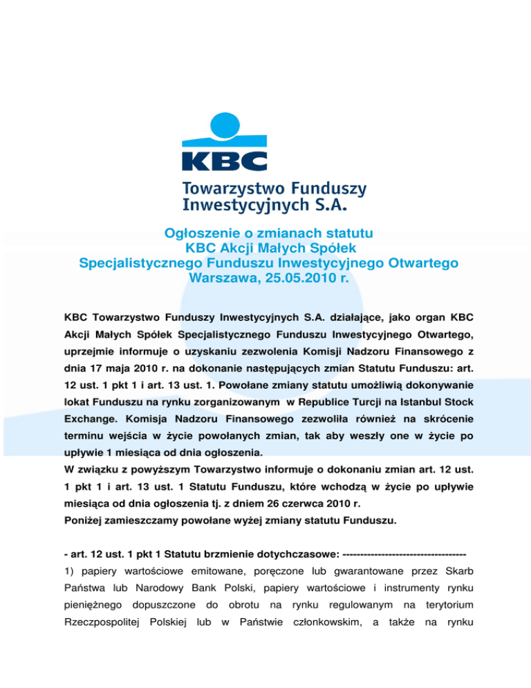 Ogłoszenie o zmianach statutu KBC Akcji Małych Spółek Specjalistycznego Funduszu Inwestycyjnego Otwartego Warszawa, 25.05.2010 r. KBC Towarzystwo Funduszy Inwestycyjnych S.A. działające, jako organ KBC Akcji Małych Spółek Specjalistycznego Funduszu Inwestycyjnego Otwartego, uprzejmie informuje o uzyskaniu zezwolenia Komisji Nadzoru Finansowego z dnia 17 maja 2010 r. na dokonanie następujących zmian Statutu Funduszu: art. 12 ust. 1 pkt 1 i art. 13 ust. 1. Powołane zmiany statutu umożliwią dokonywanie lokat Funduszu na rynku zorganizowanym w Republice Turcji na Istanbul Stock Exchange. Komisja Nadzoru Finansowego zezwoliła również na skrócenie terminu wejścia w życie powołanych zmian, tak aby weszły one w życie po upływie 1 miesiąca od dnia ogłoszenia. W związku z powyższym Towarzystwo informuje o dokonaniu zmian art. 12 ust. 1 pkt 1 i art. 13 ust. 1 Statutu Funduszu, które wchodzą w życie po upływie miesiąca od dnia ogłoszenia tj. z dniem 26 czerwca 2010 r. Poniżej zamieszczamy powołane wyżej zmiany statutu Funduszu. - art. 12 ust. 1 pkt 1 Statutu brzmienie dotychczasowe: ----------------------------------1) papiery wartościowe emitowane, poręczone lub gwarantowane przez Skarb Państwa lub Narodowy Bank Polski, papiery wartościowe i instrumenty rynku pieniężnego dopuszczone do obrotu na rynku regulowanym na terytorium Rzeczpospolitej Polskiej lub w Państwie członkowskim, a także na rynku zorganizowanym niebędącym rynkiem regulowanym w Rzeczypospolitej Polskiej lub innym Państwie Członkowskim;------------------------------------------------------------------------ art. 12 ust. 1 pkt 1 Statutu brzmienie obecne: ---------------------------------------------- 1) papiery wartościowe emitowane, poręczone lub gwarantowane przez Skarb Państwa lub Narodowy Bank Polski, papiery wartościowe i instrumenty rynku pieniężnego dopuszczone do obrotu na rynku regulowanym na terytorium Rzeczypospolitej Polskiej lub w państwie członkowskim, a także na rynku zorganizowanym niebędącym rynkiem regulowanym w Rzeczypospolitej Polskiej lub innym Państwie członkowskim oraz w Republice Turcji na Istanbul Stock Exchange,--- art. 13 ust. 1 Statutu brzmienie dotychczasowe: ------------------------------------------ 1. Fundusz może zawierać umowy mające za przedmiot instrumenty pochodne dopuszczone do obrotu na rynku regulowanym na terytorium Rzeczypospolitej Polskiej lub w Państwie członkowskim Unii Europejskiej, a także na rynku zorganizowanym niebędącym rynkiem regulowanym w Rzeczypospolitej Polskiej lub innym Państwie członkowskim.------------------------------------------------------------------------- art. 13 ust. 1 Statutu brzmienie obecne: ------------------------------------------------------ 1. Fundusz może zawierać umowy mające za przedmiot instrumenty pochodne dopuszczone do obrotu na rynku regulowanym na terytorium Rzeczypospolitej Polskiej lub w Państwie członkowskim Unii Europejskiej, a także na rynku zorganizowanym niebędącym rynkiem regulowanym w Rzeczypospolitej Polskiej lub innym Państwie członkowskim oraz w Republice Turcji na Istanbul Stock Exchange.--- -2-