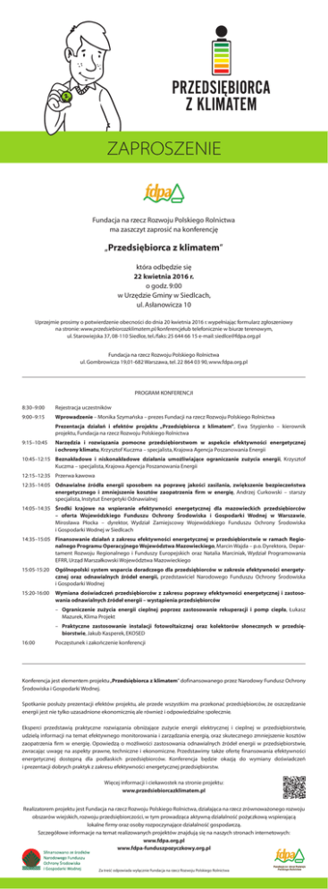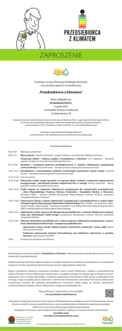 ZAPROSZENIE Fundacja na rzecz Rozwoju Polskiego Rolnictwa ma zaszczyt zaprosić na konferencję „Przedsiębiorca z klimatem” która odbędzie się 22 kwietnia 2016 r. o godz. 9:00 w Urzędzie Gminy w Siedlcach, ul. Asłanowicza 10 Uprzejmie prosimy o potwierdzenie obecności do dnia 20 kwietnia 2016 r. wypełniając formularz zgłoszeniowy na stronie: www.przedsiebiorcazklimatem.pl/konferencjelub telefonicznie w biurze terenowym, ul. Starowiejska 37, 08-110 Siedlce, tel./faks: 25 644 66 15 e-mail: [email protected] Fundacja na rzecz Rozwoju Polskiego Rolnictwa ul. Gombrowicza 19,01-682 Warszawa, tel. 22 864 03 90, www.fdpa.org.pl PROGRAM KONFERENCJI 8:30–9:00 9:00–9:15 Rejestracja uczestników Wprowadzenie – Monika Szymańska – prezes Fundacji na rzecz Rozwoju Polskiego Rolnictwa Prezentacja działań i efektów projektu „Przedsiębiorca z klimatem”, Ewa Stygienko – kierownik projektu, Fundacja na rzecz Rozwoju Polskiego Rolnictwa 9:15–10:45 Narzędzia i rozwiązania pomocne przedsiębiorstwom w aspekcie efektywności energetycznej i ochrony klimatu, Krzysztof Kuczma – specjalista, Krajowa Agencja Poszanowania Energii 10:45–12:15 Beznakładowe i niskonakładowe działania umożliwiające ograniczanie zużycia energii, Krzysztof Kuczma – specjalista, Krajowa Agencja Poszanowania Energii 12:15–12:35 Przerwa kawowa 12:35–14:05 Odnawialne źródła energii sposobem na poprawę jakości zasilania, zwiększenie bezpieczeństwa energetycznego i zmniejszenie kosztów zaopatrzenia firm w energię, Andrzej Curkowski – starszy specjalista, Instytut Energetyki Odnawialnej 14:05–14:35 Środki krajowe na wspieranie efektywności energetycznej dla mazowieckich przedsiębiorców – oferta Wojewódzkiego Funduszu Ochrony Środowiska i Gospodarki Wodnej w Warszawie, Mirosława Płocka – dyrektor, Wydział Zamiejscowy Wojewódzkiego Funduszu Ochrony Środowiska i Gospodarki Wodnej w Siedlcach 14:35–15:05 Finansowanie działań z zakresu efektywności energetycznej w przedsiębiorstwie w ramach Regionalnego Programu Operacyjnego Województwa Mazowieckiego, Marcin Wajda – p.o. Dyrektora, Departament Rozwoju Regionalnego i Funduszy Europejskich oraz Natalia Marciniak, Wydział Programowania EFRR, Urząd Marszałkowski Województwa Mazowieckiego 15:05-15:20 Ogólnopolski system wsparcia doradczego dla przedsiębiorców w zakresie efektywności energetycznej oraz odnawialnych źródeł energii, przedstawiciel Narodowego Funduszu Ochrony Środowiska i Gospodarki Wodnej 15:20-16:00 Wymiana doświadczeń przedsiębiorców z zakresu poprawy efektywności energetycznej i zastosowania odnawialnych źródeł energii – wystąpienia przedsiębiorców – Ograniczenie zużycia energii cieplnej poprzez zastosowanie rekuperacji i pomp ciepła, Łukasz Mazurek, Klima Projekt – Praktyczne zastosowanie instalacji fotowoltaicznej oraz kolektorów słonecznych w przedsiębiorstwie, Jakub Kasperek, EKOSED 16:00 Poczęstunek i zakończenie konferencji Konferencja jest elementem projektu „Przedsiębiorca z klimatem” dofinansowanego przez Narodowy Fundusz Ochrony Środowiska i Gospodarki Wodnej. Spotkanie posłuży prezentacji efektów projektu, ale przede wszystkim ma przekonać przedsiębiorców, że oszczędzanie energii jest nie tylko uzasadnione ekonomicznie, ale również i odpowiedzialne społecznie. Eksperci przedstawią praktyczne rozwiązania obniżające zużycie energii elektrycznej i cieplnej w przedsiębiorstwie, udzielą informacji na temat efektywnego monitorowania i zarządzania energią, oraz skutecznego zmniejszenie kosztów zaopatrzenia firm w energię. Opowiedzą o możliwości zastosowania odnawialnych źródeł energii w przedsiębiorstwie, zwracając uwagę na aspekty prawne, techniczne i ekonomiczne. Przedstawimy także ofertę finansowania efektywności energetycznej dostępną dla podlaskich przedsiębiorców. Konferencja będzie okazją do wymiany doświadczeń i prezentacji dobrych praktyk z zakresu efektywności energetycznej przedsiębiorstw. Więcej informacji i ciekawostek na stronie projektu: www.przedsiebiorcazklimatem.pl Realizatorem projektu jest Fundacja na rzecz Rozwoju Polskiego Rolnictwa, działająca na rzecz zrównoważonego rozwoju obszarów wiejskich, rozwoju przedsiębiorczości, w tym prowadząca aktywną działalność pożyczkową wspierającą lokalne firmy oraz osoby rozpoczynające działalność gospodarczą. Szczegółowe informacje na temat realizowanych projektów znajdują się na naszych stronach internetowych: www.fdpa.org.pl www.fdpa-funduszpozyczkowy.org.pl Za treść odpowiada wyłącznie Fundacja na rzecz Rozwoju Polskiego Rolnictwa