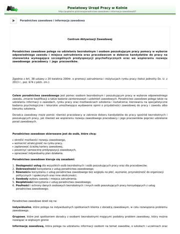 Powiatowy Urząd Pracy w Kolnie http://pupkolno.pl/strona/poradnictwo-zawodowe-i-informacja-zawodowa/67 Poradnictwo zawodowe i informacja zawodowa Centrum Aktywizacji Zawodowej Poradnictwo zawodowe polega na udzielaniu bezrobotnym i osobom poszukującym pracy pomocy w wyborze odpowiedniego zawodu i miejsca zatrudnienia oraz pracodawcom w doborze kandydatów do pracy na stanowiska wymagające szczególnych predyspozycji psychofizycznych oraz we wspieraniu rozwoju zawodowego pracodawcy i jego pracowników. Zgodnie z Art. 38 ustawy z 20 kwietnia 2004r. o promocji zatrudnienia i instytucjach rynku pracy (tekst jednolity Dz. U. z 2013 r., poz. 674 z późn. zm.): Celem poradnictwa zawodowego jest pomoc osobom bezrobotnym i poszukującym pracy w wyborze odpowiedniego zawodu, zmianie kwalifikacji a także badanie zainteresowań i uzdolnień zawodowych. Poradnictwo zawodowe polega także na udzielaniu informacji o zawodach, rynku pracy oraz możliwościach szkolenia i kształcenia; kierowaniu na specjalistyczne badania psychologiczne i lekarskie umożliwiające wydawanie opinii o przydatności zawodowej do pracy i zawodu albo kierunku szkolenia. Doradca zawodowy może pomóc również pracodawcy w zakresie doboru kandydatów do pracy spośród bezrobotnych i poszukujących pracy, jak również we wspieraniu rozwoju zawodowego pracodawcy i jego pracowników poprzez udzielanie porad zawodowych. Poradnictwo zawodowe skierowane jest do osób, które chcą: ● ● ● ● ● określić możliwości rozwoju zawodowego, wzmocnić atrakcyjność na rynku pracy, zaplanować ścieżkę kariery zawodowej, poszerzyć samoocenę predyspozycji zawodowych, opracować indywidualny plan działania. Poradnictwo zawodowe kieruje się zasadami: 1. Dostępności usług dla wszystkich osób bezrobotnych i osób poszukujących pracy oraz dla pracodawców; 2. Dobrowolności korzystania z usług poradnictwa zawodowego; 3. Równościw korzystaniu z usług poradnictwa zawodowego bez względu na płeć, wyznanie, przynależność do organizacji politycznych i społecznych oraz inne okoliczności; 4. Swobody wyboru zawodu i miejsca zatrudnienia; 5. Bezpłatności korzystania z usług poradnictwa zawodowego; 6. Poufności i ochrony danych osobowych bezrobotnych i innych osób poszukujących pracy korzystających z usług poradnictwa zawodowego; Poradnictwo zawodowe dzieli się na: Indywidualne, które polega na indywidualnych spotkaniach klienta z doradcą zawodowym, w celu rozwiązania problemu zawodowego. Grupowe, które jest spotkaniem doradcy z osobami bezrobotnymi mającymi podobny problem zawodowy, który można rozwiązać w większym gronie Informację zawodową, która polega na udzielaniu informacji osobom na temat zawodów, o szkołach i uczelniach oraz kierunkach kształcenia szkolnego i kursowego. Istnieje możliwość udostępnienia osobom zarejestrowanym lub niezarejestrowanym, zasobów informacji zawodowych, wspomagających proces podejmowania decyzji zawodowej oraz umożliwiających dokładniejszą orientację w świecie pracy. Dodatkowych informacji udziela Alicja Wójcik plan otwarty stanowisko 6, tel. 862789520