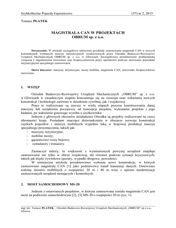 Szybkobieżne Pojazdy Gąsienicowe (37) nr 2, 2015 Tomasz PŁATEK MAGISTRALA CAN W PROJEKTACH OBRUM sp. z o.o. Streszczenie. W artykule szczegółowo omówiono przykłady zastosowania magistrali CAN w nowych konstrukcjach wybranych maszyn inżynieryjnych zrealizowanych przez Ośrodek Badawczo-Rozwojowy Urządzeń Mechanicznych OBRUM sp. z o.o. w Gliwicach. Szczegółowiej przedstawiono problematykę związaną z zagadnieniem sterowania oraz bezpieczeństwem pracy operatorów podczas sterowania pojazdami inżynieryjnymi specjalnego zastosowania. Słowa kluczowe: maszyny inżynieryjne, mosty mobilne, magistrala CAN, sterowniki, bezpieczeństwo sterowania. 1. WSTĘP Ośrodek Badawczo-Rozwojowy Urządzeń Mechanicznych „OBRUM” sp. z o.o. w Gliwicach w zasadniczym stopniu koncentruje się na rozwoju oraz wdrażaniu nowych konstrukcji i technologii zarówno w dziedzinie cywilnej, jak i wojskowej. Prace te realizowane są zawsze w wielu etapach procesu konstruowania danej maszyny lub urządzenia począwszy od koncepcji projektu, wykonanie projektu i jego badania, po wdrożenie gotowego wyrobu u użytkownika. Jednym z głównych obszarów działalności Ośrodka są projekty realizowane na rzecz obronności kraju. Posiadane znaczące doświadczenie w obszarze rozwoju konstrukcji ciężkich pojazdów i maszyn mobilnych wypełnia lukę w krajowej produkcji maszyn specjalnego przeznaczenia, takich jak: maszyny inżynieryjne; mobilne mosty; gąsienicowe wozy bojowe; symulatory i trenażery. Zaznaczyć należy, że większość z wymienionych powyżej urządzeń znajduje zastosowanie nie tylko w sferze wojskowej, ale również podczas sytuacji kryzysowych, takich jak klęski żywiołowe (pożary, wypadki drogowe, powodzie). W niniejszym artykule przedstawiono wybrane nowe konstrukcje, w których zastosowano magistralę CAN [1] jako podstawowy kanał transmisji danych. Omówiono rodzinę mostów mobilnych o rozpiętości 20 m i 40 m wraz z opisem modernizacji zastosowanych urządzeń sterujących i kontrolnych. 2. MOST SAMOCHODOWY MS-20 Jednym z omawianych projektów, w którym zastosowana została magistrala CAN jest most na podwoziu samochodowym [2], [3] MS-20 o rozpiętości 20 m (rys. 1). mgr inż. Tomasz PŁATEK – Ośrodek Badawczo-Rozwojowy Urządzeń Mechanicznych „OBRUM” sp z o.o., Gliwice Zastosowanie magistrali CAN w projektach OBRUM sp. z o.o. Rys. 1. Widok ogólny mostu samochodowego MS-20 Most ten został zaprojektowany na potrzeby przepraw wojskowych z przeszkodami o maksymalnej rozpiętości brzegowej nieprzekraczającej 20 metrów. Specjalna konstrukcja przęseł zapewnia uzyskanie szerokości użytecznej 3 m do 4 m. W odróżnieniu od proponowanych konkurencyjnych rozwiązań mostów, opracowana konstrukcja przęseł, dzięki zastosowaniu wypełnień między pasami jezdni, umożliwia przemarsz piechoty bądź ludności cywilnej. Sposób rozkładania mostu został oparty na tzw. systemie nożycowym, który dzięki odpowiedniej konstrukcji naczepy wyposażonej w element załadowczo – wyładowczy umożliwia ułożenie przęsła nad przeszkodą (rys. 2) w czasie 3 minut. Zastosowanie cywilne wymaga dodatkowego zabudowania przez obsługę barierek i krawężników niezbędnych w przypadku uszkodzenia bądź losowego zerwania przepraw spowodowanych np. powodziami. Na rys. 2 zobrazowano kolejne fazy rozkładania mostu w zastosowanym, oryginalnym systemie nożycowym. Rys. 2. Most samochodowy MS-20 – kolejne fazy rozkładania Tomasz PŁATEK Do podstawowych cech użytkowych mostu samochodowego MS-20 możemy zaliczyć: możliwość poruszania się po drogach publicznych bez konwoju z prędkością do 80 km/h; możliwość pokonywania trudnego terenu dzięki dodatkowo zainstalowanym napędom hydraulicznym; czas gotowości do przeprawy nie przekraczający 30 min., modułowe przęsła mostowe z automatycznie rozsuwanymi wypełnieniami między pasami jezdni. Proces rozkładania mostu przeprowadzany jest przez operatora za pośrednictwem pulpitu sterującego (rys. 8) [4]. W celu poprawnej pracy układu sterującego kolejnymi fazami rozkładania mostu, zastosowano szereg czujników oraz elementów wykonawczych a mianowicie: sterowniki PLC [5]; panel HMI [6]; czujniki ciśnienia; enkodery położenia; czujniki wysunięcia; rozdzielacze proporcjonalne; wyłączniki bezpieczeństwa. Wymienione elementy sterujące oraz wykonawcze bądź sygnalizacyjne zostały odpowiednio dobrane pod kątem niezawodnej współpracy z magistralą CAN. Zastosowanie w projekcie tego typu rozwiązania pozwoliło między innymi na znaczne obniżenie kosztów związanych z wykonaniem instalacji elektrycznej, a także umożliwiło zaimplementowanie specjalistycznego systemu diagnostycznego umożliwiającego pełną kontrolę nad pracą całego układu. Dodatkową zaletą zastosowania systemu diagnostycznego opartego na przesyle danych za pośrednictwem magistrali CAN jest monitorowanie stanu pojazdu oraz możliwość określenia przyczyn zaistniałych awarii. 3. MOST NA PODWOZIU GĄSIENICOWYM MG-20 Kolejnym z rodziny mostów DAGLEZJA zaprojektowanych w Ośrodku BadawczoRozwojowym Urządzeń Mechanicznych OBRUM sp. z o.o. w Gliwicach jest most szturmowy, MG-20 (rys. 3) na podwoziu gąsienicowym [7]. Podczas jego konstruowania wykorzystano doświadczenie uzyskane w procesie projektowania MS-20. Między innymi zastosowano ten sam rodzaj przęsła i sposób jego układania na przeszkodzie. Zmieniono natomiast posadowienie przęsła na podwoziu gąsienicowym. Jako bazowe wykorzystano podwozie czołgu PT-91 [8], po odpowiedniej adaptacji kadłuba. Dokonano niezbędnych przeróbek oraz wzmocnień konstrukcji w celu uzyskania odpowiednich parametrów wytrzymałościowych oraz stabilizacyjnych podwozia. Podobnie jak w przypadku mostu MS-20 operator wykonuje czynności związane z układaniem i podejmowaniem przęsła mostu za pomocą pulpitu sterującego [4]. Zastosowanie magistrali CAN w projektach OBRUM sp. z o.o. Rys. 3.