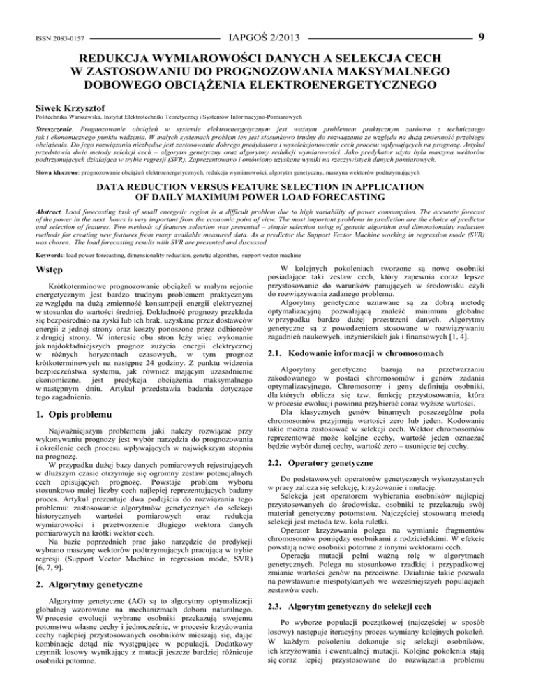 IAPGOŚ 2/2013 ISSN 2083-0157 9 REDUKCJA WYMIAROWOŚCI DANYCH A SELEKCJA CECH W ZASTOSOWANIU DO PROGNOZOWANIA MAKSYMALNEGO DOBOWEGO OBCIĄŻENIA ELEKTROENERGETYCZNEGO Siwek Krzysztof Politechnika Warszawska, Instytut Elektrotechniki Teoretycznej i Systemów Informacyjno-Pomiarowych Streszczenie. Prognozowanie obciążeń w systemie elektroenergetycznym jest ważnym problemem praktycznym zarówno z technicznego jak i ekonomicznego punktu widzenia. W małych systemach problem ten jest stosunkowo trudny do rozwiązania ze względu na dużą zmienność przebiegu obciążenia. Do jego rozwiązania niezbędne jest zastosowanie dobrego predykatora i wyselekcjonowanie cech procesu wpływających na prognozę. Artykuł przedstawia dwie metody selekcji cech – algorytm genetyczny oraz algorytmy redukcji wymiarowości. Jako predykator użyta była maszyna wektorów podtrzymujących działająca w trybie regresji (SVR). Zaprezentowano i omówiono uzyskane wyniki na rzeczywistych danych pomiarowych. Słowa kluczowe: prognozowanie obciążeń elektroenergetycznych, redukcja wymiarowości, algorytm genetyczny, maszyna wektorów podtrzymujących DATA REDUCTION VERSUS FEATURE SELECTION IN APPLICATION OF DAILY MAXIMUM POWER LOAD FORECASTING Abstract. Load forecasting task of small energetic region is a difficult problem due to high variability of power consumption. The accurate forecast of the power in the next hours is very important from the economic point of view. The most important problems in prediction are the choice of predictor and selection of features. Two methods of features selection was presented – simple selection using of genetic algorithm and dimensionality reduction methods for creating new features from many available measured data. As a predictor the Support Vector Machine working in regression mode (SVR) was chosen. The load forecasting results with SVR are presented and discussed. Keywords: load power forecasting, dimensionality reduction, genetic algorithm, support vector machine Wstęp Krótkoterminowe prognozowanie obciążeń w małym rejonie energetycznym jest bardzo trudnym problemem praktycznym ze względu na dużą zmienność konsumpcji energii elektrycznej w stosunku do wartości średniej. Dokładność prognozy przekłada się bezpośrednio na zyski lub ich brak, uzyskane przez dostawców energii z jednej strony oraz koszty ponoszone przez odbiorców z drugiej strony. W interesie obu stron leży więc wykonanie jak najdokładniejszych prognoz zużycia energii elektrycznej w różnych horyzontach czasowych, w tym prognoz krótkoterminowych na następne 24 godziny. Z punktu widzenia bezpieczeństwa systemu, jak również mającym uzasadnienie ekonomiczne, jest predykcja obciążenia maksymalnego w następnym dniu. Artykuł przedstawia badania dotyczące tego zagadnienia. 1. Opis problemu Najważniejszym problemem jaki należy rozwiązać przy wykonywaniu prognozy jest wybór narzędzia do prognozowania i określenie cech procesu wpływających w największym stopniu na prognozę. W przypadku dużej bazy danych pomiarowych rejestrujących w dłuższym czasie otrzymuje się ogromny zestaw potencjalnych cech opisujących prognozę. Powstaje problem wyboru stosunkowo małej liczby cech najlepiej reprezentujących badany proces. Artykuł prezentuje dwa podejścia do rozwiązania tego problemu: zastosowanie algorytmów genetycznych do selekcji historycznych wartości pomiarowych oraz redukcja wymiarowości i przetworzenie długiego wektora danych pomiarowych na krótki wektor cech. Na bazie poprzednich prac jako narzędzie do predykcji wybrano maszynę wektorów podtrzymujących pracującą w trybie regresji (Support Vector Machine in regression mode, SVR) [6, 7, 9]. 2. Algorytmy genetyczne Algorytmy genetyczne (AG) są to algorytmy optymalizacji globalnej wzorowane na mechanizmach doboru naturalnego. W procesie ewolucji wybrane osobniki przekazują swojemu potomstwu własne cechy i jednocześnie, w procesie krzyżowania cechy najlepiej przystosowanych osobników mieszają się, dając kombinacje dotąd nie występujące w populacji. Dodatkowy czynnik losowy wynikający z mutacji jeszcze bardziej różnicuje osobniki potomne. W kolejnych pokoleniach tworzone są nowe osobniki posiadające taki zestaw cech, który zapewnia coraz lepsze przystosowanie do warunków panujących w środowisku czyli do rozwiązywania zadanego problemu. Algorytmy genetyczne uznawane są za dobrą metodę optymalizacyjną pozwalającą znaleźć minimum globalne w przypadku bardzo dużej przestrzeni danych. Algorytmy genetyczne są z powodzeniem stosowane w rozwiązywaniu zagadnień naukowych, inżynierskich jak i finansowych [1, 4]. 2.1. Kodowanie informacji w chromosomach Algorytmy genetyczne bazują na przetwarzaniu zakodowanego w postaci chromosomów i genów zadania optymalizacyjnego. Chromosomy i geny definiują osobniki, dla których oblicza się tzw. funkcję przystosowania, która w procesie ewolucji powinna przybierać coraz wyższe wartości. Dla klasycznych genów binarnych poszczególne pola chromosomów przyjmują wartości zero lub jeden. Kodowanie takie można zastosować w selekcji cech. Wektor chromosomów reprezentować może kolejne cechy, wartość jeden oznaczać będzie wybór danej cechy, wartość zero – usunięcie tej cechy. 2.2. Operatory genetyczne Do podstawowych operatorów genetycznych wykorzystanych w pracy zalicza się selekcję, krzyżowanie i mutację. Selekcja jest operatorem wybierania osobników najlepiej przystosowanych do środowiska, osobniki te przekazują swój materiał genetyczny potomstwu. Najczęściej stosowaną metodą selekcji jest metoda tzw. koła ruletki. Operator krzyżowania polega na wymianie fragmentów chromosomów pomiędzy osobnikami z rodzicielskimi. W efekcie powstają nowe osobniki potomne z innymi wektorami cech. Operacja mutacji pełni ważną rolę w algorytmach genetycznych. Polega na stosunkowo rzadkiej i przypadkowej zmianie warto
