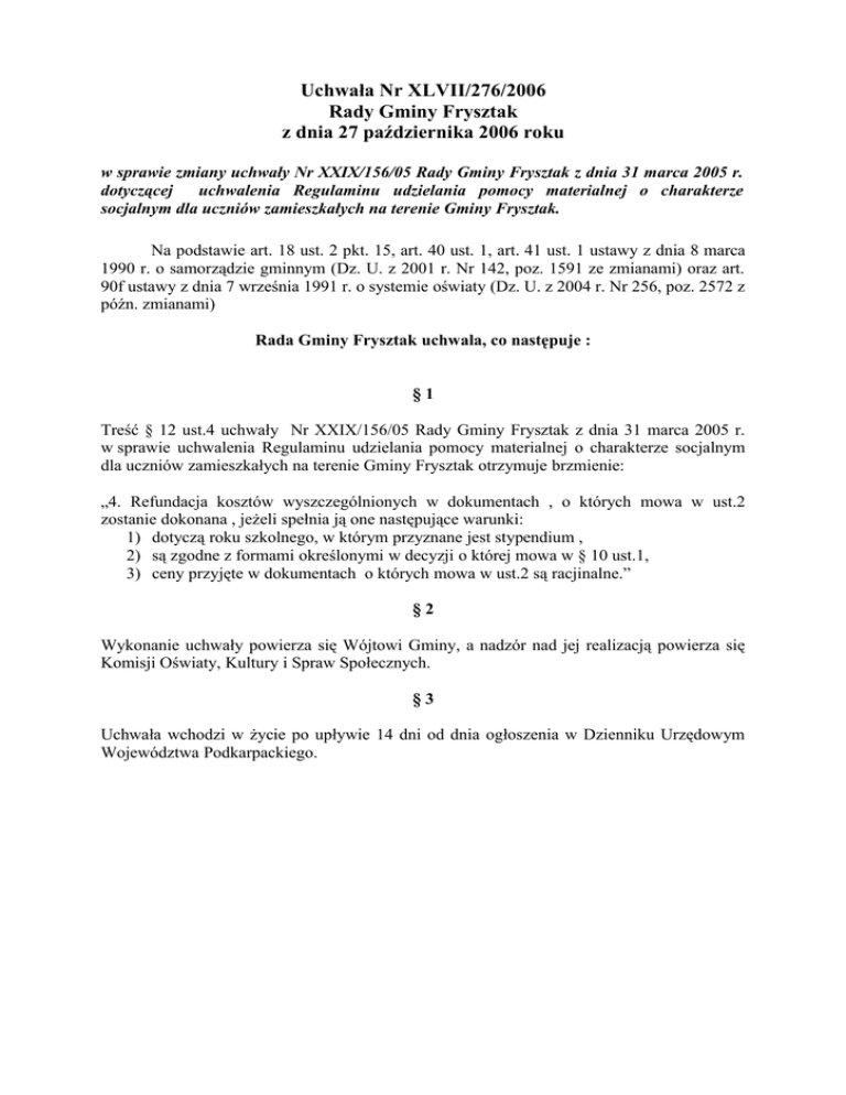 Uchwała Nr XLVII/276/2006 Rady Gminy Frysztak z dnia 27 października 2006 roku w sprawie zmiany uchwały Nr XXIX/156/05 Rady Gminy Frysztak z dnia 31 marca 2005 r. dotyczącej uchwalenia Regulaminu udzielania pomocy materialnej o charakterze socjalnym dla uczniów zamieszkałych na terenie Gminy Frysztak. Na podstawie art. 18 ust. 2 pkt. 15, art. 40 ust. 1, art. 41 ust. 1 ustawy z dnia 8 marca 1990 r. o samorządzie gminnym (Dz. U. z 2001 r. Nr 142, poz. 1591 ze zmianami) oraz art. 90f ustawy z dnia 7 września 1991 r. o systemie oświaty (Dz. U. z 2004 r. Nr 256, poz. 2572 z późn. zmianami) Rada Gminy Frysztak uchwala, co następuje : §1 Treść § 12 ust.4 uchwały Nr XXIX/156/05 Rady Gminy Frysztak z dnia 31 marca 2005 r. w sprawie uchwalenia Regulaminu udzielania pomocy materialnej o charakterze socjalnym dla uczniów zamieszkałych na terenie Gminy Frysztak otrzymuje brzmienie: „4. Refundacja kosztów wyszczególnionych w dokumentach , o których mowa w ust.2 zostanie dokonana , jeżeli spełnia ją one następujące warunki: 1) dotyczą roku szkolnego, w którym przyznane jest stypendium , 2) są zgodne z formami określonymi w decyzji o której mowa w § 10 ust.1, 3) ceny przyjęte w dokumentach o których mowa w ust.2 są racjinalne.” §2 Wykonanie uchwały powierza się Wójtowi Gminy, a nadzór nad jej realizacją powierza się Komisji Oświaty, Kultury i Spraw Społecznych. §3 Uchwała wchodzi w życie po upływie 14 dni od dnia ogłoszenia w Dzienniku Urzędowym Województwa Podkarpackiego.