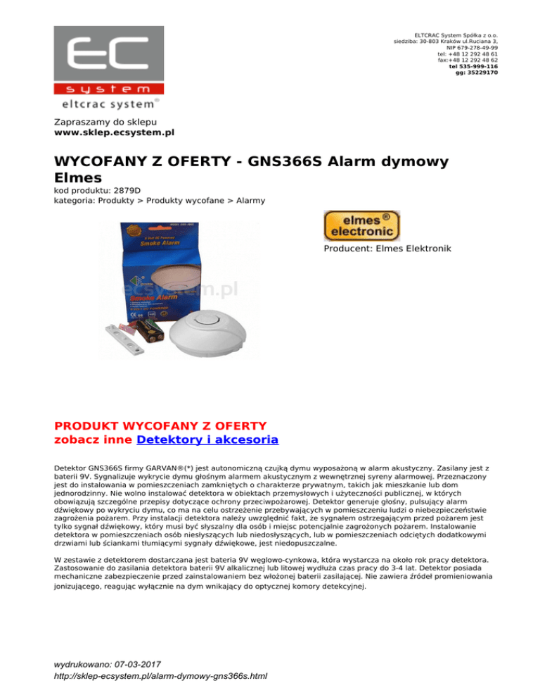 ELTCRAC System Spółka z o.o. siedziba: 30-803 Kraków ul.Ruciana 3, NIP 679-278-49-99 tel: +48 12 292 48 61 fax:+48 12 292 48 62 tel 535-999-116 gg: 35229170 Zapraszamy do sklepu www.sklep.ecsystem.pl WYCOFANY Z OFERTY - GNS366S Alarm dymowy Elmes kod produktu: 2879D kategoria: Produkty > Produkty wycofane > Alarmy Producent: Elmes Elektronik PRODUKT WYCOFANY Z OFERTY zobacz inne Detektory i akcesoria Detektor GNS366S firmy GARVAN®(*) jest autonomiczną czujką dymu wyposażoną w alarm akustyczny. Zasilany jest z baterii 9V. Sygnalizuje wykrycie dymu głośnym alarmem akustycznym z wewnętrznej syreny alarmowej. Przeznaczony jest do instalowania w pomieszczeniach zamkniętych o charakterze prywatnym, takich jak mieszkanie lub dom jednorodzinny. Nie wolno instalować detektora w obiektach przemysłowych i użyteczności publicznej, w których obowiązują szczególne przepisy dotyczące ochrony przeciwpożarowej. Detektor generuje głośny, pulsujący alarm dźwiękowy po wykryciu dymu, co ma na celu ostrzeżenie przebywających w pomieszczeniu ludzi o niebezpieczeństwie zagrożenia pożarem. Przy instalacji detektora należy uwzględnić fakt, że sygnałem ostrzegającym przed pożarem jest tylko sygnał dźwiękowy, który musi być słyszalny dla osób i miejsc potencjalnie zagrożonych pożarem. Instalowanie detektora w pomieszczeniach osób niesłyszących lub niedosłyszących, lub w pomieszczeniach odciętych dodatkowymi drzwiami lub ściankami tłumiącymi sygnały dźwiękowe, jest niedopuszczalne. W zestawie z detektorem dostarczana jest bateria 9V węglowo-cynkowa, która wystarcza na około rok pracy detektora. Zastosowanie do zasilania detektora baterii 9V alkalicznej lub litowej wydłuża czas pracy do 3-4 lat. Detektor posiada mechaniczne zabezpieczenie przed zainstalowaniem bez włożonej baterii zasilającej. Nie zawiera źródeł promieniowania jonizującego, reagując wyłącznie na dym wnikający do optycznej komory detekcyjnej. wydrukowano: 07-03-2017 http://sklep-ecsystem.pl/alarm-dymowy-gns366s.html