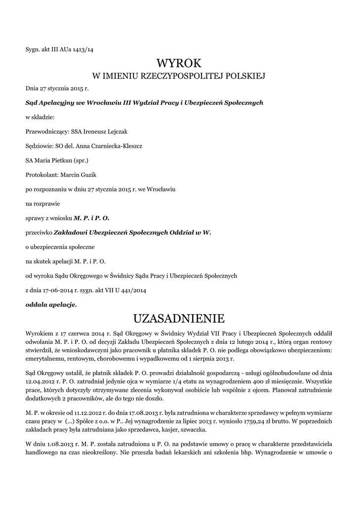 Sygn. akt III AUa 1413/14 WYROK W IMIENIU RZECZYPOSPOLITEJ POLSKIEJ Dnia 27 stycznia 2015 r. Sąd Apelacyjny we Wrocławiu III Wydział Pracy i Ubezpieczeń Społecznych w składzie: Przewodniczący: SSA Ireneusz Lejczak Sędziowie: SO del. Anna Czarniecka-Kleszcz SA Maria Pietkun (spr.) Protokolant: Marcin Guzik po rozpoznaniu w dniu 27 stycznia 2015 r. we Wrocławiu na rozprawie sprawy z wniosku M. P. i P. O. przeciwko Zakładowi Ubezpieczeń Społecznych Oddział w W. o ubezpieczenia społeczne na skutek apelacji M. P. i P. O. od wyroku Sądu Okręgowego w Świdnicy Sądu Pracy i Ubezpieczeń Społecznych z dnia 17-06-2014 r. sygn. akt VII U 441/2014 oddala apelacje. UZASADNIENIE Wyrokiem z 17 czerwca 2014 r. Sąd Okręgowy w Świdnicy Wydział VII Pracy i Ubezpieczeń Społecznych oddalił odwołania M. P. i P. O. od decyzji Zakładu Ubezpieczeń Społecznych z dnia 12 lutego 2014 r., którą organ rentowy stwierdził, że wnioskodawczyni jako pracownik u płatnika składek P. O. nie podlega obowiązkowo ubezpieczeniom: emerytalnemu, rentowym, chorobowemu i wypadkowemu od 1 sierpnia 2013 r. Sąd Okręgowy ustalił, że płatnik składek P. O. prowadzi działalność gospodarczą - usługi ogólnobudowlane od dnia 12.04.2012 r. P. O. zatrudniał jedynie ojca w wymiarze 1/4 etatu za wynagrodzeniem 400 zł miesięcznie. Wszystkie prace, których dotyczyły otrzymywane zlecenia wykonywał osobiście lub wspólnie z ojcem. Planował zatrudnienie dodatkowych 2 pracowników, ale do tego nie doszło. M. P. w okresie od 11.12.2012 r. do dnia 17.08.2013 r. była zatrudniona w charakterze sprzedawcy w pełnym wymiarze czasu pracy w (...) Spółce z o.o. w P.. Jej wynagrodzenie za lipiec 2013 r. wyniosło 1759,24 zł brutto. W poprzednich zakładach pracy była zatrudniana jako sprzedawca, kasjer, szwaczka. W dniu 1.08.2013 r. M. P. została zatrudniona u P. O. na podstawie umowy o pracę w charakterze przedstawiciela handlowego na czas nieokreślony. Nie przeszła badań lekarskich ani szkolenia bhp. Wynagrodzenie w umowie o pracę zostało określone na 3500 zł brutto miesięcznie. Do jej obowiązków należało m.in. podejmowanie działań zmierzających do pozyskania nowych klientów, przygotowywanie i przedstawianie umów dla klientów, negocjacje warunków transakcji, realizacja zamówień ze strony klientów, dostawa towaru, prowadzenie rozmów handlowych z klientami, prowadzenie bazy danych klientów, sporządzanie raportów z przebiegu wykonywanej pracy, realizacja zadań sprzedażowych. P. O. w dniu 5.08.2013 r. zgłosił wnioskodawczynię do ubezpieczeń społecznych. Podstawa wymiaru składek na ubezpieczenia społeczne M. P. wynosiła za miesiąc sierpień - 3500 zł, a za wrzesień 2013 r. – 2566,67zł. Od dnia 23.09.2013 r. wnioskodawczyni była niezdolna do pracy z powodu ciąży. W trakcie jej zatrudnienia wnioskodawca P. O. zawarł umowę dotyczącą wykonania prac remontowych w mieszkaniu K. K. (1), który jest sąsiadem M. P.. W okresie nieobecności wnioskodawczyni P. O. nie zatrudnił nikogo na jej miejsce. Zaskarżoną decyzją z dnia 12.02.2014 r. Zakład Ubezpieczeń Społecznych Oddział w W. stwierdził, że M. P. jako pracownik u płatnika składek P. O. nie podlega obowiązkowo ubezpieczeniom: emerytalnemu, rentowym, chorobowemu i wypadkowemu od 01.08.2013 r. Przy tak poczynionych ustaleniach Sąd Okręgowy uznał, że odwołania nie zasługują na uwzględnienie. Przepis art. 6 ust. 1 pkt 1 ustawy z dnia 13.10.1998 r. o systemie ubezpieczeń społecznych (Dz. U. z 2009 r., Nr 205 poz. 1585 ze zm.) stanowi tytuł podlegania ubezpieczeniom społecznym pracowników. Zdaniem sądu okoliczności sprawy wskazują na to, że zatrudnienie wnioskodawczyni miało charakter pozorny, a jedynym powodem zawarcia umowy o pracę było uzyskanie świadczeń z ubezpieczenia społecznego. O tym, czy strony istotnie nawiązały stosunek pracy w rozumieniu art. 22 kp nie decyduje formalne zawarcie umowy, ani zgłoszenie pracownika do ubezpieczeń społecznych lecz faktyczne i rzeczywiste realizowanie na jej podstawie elementów charakterystycznych dla stosunku pracy. Sąd nie dał wiary zeznaniom wnioskodawców, w których wskazywali okoliczności i rzekome powody podpisania umowy o pracę w dniu 1.08.2013 r., gdyż postępowanie dowodowe nie potwierdziło by w tego wyniku doszło do powstania stosunku pracy. W ślad za czynnościami formalnymi nie szło ich faktyczne wykonywanie, bo to nie było zamiarem stron i stąd nie zostało przez nie wykazane. Przede wszystkim zakres szczegółowych obowiązków wnioskodawczyni na stanowisku przedstawiciela handlowego nie koresponduje z zeznaniami wnioskodawców. Jedyny pozyskany przez wnioskodawczynię klient to K. K. (1), u którego faktycznie wnioskodawca wykonywał prace remontowe. Jednakże z relacji świadka wynika, iż jest on sąsiadem i znajomym M. P., a P. O. został mu polecony w trakcie przypadkowego spotkania z wnioskodawczynią w pobliżu miejsca zamieszkania i towarzyskiej rozmowy. Zarówno z zeznań świadka, jak i wnioskodawców nie wynika, ażeby wnioskodawczyni sporządzała dokumentację dotyczącą tej współpracy, jak również negocjowała ofertę, chociaż z zakresu obowiązków wynika, że to powinna robić. Znamienne jest również to, że dotychczas P. O. nie potrzebował przy prowadzeniu firmy zatrudnienia przedstawiciela handlowego, nie potrzebował takiej osoby również później, kiedy M. P. przebywała na zwolnieniu lekarskim. Mimo deklarowanego rozwoju firmy nie zatrudnił dodatkowych pracowników, a zlecane prace wykonywał i wykonuje osobiście lub wspólnie z ojcem zatrudnianym w wymiarze ¼ etatu. M. P. nie wykazała również, jaką dokumentacją zajmowała się w okresie zatrudnienia i nie wyjaśniają tego również zeznania świadka A. S., której wiedza w tym zakresie była niewielka. Z zakresu obowiązków wnioskodawczyni wynika, że miała sporządzać raporty z przebiegu wykonywanej pracy, ale ż