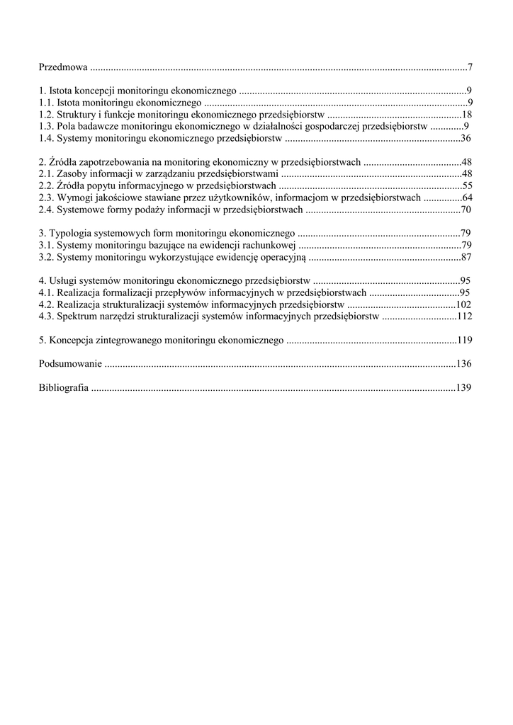 Przedmowa ..................................................................................................................................................7 1. Istota koncepcji monitoringu ekonomicznego ........................................................................................9 1.1. Istota monitoringu ekonomicznego ......................................................................................................9 1.2. Struktury i funkcje monitoringu ekonomicznego przedsiębiorstw ....................................................18 1.3. Pola badawcze monitoringu ekonomicznego w działalności gospodarczej przedsiębiorstw .............9 1.4. Systemy monitoringu ekonomicznego przedsiębiorstw ....................................................................36 2. Źródła zapotrzebowania na monitoring ekonomiczny w przedsiębiorstwach ......................................48 2.1. Zasoby informacji w zarządzaniu przedsiębiorstwami ......................................................................48 2.2. Źródła popytu informacyjnego w przedsiębiorstwach .......................................................................55 2.3. Wymogi jakościowe stawiane przez użytkowników, informacjom w przedsiębiorstwach ...............64 2.4. Systemowe formy podaży informacji w przedsiębiorstwach ............................................................70 3. Typologia systemowych form monitoringu ekonomicznego ...............................................................79 3.1. Systemy monitoringu bazujące na ewidencji rachunkowej ...............................................................79 3.2. Systemy monitoringu wykorzystujące ewidencję operacyjną ...........................................................87 4. Usługi systemów monitoringu ekonomicznego przedsiębiorstw .........................................................95 4.1. Realizacja formalizacji przepływów informacyjnych w przedsiębiorstwach ...................................95 4.2. Realizacja strukturalizacji systemów informacyjnych przedsiębiorstw ..........................................102 4.3. Spektrum narzędzi strukturalizacji systemów informacyjnych przedsiębiorstw .............................112 5. Koncepcja zintegrowanego monitoringu ekonomicznego ..................................................................119 Podsumowanie ........................................................................................................................................136 Bibliografia .............................................................................................................................................139