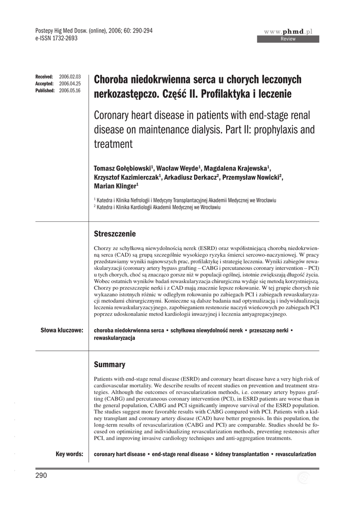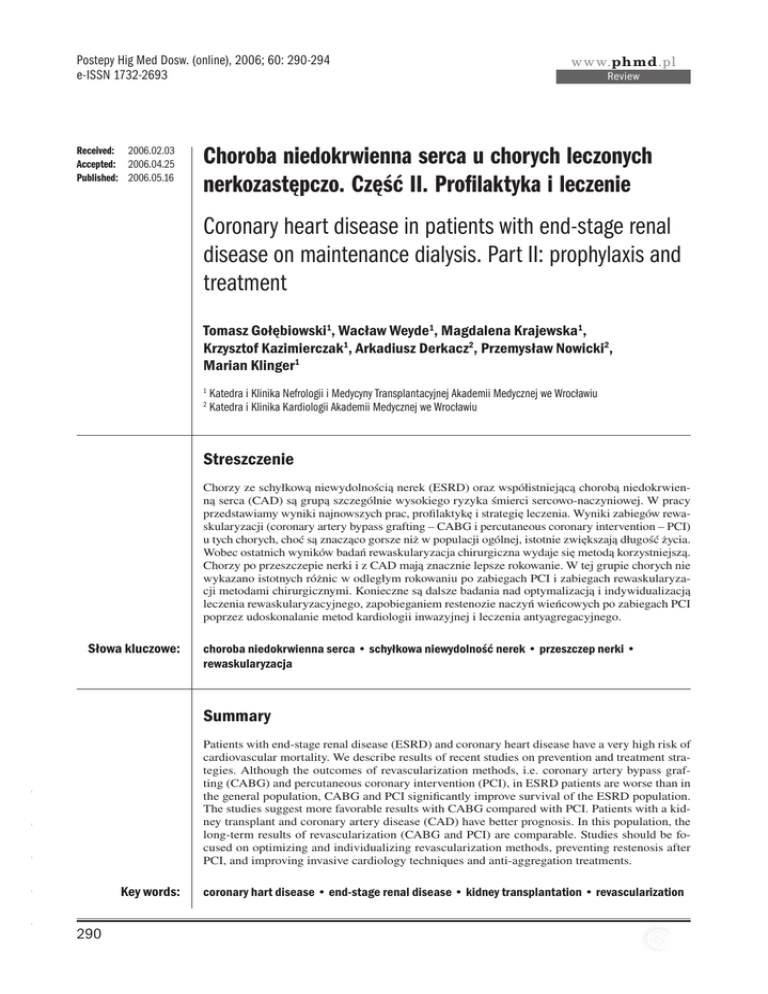 Postepy Hig Med Dosw. (online), 2006; 60: 290-294 e-ISSN 1732-2693 Received: 2006.02.03 Accepted: 2006.04.25 Published: 2006.05.16 www.phmd.pl Review Choroba niedokrwienna serca u chorych leczonych nerkozastępczo. Część II. Profilaktyka i leczenie Coronary heart disease in patients with end-stage renal disease on maintenance dialysis. Part II: prophylaxis and treatment Tomasz Gołębiowski1, Wacław Weyde1, Magdalena Krajewska1, Krzysztof Kazimierczak1, Arkadiusz Derkacz2, Przemysław Nowicki2, Marian Klinger1 1 2 Katedra i Klinika Nefrologii i Medycyny Transplantacyjnej Akademii Medycznej we Wrocławiu Katedra i Klinika Kardiologii Akademii Medycznej we Wrocławiu Streszczenie Chorzy ze schyłkową niewydolnością nerek (ESRD) oraz współistniejącą chorobą niedokrwienną serca (CAD) są grupą szczególnie wysokiego ryzyka śmierci sercowo-naczyniowej. W pracy przedstawiamy wyniki najnowszych prac, profilaktykę i strategię leczenia. Wyniki zabiegów rewaskularyzacji (coronary artery bypass grafting – CABG i percutaneous coronary intervention – PCI) u tych chorych, choć są znacząco gorsze niż w populacji ogólnej, istotnie zwiększają długość życia. Wobec ostatnich wyników badań rewaskularyzacja chirurgiczna wydaje się metodą korzystniejszą. Chorzy po przeszczepie nerki i z CAD mają znacznie lepsze rokowanie. W tej grupie chorych nie wykazano istotnych różnic w odległym rokowaniu po zabiegach PCI i zabiegach rewaskularyzacji metodami chirurgicznymi. Konieczne są dalsze badania nad optymalizacją i indywidualizacją leczenia rewaskularyzacyjnego, zapobieganiem restenozie naczyń wieńcowych po zabiegach PCI poprzez udoskonalanie metod kardiologii inwazyjnej i leczenia antyagregacyjnego. Słowa kluczowe: choroba niedokrwienna serca • schyłkowa niewydolność nerek • przeszczep nerki • rewaskularyzacja Summary - - - Patients with end-stage renal disease (ESRD) and coronary heart disease have a very high risk of cardiovascular mortality. We describe results of recent studies on prevention and treatment strategies. Although the outcomes of revascularization methods, i.e. coronary artery bypass grafting (CABG) and percutaneous coronary intervention (PCI), in ESRD patients are worse than in the general population, CABG and PCI significantly improve survival of the ESRD population. The studies suggest more favorable results with CABG compared with PCI. Patients with a kidney transplant and coronary artery disease (CAD) have better prognosis. In this population, the long-term results of revascularization (CABG and PCI) are comparable. Studies should be focused on optimizing and individualizing revascularization methods, preventing restenosis after PCI, and improving invasive cardiology techniques and anti-aggregation treatments. - - Key words: 290 coronary hart disease • end-stage renal disease • kidney transplantation • revascularization Gołębiowski T. i wsp. – Choroba niedokrwienna serca u chorych leczonych… Full-text PDF: Word count: Tables: Figures: References: http://www.phmd.pl/pub/phmd/vol_60/9131.pdf 1806 — — 29 Adres autora: lek. med. Tomasz Gołębiowski, Katedra i Klinika Nefrologii i Medycyny Transplantacynej AM, ul. R. Traugutta 57/59, 50-417 Wrocław; e-mail: [email protected] PROFILAKTYKA I LECZENIE ZACHOWAWCZE Obecnie brakuje randomizowanych badań porównujących wyniki leczenia zachowawczego z leczeniem rewaskularyzacyjnym u chorych ze stwierdzonym istotnym zwężeniem tętnicy wieńcowej. W jednym z badań [21], zakwalifikowano 26 chorych z cukrzycą insulinozależną z nietypowymi dolegliwościami bólowymi lub bez, po koronarografii, z istotnym >75% zwężeniem tętnicy wieńcowej i podzielono na dwie grupy. U 13 wykonano zabieg PCI lub CABG, 13 zakwalifikowano do leczenia zachowawczego. Badanie ukończono przedwcześnie w 8,5 miesiącu, ponieważ w grupie chorych leczonych zachowawczo u 8 z 13 chorych wystąpił punkt końcowy (śmierć z powodów sercowych, zawał mięśnia sercowego lub konieczność rewaskularyzacji w trybie nagłym). Ponadto chorzy w różnych stadiach przewlekłej choroby nerek, u których wystąpił ostry zespół wieńcowy, mają zmniejszone przeżycie, gdy poddani są leczeniu nieinwazyjnemu (np. leczeniu trombolitycznemu lub tylko leczeniu antykoagulacyjnemu). Rokowanie w tych przypadkach jest tym gorsze im bardziej upośledzona jest funkcja filtracyjna nerek [17]. Z tych powodów chorzy objęci programami dializoterapii przewlekłej ze stwierdzonym istotnym zwężeniem tętnic wieńcowych powinni być kwalifikowani do zabiegów rewaskularyzacyjnych: PCI lub CABG, a w razie niemożliwości lub przeciwwskazań do tych zabiegów powinni otrzymywać aspirynę, b-bloker, dodatkowo inhibitor konwertazy angiotensyny, szczególnie dotyczy to pacjentów z dysfunkcją lewej komory. Wskazana jest redukcja czynników ryzyka (papierosy, gospodarka lipidowa) i udział chorego w programach rehabilitacji kardiologicznej. Szczególnie w tej grupie chorych konieczna jest ścisła kontrola płynu zewnątrzkomórkowego ECF, korekcja niedokrwistości (wg wytycznych NKF-DOQI docelowy hematokryt powinien wynosić 33-36%) [7]. - - Profilaktyka choroby niedokrwiennej serca u chorych dializowanych jest obecnie problemem nierozwiązanym. Chorzy ci z różnych przyczyn wykluczani są z dużych programów badawczych. Ze względu jednak na to, iż w tej populacji występuje duże ryzyko powikłań sercowo-naczyniowych wydaje się racjonalne stosowanie profilaktyki zarówno pierwotnej jak i wtórnej. Konieczne jest leczenie nadciśnienia tętniczego [27], modyfikacja gospodarki lipidowej, a w przypadku hipercholesterolemii zastosowanie statyn. - Wskutek dynamicznego rozwoju kardiologii interwencyjnej znacznie zwiększyła się możliwość przezskórnych zabiegów interwencyjnych w zakresie tętnic wieńcowych REWASKULARYZACJA METODAMI PCI A ZABIEGI KARDIOCHIRURGICZNE Badania porównujące wyżej wymienione metody rewaskul