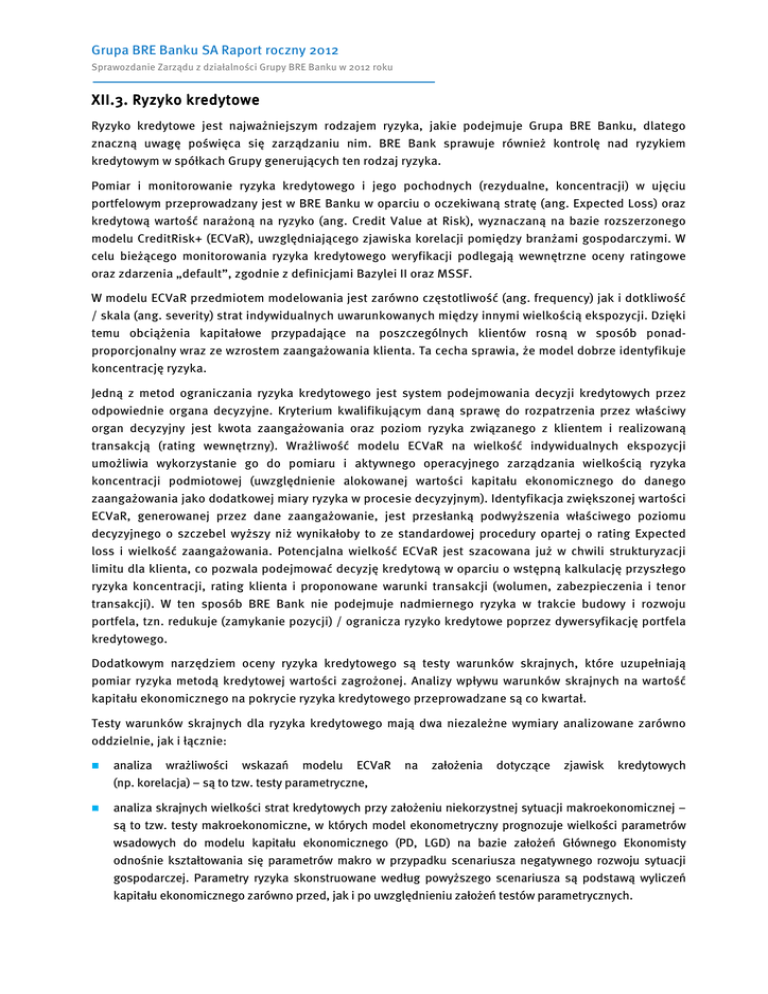 Grupa BRE Banku SA Raport roczny 2012 Sprawozdanie Zarządu z działalności Grupy BRE Banku w 2012 roku XII.3. Ryzyko kredytowe kre dytowe Ryzyko kredytowe jest najważniejszym rodzajem ryzyka, jakie podejmuje Grupa BRE Banku, dlatego znaczną uwagę poświęca się zarządzaniu nim. BRE Bank sprawuje również kontrolę nad ryzykiem kredytowym w spółkach Grupy generujących ten rodzaj ryzyka. Pomiar i monitorowanie ryzyka kredytowego i jego pochodnych (rezydualne, koncentracji) w ujęciu portfelowym przeprowadzany jest w BRE Banku w oparciu o oczekiwaną stratę (ang. Expected Loss) oraz kredytową wartość narażoną na ryzyko (ang. Credit Value at Risk), wyznaczaną na bazie rozszerzonego modelu CreditRisk+ (ECVaR), uwzględniającego zjawiska korelacji pomiędzy branżami gospodarczymi. W celu bieżącego monitorowania ryzyka kredytowego weryfikacji podlegają wewnętrzne oceny ratingowe oraz zdarzenia „default”, zgodnie z definicjami Bazylei II oraz MSSF. W modelu ECVaR przedmiotem modelowania jest zarówno częstotliwość (ang. frequency) jak i dotkliwość / skala (ang. severity) strat indywidualnych uwarunkowanych między innymi wielkością ekspozycji. Dzięki temu obciążenia kapitałowe przypadające na poszczególnych klientów rosną w sposób ponadproporcjonalny wraz ze wzrostem zaangażowania klienta. Ta cecha sprawia, że model dobrze identyfikuje koncentrację ryzyka. Jedną z metod ograniczania ryzyka kredytowego jest system podejmowania decyzji kredytowych przez odpowiednie organa decyzyjne. Kryterium kwalifikującym daną sprawę do rozpatrzenia przez właściwy organ decyzyjny jest kwota zaangażowania oraz poziom ryzyka związanego z klientem i realizowaną transakcją (rating wewnętrzny). Wrażliwość modelu ECVaR na wielkość indywidualnych ekspozycji umożliwia wykorzystanie go do pomiaru i aktywnego operacyjnego zarządzania wielkością ryzyka koncentracji podmiotowej (uwzględnienie alokowanej wartości kapitału ekonomicznego do danego zaangażowania jako dodatkowej miary ryzyka w procesie decyzyjnym). Identyfikacja zwiększonej wartości ECVaR, generowanej przez dane zaangażowanie, jest przesłanką podwyższenia właściwego poziomu decyzyjnego o szczebel wyższy niż wynikałoby to ze standardowej procedury opartej o rating Expected loss i wielkość zaangażowania. Potencjalna wielkość ECVaR jest szacowana już w chwili strukturyzacji limitu dla klienta, co pozwala podejmować decyzję kredytową w oparciu o wstępną kalkulację przyszłego ryzyka koncentracji, rating klienta i proponowane warunki transakcji (wolumen, zabezpieczenia i tenor transakcji). W ten sposób BRE Bank nie podejmuje nadmiernego ryzyka w trakcie budowy i rozwoju portfela, tzn. redukuje (zamykanie pozycji) / ogranicza ryzyko kredytowe poprzez dywersyfikację portfela kredytowego. Dodatkowym narzędziem oceny ryzyka kredytowego są testy warunków skrajnych, które uzupełniają pomiar ryzyka metodą kredytowej wartości zagrożonej. Analizy wpływu warunków skrajnych na wartość kapitału ekonomicznego na pokrycie ryzyka kredytowego przeprowadzane są co kwartał. Testy warunków skrajnych dla ryzyka kredytowego mają dwa niezależne wymiary analizowane zarówno oddzielnie, jak i łącznie: analiza wrażliwości wskazań modelu ECVaR (np. korelacja) – są to tzw. testy parametryczne, na założenia dotyczące zjawisk kredytowych analiza skrajnych wielkości strat kredytowych przy założeniu niekorzystnej sytuacji makroekonomicznej – są to tzw. testy makroekonomiczne, w których model ekonometryczny prognozuje wielkości parametrów wsadowych do modelu kapitału ekonomicznego (PD, LGD) na bazie założeń Głównego Ekonomisty odnośnie kształtowania się parametrów makro w przypadku scenariusza negatywnego rozwoju sytuacji gospodarczej. Parametry ryzyka skonstruowane według powyższego scenariusza są podstawą wyliczeń kapitału ekonomicznego zarówno przed, jak i po uwzględnieniu założeń testów parametrycznych. Grupa BRE Banku SA Raport roczny 2012 Sprawozdanie Zarządu z działalności Grupy BRE Banku w 2012 roku XII.3.1. Jakość portfela kredytowego Na dzień 31 grudnia 2012 roku, wśród kredytów i pożyczek (brutto) udzielonych klientom, należności, które utraciły wartość stanowiły 5,2% wobec 4,7% na koniec 2011 roku. Rezerwa utworzona na należności od klientów wzrosła z 2 388,3 mln zł na koniec grudnia 2011 roku do 2 528,5 mln zł na koniec 2012 roku, z czego 198,7 mln zł stanowiła rezerwa na poniesione nieujawnione straty (Incured but Not Idenified – IBNI) wobec 212,4 mln zł na koniec 2011 roku. Poziom pokrycia należności, które utraciły wartość rezerwami wyniósł 64,1% wobec 66,2% na koniec 2011 roku. W 2012 roku w BRE Banku spadła liczba wystawionych tytułów egzekucyjnych w stosunku do klientów korporacyjnych z 256 w 2011 roku do 208. Natomiast w Bankowości Detalicznej wystawiono 25 548 tytułów egzekucyjnych wobec 10 804 w 2011 roku. Poniższe zestawienie ukazuje jakość portfela kredytowego Grupy BRE Banku w podziale na grupy klientów na koniec 2012 roku w porównaniu z 2010 i 2011 rokiem. Bardziej szczegółowe informacje na temat jakości i koncentracji portfela kredytowego zawarte są w 0ch 3 i 22 Skonsolidowanego Sprawozdania Finansowego według Międzynarodowych Standardów Sprawozdawczości Finansowej za 2012 rok. Grupa BRE Banku SA Raport roczny 2012 Sprawozdanie Zarządu z działalności Grupy BRE Banku w 2012 roku Jakość portfela kredytowego Grupy BRE Banku 31.12.2012 31.12.2011 w mln zł w mln zł Należności od klientów - zaangażowanie brutto ogółem Należności bez utraty wartości Należności, które utraciły wartość 69 587,8 70 239,8 65 955,5 66 953,0 3 632,3 3 286,8 5,2% 4,7% 2 528,5 2 388,3 198,7 212,4 2 329,8 2 175,9 64,1% 66,2% 3,6% 3,4% 37 816,5 38 689,0 36 510,1 37 675,5 1 306,4 1 013,5 3,5% 2,6% 28 405,4 27 890,3 26 079,5 25 618,4 2 325,9 2 271,9 8,2% 8,1% 3 365,9 3 660,5 3