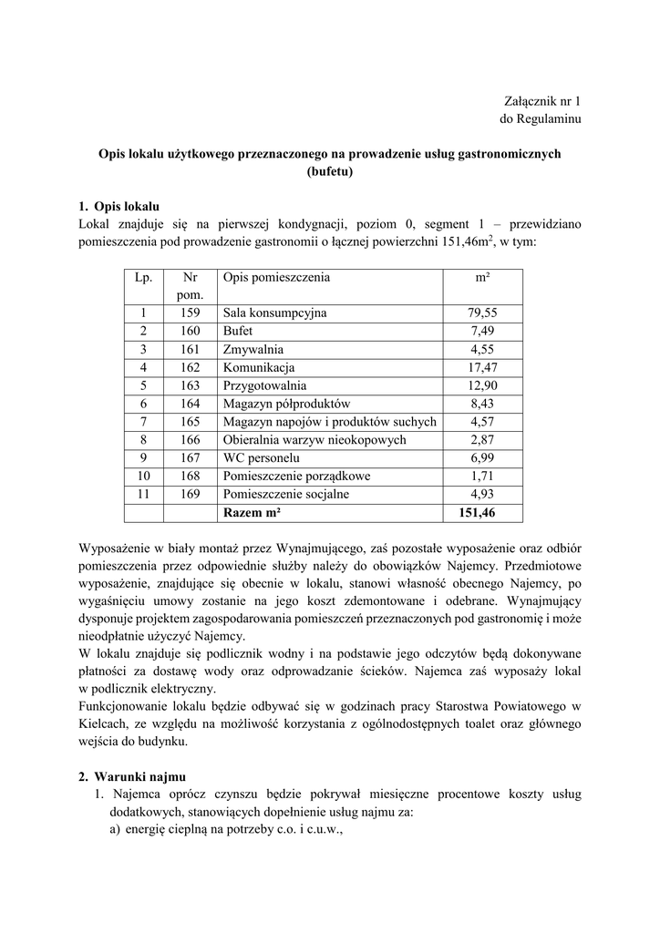 Załącznik nr 1 do Regulaminu Opis lokalu użytkowego przeznaczonego na prowadzenie usług gastronomicznych (bufetu) 1. Opis lokalu Lokal znajduje się na pierwszej kondygnacji, poziom 0, segment 1 – przewidziano pomieszczenia pod prowadzenie gastronomii o łącznej powierzchni 151,46m2, w tym: Lp. 1 2 3 4 5 6 7 8 9 10 11 Nr pom. 159 160 161 162 163 164 165 166 167 168 169 Opis pomieszczenia Sala konsumpcyjna Bufet Zmywalnia Komunikacja Przygotowalnia Magazyn półproduktów Magazyn napojów i produktów suchych Obieralnia warzyw nieokopowych WC personelu Pomieszczenie porządkowe Pomieszczenie socjalne Razem m² m² 79,55 7,49 4,55 17,47 12,90 8,43 4,57 2,87 6,99 1,71 4,93 151,46 Wyposażenie w biały montaż przez Wynajmującego, zaś pozostałe wyposażenie oraz odbiór pomieszczenia przez odpowiednie służby należy do obowiązków Najemcy. Przedmiotowe wyposażenie, znajdujące się obecnie w lokalu, stanowi własność obecnego Najemcy, po wygaśnięciu umowy zostanie na jego koszt zdemontowane i odebrane. Wynajmujący dysponuje projektem zagospodarowania pomieszczeń przeznaczonych pod gastronomię i może nieodpłatnie użyczyć Najemcy. W lokalu znajduje się podlicznik wodny i na podstawie jego odczytów będą dokonywane płatności za dostawę wody oraz odprowadzanie ścieków. Najemca zaś wyposaży lokal w podlicznik elektryczny. Funkcjonowanie lokalu będzie odbywać się w godzinach pracy Starostwa Powiatowego w Kielcach, ze względu na możliwość korzystania z ogólnodostępnych toalet oraz głównego wejścia do budynku. 2. Warunki najmu 1. Najemca oprócz czynszu będzie pokrywał miesięczne procentowe koszty usług dodatkowych, stanowiących dopełnienie usług najmu za: a) energię cieplną na potrzeby c.o. i c.u.w., b) wywóz nieczystości stałych, c) przeglądy i konserwacje instalacji niskoprądowych, d) przeglądy i konserwacje urządzeń ppoż., e) przeglądy i konserwacje dźwigów osobowych, f) przeglądy i konserwacje wentylacji i klimatyzacji, g) przeglądy i konserwacje urządzeń i instalacji elektrycznej, h) przeglądy i konserwację instalacji i urządzeń wod.-kan., i) przeglądy techniczne budynku, j) ochronę budynku, k) utrzymanie terenu zewnętrznego (parkingi, ciągi komunikacyjne), l) utrzymanie zimowe dachów, m) mycie okien zewnętrznych oraz fasady budynku. 2. Najemca oprócz czynszu i opłat, o których mowa w pkt 1 powyżej, będzie również pokrywał wg wskazań podliczników opłaty za: a) energię elektryczną (dystrybucja i przemysł), b) dostawę wody, c) odprowadzenie ścieków. 3. Najemca będzie zobowiązany do ponoszenia we własnym zakresie opłat za: a) abonament RTV, b) ubezpieczenie mienia, c) korzystanie z mediów, np. opłaty telefoniczne wg potrzeb Najemcy – na podstawie zawartych odrębnych umów oraz/lub na podstawie billingu, w przypadku korzystania z centrali telefonicznej Wynajmującego, d) uiszczenia podatku od nieruchomości wg obowiązujących w tym zakresie przepisów.