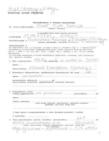 ' J t 2 q d S k a < b o M > k E ~( v właściwy u r z ą d skarbowy Oświadczenie o stanie majątkowym Ja, niżej podpisanyfaj ,..iii n i r . .P u ? l r . .. (imiona i nazwisko) (w przypadku kobiet podać nazwisko panieńskie) ± 3 .1 ^ ..r-.« urodzony fa) trudniony M -r J .................. . T P ^ O O O n S '. P .Y n (mieisce zatrudniania. stanowisko Inh fnnlrn-ia^ * zamieszkały (a-) w . po zapoznaniu się z przepisami ustany iz ania^i sierpnia r- o prowadzenia działalności gospodarczej.'przez osoby pełniące funkcje (Dz.U. z 2006 r. Nr 216, poz. 1584, z późn. zm.), zgodnie z art. 10 oświadczam, że posiadam wchodzące w skład małżeńskiej wspólności ustawowej lub mój majątek odrębny: 1. Dom o powierzchnii: d Í 3 f. % *2, położony.. ilO. . ’'nfY?'fżC? YQ- TCb*j ........ ograniczeniu publiczne tej ustawy stanowiące OP . 0. C. . . .S d / Í P adres:... tytuł prawny: .frJO.StfGSĆ. .0?.t?C . 2. . .P ' Mieszkanie (własnościowe, spółdzielcze własnościowe lub inne):....[W PP. adres: .. O-śdp^CYT)........................................... powierzchnia całkowita: m2 tytuł prawny (własność, współwłasność, wielkość udziału): 3. Gospodarstwo rolne: .t . ^ , rodzaj gospodarstwa: ]. .....£-??. 335?. V? Y Y71......... powierzchnia m2 adres: ....... rodzaj zabudowy: tytuł prawny (własność, współwłasność, użytkowanie wieczyste, dzierżawa, inny tytuł, podać jaki): Z tego tytułu osiągnąłem(ęłam) w roku ubiegłym przychód i dochód w wysokości: /-k/ 4. Inne nieruchomości (place, działki): powierzchnia: ( j O T V.... o k i o T t c i _ p j [q o y j p . . o . V P . .. .. . p d p . (adres, tytuł prawny: własność, współwłasność, inńy tytuł - podać jaki r r .. . - . . 3 / 3 ... m2 . 5. Zasoby pieniężne: - środki pieniężne zgromadzone w walucie polskie j a a ,.poLi/y^ n r.. f f <QQ .Vt« Ni .V. r. .rr . U s, . ./. . .K . środki pieniężne zgromadzone w walucie obcej: r? !& . . p o i f a j d & r y y - papiery wartościowe: ......................................... na kwotę:.............................. II Nabyłem(am) (nabył mój małżonek) mienie od Skarbu Państwa, innej państwowej osoby prawnej, jednostek samorządu terytorialnego, ich związków lub od komunalnej osoby prawnej, które podlegało zbyciu w drodze przetargu: tok* nie* Podać rodzaj mienia, datę nabycia, od kogo....................................... III l.a* Nie jestem członkiem zarządu ani rady nadzorczej, komisji rewizyjnej spółki prawa handlowego, ani też członkiem zarządu fundacji prowadzące] działalność gospodarczą. -te-*— J e stem— c z ł o nkiem— zarządu ,— rady— B ad z o r e -za-j— lub— komis j i— r e w i z y j n e ]— spółki— p r a w a h a n d l o w e g o ,— c z łonkiem— za rządu— f u n d a c j i— p r o w a d z ą c e j — dz-i-a-ła 1 no ś ó— g ospodarea-ą : (wymienić pełnione funkcje i stanowiska wraz z nazwami spółek i fundacji) Z tego tytułu osiągnąłem(ęłam) w roku ubiegłym dochód w wysokości: ........ 2. a* Nie jestem zatrudniony(a) ani też nie wykonuję innych zajęć w spółkach prawa handlowego, które mogłyby wywołać podejrzenie o moją stronniczość lub interesowność, łr*— W— spółkach— prawa— handlowego— wykonuję— m i e j — wymienione— zajęcia : Z tego tytułu osiągnąłem(ęłam) w roku ubiegłym dochód w wysokości: 2 3. a* Nie jestem członkiem zarządu, rady nadzorczej ani komisji rewizyjnej spółdzielni.[1] te*— Je s te m c z ł o n k i e m zarządu,— r ad y n a d z o r c z o j— l u b komisji rewizyjnej— sp ó ł d z r eln i ;— (podać pełnioną funkcję, nazwę i adres spółdzielni) Z tego tytułu osiągnąłem(ęłam) w roku ubiegłym dochód w wysokości:......... 4. W następujących spółkach prawa handlowego posiadam niżej podane udziały lub akcje: . . T ? . P.P. ^0..................................................................................................... (nazwa spółki - adresy, wielkość udziałów, ilość akcji) Z tego tytułu osiągnąłem (ęłam) w roku ubiegłym dochód w wysokości: lCVi2 . ^ ^ Równocześnie oświadczam, że w spółce............................................. moje udziały (lub akcje) przekraczają 10%. W pozostałych spółkach prawa handlowego posiadane udziały lub akcje nie stanowią 10% kapitału. IV 1. Nie prowadzę działalności gospodarczej na własny rachunek ani wspólnie z innymi osobami, nie zarządzam również taką działalnością ani nie jestem przedstawicielem czy też pełnomocnikiem w prowadzeniu takiej działalności. [2] -2-— Prowadzę-w -wyżej— określony sposób działalność polegającą na: Z tego tytułu osiągnąłem (ęłam) w roku ubiegłym dochód w wysokości:............... 3 V Składniki mienia ruchomego o wartości powyżej 10.000 złotych (w przypadku pojazdów mechanicznych należy podać markę, model i rok produkcji): i. OChoO O % .. . ' i ? .Pk.^Q. • f o k _p f& ćt . A<OrOĆO zjp\cł? /Ta c ?ow ) *0 . ..fJooŁ. r<?K Pfęx},k003m A^hQr)oici o t p T o . jkO ^^ > 00V .a lp in e b VI Zobowiązania pieniężne o wartości powyżej 10 000 złotych, w tym zaciągnięte kredyty i pożyczki oraz warunki, na jakich zostały udzielone (wobec kogo, w związku z jakim zdarzeniem, w jakiej wysokości): /I p ? V . cAAf- ^X\ _ uo&et&n*n .......... -.p?ęz. 5 3 % r ^ 4 4 44 1 / ? ? ? - . th jfiskf& Y X rafo -’ j a ■ ■a t f e c W ’ 5 .r? ^O H p P 'y.Ç !? h.-S>t2ZQ(lQ K rił ¿?tofo  o sć&zr cf<2t<3 z n r o t y ; ' ^ r i o ^ K .............. ;............ VII Inne dodatkowe dane o stanie majątkowym: . Tl V?.0,”/t4. . . r y f^ - k c Q ^ . Q f . . . V . . . . . .P r A O O .^ b ^ . l e / o o e h'posł...h0?A. Sr,..!?<?-.. ok\e.^?. .. 2>. .n?! .. ri Ç. .O ^ Q ^ V ^ c O .W \ . ro i 4?,. u fe .. f. 3>2 ]eV Z tego tytułu osiągnąłem(ęłam) w roku ubiegłym dochód w wy,.okości: ,rp £ . Powyższe oświadczenie składam świadomy(