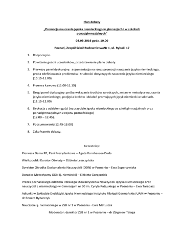 Plan debaty „Promocja nauczania języka niemieckiego w gimnazjach i w szkołach ponadgimnazjalnych” 08.09.2016 godz. 10.00 Poznań, Zespół Szkół BudownictwaNr 1, ul. Rybaki 17 1. Rozpoczęcie. 2. Powitanie gości i uczestników, przedstawienie planu debaty. 3. Pierwszy panel dyskusyjny: argumentacja na rzecz promocji nauczania języka niemieckiego, próba zdefiniowania problemów i trudności dotyczących nauczania języka niemieckiego (10.15-11.00) 4. Przerwa kawowa (11.00-11.15) 5. Drugi panel dyskusyjny: próba wskazania środków zaradczych, zmian w metodyce nauczania języka niemieckiego, podjęcia kroków i działań promujących język niemiecki w szkołach. (11.15-12.00) 6. Dyskusja z udziałem gości (nauczyciele języka niemieckiego ze szkół gimnazjalnych oraz ponadgimnazjalnych z rejonu poznańskiego) (12.00 – 12.45). 7. Podsumowanie(12.45-13.00) 8. Zakończenie debaty. Uczestnicy: Pierwsza Dama RP, Pani Prezydentowa – Agata Kornhauser-Duda Wielkopolski Kurator Oświaty – Elżbieta Leszczyńska Dyrektor Ośrodka Doskonalenia Nauczycieli (ODN) w Poznaniu – Ewa Superczyńska Doradca Metodyczny ODN (j. niemiecki) – Elżbieta Gorączniak Prezes poznańskiego oddziału Polskiego Stowarzyszenia Nauczycieli Języka Niemieckiego oraz nauczyciel j. niemieckiego w Gimnazjum nr 60 im. Cyryla Ratajskiego w Poznaniu – Ewa Tarabasz Adiunkt w Zakładzie Dydaktyki Języka Niemieckiego Instytutu Filologii Germańskiej UAM w Poznaniu – dr Renata Rybarczyk Nauczyciel j. niemieckiego w ZSB nr 1 w Poznaniu - Ewa Matuszak Moderator: dyrektor ZSB nr 1 w Poznaniu – dr Zbigniew Talaga