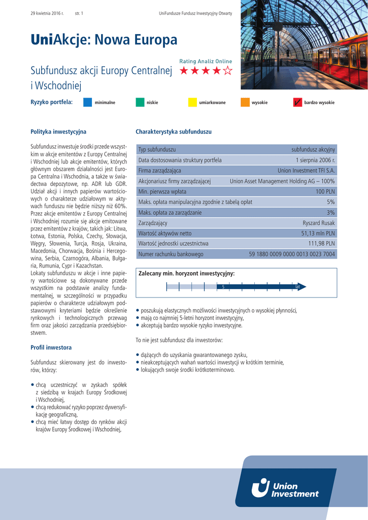 29 kwietnia 2016 r. str. 1 UniFundusze Fundusz Inwestycyjny Otwarty UniAkcje: Nowa Europa Subfundusz akcji Europy Centralnej i Wschodniej Ryzyko portfela: minimalne Polityka inwestycyjna Subfundusz inwestuje środki przede wszystkim w akcje emitentów z Europy Centralnej i Wschodniej lub akcje emitentów, których głównym obszarem działalności jest Europa Centralna i Wschodnia, a także w świadectwa depozytowe, np. ADR lub GDR. Udział akcji i innych papierów wartościowych o charakterze udziałowym w aktywach funduszu nie będzie niższy niż 60%. Przez akcje emitentów z Europy Centralnej i Wschodniej rozumie się akcje emitowane przez emitentów z krajów, takich jak: Litwa, Łotwa, Estonia, Polska, Czechy, Słowacja, Węgry, Słowenia, Turcja, Rosja, Ukraina, Macedonia, Chorwacja, Bośnia i Hercegowina, Serbia, Czarnogóra, Albania, Bułgaria, Rumunia, Cypr i Kazachstan. Lokaty subfunduszu w akcje i inne papiery wartościowe są dokonywane przede wszystkim na podstawie analizy fundamentalnej, w szczególności w przypadku papierów o charakterze udziałowym podstawowymi kryteriami będzie określenie rynkowych i technologicznych przewag firm oraz jakości zarządzania przedsiębiorstwem. niskie umiarkowane wysokie bardzo wysokie Charakterystyka subfunduszu Typ subfunduszu subfundusz akcyjny Data dostosowania struktury portfela 1 sierpnia 2006 r. Firma zarządzająca Union Investment TFI S.A. Akcjonariusz firmy zarządzającej Union Asset Management Holding AG – 100% Min. pierwsza wpłata 100 PLN Maks. opłata manipulacyjna zgodnie z tabelą opłat 5% Maks. opłata za zarządzanie 3% Zarządzający Ryszard Rusak Wartość aktywów netto 51,13 mln PLN Wartość jednostki uczestnictwa 111,98 PLN Numer rachunku bankowego 59 1880 0009 0000 0013 0023 7004 Zalecany min. horyzont inwestycyjny: 5 •poszukują elastycznych możliwości inwestycyjnych o wysokiej płynności, •mają co najmniej 5-letni horyzont inwestycyjny, •akceptują bardzo wysokie ryzyko inwestycyjne. To nie jest subfundusz dla inwestorów: Profil inwestora Subfundusz skierowany jest do inwestorów, którzy: •chcą uczestniczyć w zyskach spółek z siedzibą w krajach Europy Środkowej i Wschodniej, •chcą redukować ryzyko poprzez dywersyfikację geograficzną, •chcą mieć łatwy dostęp do rynków akcji krajów Europy Środkowej i Wschodniej, lat • dążących do uzyskania gwarantowanego zysku, • nieakceptujących wahań wartości inwestycji w krótkim terminie, • lokujących swoje środki krótkoterminowo. 29 kwietnia 2016 r. str. 2 UniFundusze Fundusz Inwestycyjny Otwarty UniAkcje: Nowa Europa Subfundusz akcji Europy Centralnej i Wschodniej Ryzyko portfela: minimalne niskie umiarkowane wysokie bardzo wysokie Wyniki inwestycyjne subfunduszu i benchmarku* UniAkcje: Nowa Europa (%) 1m 3m 6m 1 rok 2 lata 5 lat 10 lat 3,46 12,41 8,09 3,74 21,98 3,97 – Lut ’15 Wrz ’15 * Stopy zwrotu subfunduszu i benchmarku obliczane są na podstawie ostatnich dni roboczych miesiąca. Zmiana wartości jednostki UniAkcje: Nowa Europa 102 97 92 87 82 77 72 Kwi ’11 Lis ’11 Cze ’12 Gru ’12 Lip ’13 Sty ’14 Sie ’14 Alokacja aktywów Kwi ’16 Benchmark1 Akcje i inne instrumenty udziałowe 100,00% 0 20 40 60 80 Brak 100 ¹ Wzorcowy portfel, który stanowi punkt odniesienia do dokonywania oceny wyników zarządzania aktywami funduszu. 29 kwietnia 2016 r. str. 3 UniFundusze Fundusz Inwestycyjny Otwarty UniAkcje: Nowa Europa Subfundusz akcji Europy Centralnej i Wschodniej Ryzyko portfela: minimalne niskie Alokacja geograficzna portfela akcyjnego umiarkowane Alokacja sektorowa portfela akcyjnego Beta do benchmarku – współczynnik ten pokazuje zależność pomiędzy zmianami wartości jednostki funduszu a benchmarku. Wskaźnik beta wynoszący 1 oznacza, że zmiany wartości jednostki funduszu są takie same jak benchmarku, co sugeruje, że skład instrumentów funduszu jest tożsamy ze składem instrumentów w benchmarku. Beta o wartości mniejszej niż 1 oznacza, że wzrost (spadek) benchmarku o 1% jest zazwyczaj powiązany ze wzrostem (spadkiem) wartości jednostki funduszu o mniej niż 1%. Wartość beta większa niż 1 oznacza, że wzrost (spadek) benchmarku o 1% jest zazwyczaj powiązany ze wzrostem (spadkiem) wartości jednostki funduszu o więcej niż 1%. Paliwa 4,03% Przemysł 4,73% Technologie 7,32% Turcja 35,95% Dobra kons. 11,71% Surowce 12,01% Usługi 12,65% Polska 48,87% Finanse 44,51% Struktura walutowa PLN TRY EUR HUF CZK 50,13% 35,95% 6,44% 4,44% 3,04% 0 20 Współczynniki ryzyka 12 m Beta do benchmarku Beta do WIG Information ratio Tracking error – 0,69 – – Współczynnik Sharpe’a 0,18 Odchylenie standardowe 12,63% 40 60 80 bardzo wysokie Słowniczek Użyteczność pub. 1,23 Ochrona zdrowia 1,81% Inne 15,18% wysokie 100 Beta do WIG – współczynnik ten pokazuje zależność pomiędzy zmianami wartości jednostki funduszu a zmianami indeksu WIG. Wskaźnik beta wynoszący 1 oznacza, że zmiany wartości jednostki funduszu są takie same jak indeksu WIG. Beta o wartości mniejszej niż 1 oznacza, że wzrost (spadek) benchmarku o 1% jest zazwyczaj powiązany ze wzrostem (spadkiem) wartości indeksu WIG o mniej niż 1%. Wartość beta większa niż 1 oznacza, że wzrost (spadek) indeksu WIG o 1% jest zazwyczaj powiązany ze wzrostem (spadkiem) wartości jednostki funduszu o więcej niż 1%. Information ratio – współczynnik ten pokazuje, jak opłacalne jest ryzyko, jakie ponosi fundusz w stosunku do swojego benchmarku. Im wyższy poziom wskaźnika information ratio, tym przy niższym nakładzie ryzyka w stosunku do benchmarku został osiągnięty wynik funduszu. Fundusz, który osiąga information ratio powyżej 0,3, uważany jest za efektywnie zarządzany. Tracking error – współczynnik ten pokazuje, jak ryzykowny jest dany fundusz w stosunku do swojego benchmarku. Im wyższy wskaźnik, tym bardziej agresywnie zarządzany jest fundusz w stosunku do swojego benchmarku. Wskaźnik