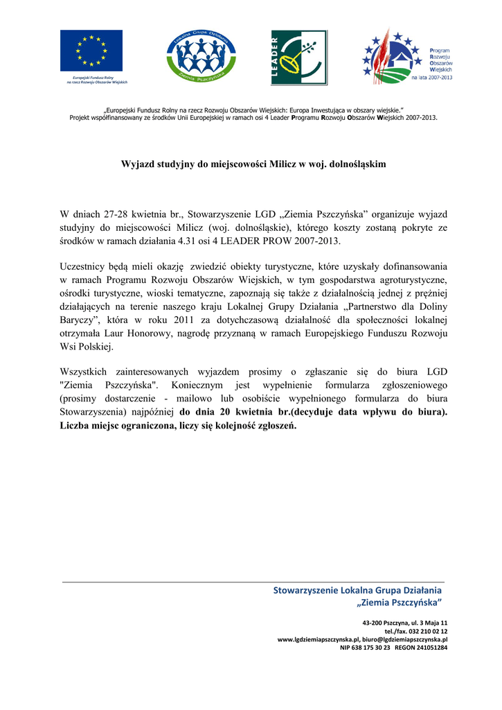 Europejski Fundusz Rolny na rzecz Rozwoju Obszarów Wiejskich „Europejski Fundusz Rolny na rzecz Rozwoju Obszarów Wiejskich: Europa Inwestująca w obszary wiejskie.” Projekt współfinansowany ze środków Unii Europejskiej w ramach osi 4 Leader Programu Rozwoju Obszarów Wiejskich 2007-2013. Wyjazd studyjny do miejscowości Milicz w woj. dolnośląskim W dniach 27-28 kwietnia br., Stowarzyszenie LGD „Ziemia Pszczyńska” organizuje wyjazd studyjny do miejscowości Milicz (woj. dolnośląskie), którego koszty zostaną pokryte ze środków w ramach działania 4.31 osi 4 LEADER PROW 2007-2013. Uczestnicy będą mieli okazję zwiedzić obiekty turystyczne, które uzyskały dofinansowania w ramach Programu Rozwoju Obszarów Wiejskich, w tym gospodarstwa agroturystyczne, ośrodki turystyczne, wioski tematyczne, zapoznają się także z działalnością jednej z prężniej działających na terenie naszego kraju Lokalnej Grupy Działania „Partnerstwo dla Doliny Baryczy”, która w roku 2011 za dotychczasową działalność dla społeczności lokalnej otrzymała Laur Honorowy, nagrodę przyznaną w ramach Europejskiego Funduszu Rozwoju Wsi Polskiej. Wszystkich zainteresowanych wyjazdem prosimy o zgłaszanie się do biura LGD "Ziemia Pszczyńska". Koniecznym jest wypełnienie formularza zgłoszeniowego (prosimy dostarczenie - mailowo lub osobiście wypełnionego formularza do biura Stowarzyszenia) najpóźniej do dnia 20 kwietnia br.(decyduje data wpływu do biura). Liczba miejsc ograniczona, liczy się kolejność zgłoszeń. Stowarzyszenie Lokalna Grupa Działania „Ziemia Pszczyńska” 43-200 Pszczyna, ul. 3 Maja 11 tel./fax. 032 210 02 12 www.lgdziemiapszczynska.pl, [email protected] NIP 638 175 30 23 REGON 241051284 Europejski Fundusz Rolny na rzecz Rozwoju Obszarów Wiejskich „Europejski Fundusz Rolny na rzecz Rozwoju Obszarów Wiejskich: Europa Inwestująca w obszary wiejskie.” Projekt współfinansowany ze środków Unii Europejskiej w ramach osi 4 Leader Programu Rozwoju Obszarów Wiejskich 2007-2013. PROGRAM WYJAZDU: Dzień I około 7.00 – wyjazd z Pszczyny około 11.00 – przyjazd do Milicza 11.15 – 13.45 – restauracja Parkowa w Miliczu * serwis kawowy (kawa, herbata, ciastko) * prezentacja Stowarzyszenia LGD i LGR „Partnerstwo dla Doliny Baryczy” 1/ - możliwości otrzymania wsparcia na działania związane z rozwojem oferty turystycznej w tym agroturystycznej w Dolinie Baryczy w świetle LSR – Inga Demianiuk – Ozga – prezes zarządu 2/ - spójny system promocji „Dolina Baryczy Poleca” - przykład wspierania aktywności gospodarczej producentów i usługodawców tworzących spójną przyjazną środowisku ofertę turystyczną wysokiej jakości w Dolinie Baryczy - Marta Kamińska – sekretarz zarządu, specjalista ds. promocji, koordynator systemu „Dolina Baryczy Poleca” 14.00 – 14.45 – obiad, Restauracja „Parkowa” w Miliczu, www.parkowarestauracja.pl Prezentacja oferty Restauracji „Parkowa” - Dariusz Moczulski - beneficjent środków z Programu Rozwoju Obszarów Wiejskich 2007 –2013 (Małe Projekty przez LGD) 15.00 - 15.45 - wizyta w obiekcie „Pokoje Gościnne” w Miliczu – Małgorzata Krzyżoszczak -beneficjent środków z Programu Rozwoju Obszarów Wiejskich 2007 – 2013 (Tworzenie i Rozwój Mikroprzedsiębiorstw, Małe Projekty przez LGD) 16.45 – 17.45 – Gospodarstwo agroturystyczne Agro Spa Chynowa – Aneta Matłoka – innowacyjne "luksusowe" wykorzystanie potencjału wsi (beneficjent środków z Programu Rozwoju Obszarów Wiejskich 2007 – 2013, Agencja Restrukturyzacji i Modernizacji Rolnictwa) 18.00 - 21:00 wizyta w Przygodziczkach – „wiosce przygód” - przykład wioski z pomysłem i współpracy w ramach gospodarstw agroturystycznych (przykład sieciowania); Ośrodek Jeździecki „Jurand” - beneficjent środków z Programu Rozwoju Obszarów Wiejskich 2007 – 2013 (Tworzenie i Rozwój Mikroprzedsiębiorstw, Małe Projekty przez LGD), prezentacja gospodarstwa/oferty wioski Przygód, -biesiada/kolacja 22.00 – powrót na miejsce zakwaterowania „Zagroda Grabownica”, Grabownica k./Krośnic Stowarzyszenie Lokalna Grupa Działania „Ziemia Pszczyńska” 43-200 Pszczyna, ul. 3 Maja 11 tel./fax. 032 210 02 12 www.lgdziemiapszczynska.pl, [email protected] NIP 638 175 30 23 REGON 241051284 Europejski Fundusz Rolny na rzecz Rozwoju Obszarów Wiejskich „Europejski Fundusz Rolny na rzecz Rozwoju Obszarów Wiejskich: Europa Inwestująca w obszary wiejskie.” Projekt współfinansowany ze środków Unii Europejskiej w ramach osi 4 Leader Programu Rozwoju Obszarów Wiejskich 2007-2013. Dzień II 7.00 – 8.00 śniadanie 8.00 – prezentacja oferty Ośrodka „Zagroda Grabownica” - Jolanta Bogatsu - beneficjent środków z Programu Rozwoju Obszarów Wiejskich 2007 – 2013 (Tworzenie i Rozwój Mikroprzedsiębiorstw, Małe Projekty przez LGD) 9.30 - Lędzina – wioski smaków i rzemiosł, poczęstunek na trawie z własnych produktów (pieczywo, sery, wędliny, przetwory - użytkownik Znaku „Dolina Baryczy Poleca”) - zwiedzanie gospodarstwa rolnego Beaty Piekalskiej, zajmującej się hodowlą owiec i bydła, oferującej szeroką gamę warsztatów rzemieślniczych - użytkownik znaku "Dolina Baryczy Poleca" 11.00 - wizyta w Gospodarstwie "Żuraw i Czapla" we Wróblincu – Agata Benke – Buchaniewicz - (użytkownik Znaku „Dolina Baryczy Poleca”) jako przykład „pięciogwiazdkowego” gospodarstwa agroturystycznego o zachowanym wiejskim klimacie i architekturze miejsca, skierowanego do określonej grupy odbiorców. 13.00 - Wizyta w Gospodarstwie Agroturystycznym "Głowaczówka" – Janina Głowacz (użytkownik Znaku „Dolina Baryczy Poleca”) w Rudzie Sułowskiej, zapoznanie z historią gospodarstwa. 13.30 – obiad, pożegnanie i wyjazd do Pszczyny Organizator zapewnia transport, zakwaterowanie i wyżywienie. Z przyczyn od Organizatora niezależnych Organizator zastrzega sobie prawo do zmian