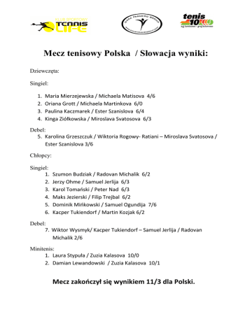 Mecz tenisowy Polska / Słowacja wyniki: Dziewczęta: Singiel: 1. 2. 3. 4. Maria Mierzejewska / Michaela Matisova 4/6 Oriana Grott / Michaela Martinkova 6/0 Paulina Kaczmarek / Ester Szanislova 6/4 Kinga Ziółkowska / Miroslava Svatosova 6/3 Debel: 5. Karolina Grzeszczuk / Wiktoria Rogowy- Ratiani – Miroslava Svatosova / Ester Szanislova 3/6 Chłopcy: Singiel: 1. 2. 3. 4. 5. 6. Szumon Budziak / Radovan Michalik 6/2 Jerzy Ohme / Samuel Jerlija 6/3 Karol Tomański / Peter Nad 6/3 Maks Jezierski / Filip Trejbal 6/2 Dominik Mińkowski / Samuel Ogundija 7/6 Kacper Tukiendorf / Martin Kozjak 6/2 Debel: 7. Wiktor Wysmyk/ Kacper Tukiendorf – Samuel Jerlija / Radovan Michalik 2/6 Minitenis: 1. Laura Stypuła / Zuzia Kalasova 10/0 2. Damian Lewandowski / Zuzia Kalasova 10/1 Mecz zakończył się wynikiem 11/3 dla Polski. Turniej Tenis10 kategoria zielona wyniki: Dziewczęta: I miejsce - Oriana Grott KT „TenisWil” Wilanów II miejsce – Michaela Martinkova III miejsce – Ester Szanislova Chłopcy: I miejsce - Maks Jezierski KT „Dada Paradiso Team” Krosno II miejsce - Jurek Ohme KS „Tennis Life” Brwinów III miejsce - Radovan Michalik i Peter Nad TK „Mladost” Koszyce W kategorii zielonej wystąpiło 23 dziewcząt i chłopców z Koszyc, Przemyśla, Rzeszowa, Krosna, Brwinowa i Warszawy. Turniej Tenis10 kategoria niebieska wyniki: I miejsce – Szymon Maciejewski II miejsce - Zuzia Batorska III miejsce - Oskar Maciejewski