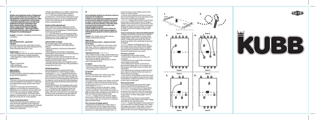 IS Útileikur með viðarkeilum gerður af víkingunum! Kubb er vinsæll útileikur þar sem takmarkið er að fella Kubbkeilur með því að henda kefli í þær. Felldu viðarkeilurnar og kóngakeiluna en farðu varlega – ef þú fellir kóngakeiluna áður en þú fellir hinar Kubbkeilurnar þá sigrar andstæðingur þinn! Kubb er blanda af keilu, skeifukasti og skák. Leikinn er hægt að spila bæði sem liðakeppni eða einstaklingskeppni – Kubb tryggir frábæra útiskemmtun hvort sem valið er að spila leikinn í liðakeppni eða einstaklingskeppni! Innihald: 1 kóngakeila, 10 Kubbkeilur, 6 kefli til að kasta, 4 merkistikur Leikreglur Áður en leikurinn hefst... uppsetning! Leikvöllur: Leikvöllurinn skal vera á jöfnu svæði, leikinn má spila á grasi, sandi, í drullu eða í snjó. Notið merkistikurnar til að merkja rétthyrndan leikvöll (4m X 5-6m). Upphafsstaða: (sjá mynd 1) - Setjið 5 Kubbkeilur í beina röð við endalínur leikvallarins. Þessar raðir af Kubbkeilum eru kallaðar grunnkeilur. - Setjið kóngakeiluna á miðjan leikvöllinn (mitt á milli endalínanna). Lið: • Skiptið í tvö jafnsterk lið. • Veljið vallarhelming. • Veljið hvort liðið byrjar leikinn! Hefjum leikinn! Takmark leiksins: Að verða fyrsta liðið til að fella allar Kubbkeilur hins liðsins og síðan að fella kóngakeiluna. Upphaf leiksins: • Lið A tekur sér stöðu hjá sínum grunnkeilum og kastar 4 keflum að Kubbkeilum liðs B. Keflunum er alltaf kastað með undirhandarkasti þannig að keflin snúist í loftinu (sjá mynd 2). • Þegar lið A er búið að gera skal lið B henda þeim Kubbkeilum sem lið A felldi yfir á vallarhelming liðs A. Kubbkeilunum sem er kastað yfir eru reistar á þeim stað sem þær lentu. Þessar keilur eru kallaðar vallarkeilur. • Mynd 3: Liði A tekst að fella B1. Lið B hendir nú þeirri Kubbkeilu á vallarhelming liðs A, hún er síðan reist upp á þeim stað sem hún lenti. B1 er núna vallarkeila. Og nú er komið að hinu liðinu! • Lið B fær nú 6 kefli til að kasta frá endalínunni. Lið B verður að fella allar vallarkeilurnar áður en það getur einbeitt sér að því að fella grunnlínukeilur liðs A (Athugið: Í fyrstu umferð leiksins eru 4 kefli notuð en í næstu umferðum eru notuð 6 kefli). • Athugið; allar Kubbkeilur sem eru felldar á vallarhelmingi Liðs A og endalínu er kastað á vallarhelming Liðs B. • Mynd 4: Lið B verður að fella B1 áður en miðað er á grunnkeilur liðs A. Lið B reynir þetta og fella bæði A2 og A5. Núna þarf lið A að kasta B1, A2 og A5 á vallarhelming liðs B. Lið A verður að fella allar þessar 3 vallarkeilur áður en miðað er á grunnkeilur liðs B. Mistókst að fella vallarkeilurnar? Ef liði A mistekst að fella allar vallakeilurnar sínar fær lið B forskot. Í næstu umferð fær lið B nýjan kaststað: Sú Kubbkeila sem er næst kóngakeilunni á vallarhelmingi liðs B sýnir nýjan kaststað liðs B. Mynd 5: Lið A fellir aðeins A2 og mistekst þannig að fella allar Vallarkeilurnar. Lið B kastar A2 á vallarhelmingi liðs A. Kubburinn sem er næstur Kóngakeilunni (A5) sýnir nýjan kaststað fyrir lið B í næstu umferð á eftir. Leikurinn heldur svo áfram! Hér eru nokkrar reglur í viðbót til að hafa í huga: • Ef staðið er við hliðarlínur er ekki leyfilegt að kasta keflunum. • Föllnum grunnkeilum er alltaf kastað á leiksvæðið frá endalínunni. • Fallnar Kubbkeilur verða að lenda á vallarhelmingi andstæðingsins. Ef þær lenda á þínum vallarhelming kastar þú þeim aftur frá þinni grunnlínu. • Ef Kubbkeilu sem hefur verið kastað lendir fyrir utan leikvöllinn setur þú hana aftur inn á svæðið sem samsvarar breidd einnar keilu frá útjaðri vallarins. • Ef þú fellir grunnkeilu áður en allar vallarkeilurnar hafa verið felldar, lýkur þinni umferð strax. Fallna grunnkeilan er reist upp aftur á sínum stað. Að fella kóngakeiluna: Leikur heldur áfram þar til annað eða bæði lið hafa fellt allar Kubbkeilurnar á vallarhelmingi og endalínu andstæðingsins (sjá mynd 6). Þegar liði hefur tekist þetta reynir það því næst að fella kóngakeiluna. Hins vegar má aðeins reyna það einu sinni í hverri umferð. Athugið að öll köst sem reynd eru til að fella kóngakeiluna skulu fara fram við endalínuna. Um leið og liði tekst að fella kóngakeiluna hefur það sigrað leikinn! Ef ekki tekst að fella hana heldur leikurinn áfram. Ef annað liðið fellir óvart niður kóngakeiluna áður en allar Kubbkeilurnar eru felldar, tapar það lið leiknum sjálfkrafa. Mynd 6: Lið B kastar frá nýja kaststaðnum (merkt með keilu A5) og fellir niður allar 4 Kubbkeilur liðs A með 5 keflum. Liðið á eftir 1 keilu til að kasta. Sá sem kastar fyrir lið B færir sig fyrir aftan endalínuna og kastar keflinu að kóngakeilunni. Hann fellir hana og lið B sigrar leikinn! FR Un jeu légendaire de plein air et de lancer en bois en provenance de Scandinavie! Le Kubb est un jeu d’adresse très populaire dont le but est de renverser les Kubb (blocs de bois) aussi appelés les valets, à l’aide de bâtons cylindriques. Renversez les Kubb et le Roi mais attention, si vous faites chuter le roi avant de faire tomber tous les valets, votre adversaire gagnera la partie! Le Kubb combine à la fois le jeu du fer à cheval, des échecs et du bowling. On peut y jouer par équipe ou individuellement, quoiqu’il en soit fun et plaisir sont garantis ! Contenu: 1 Roi, 10 Kubb, valets, 6 bâtons, lanceurs, 4 piquets de délimitation de terrain Règles du jeu Avant de commencer à jouer... préparez le terrain ! Terrain de jeu Vous pourrez jouer sur différentes surfaces planes, herbe, sable, neige... Utilisez les 4 piquets pour marquer les 4 coins du terrain de jeu rectangulaire de (par exemple 4m x 5-6m). Préparation du terrain (voir illustration 1) - Pla