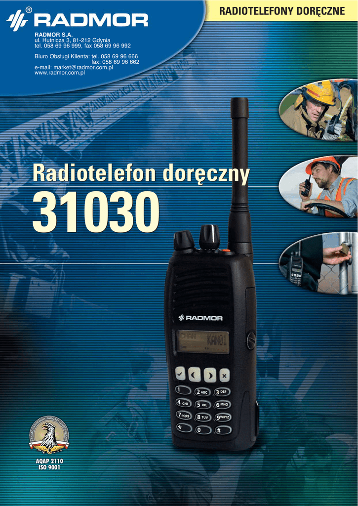 RADIOTELEFONY DOR¢CZNE RADMOR S.A. ul. Hutnicza 3, 81-212 Gdynia tel. 058 69 96 999, fax 058 69 96 992 Biuro Obs∏ugi Klienta: tel. 058 69 96 666 fax: 058 69 96 662 e-mail: [email protected] www.radmor.com.pl Radiotelefon dor´czny 31030 DOST¢PNE AKCESORIA OSPRZ¢T AUDIO 01716 Mikrofonog∏oÊnik standardowy T952-055 S∏uchawka nauszna TPK-AA-101 Mikrofonog∏oÊnik bryzgoszczelny T952-051 S∏uchawka kamuflowana FUTERA¸Y Oferujemy futera∏y skórzane i nylonowe do radiotelefonów z klawiaturà pe∏nà i uproszczonà. TPB-AA-102 Mikrofonog∏oÊnik Êredniej wagi TPB-AA-101 Mikrofonog∏oÊnik lekki ANTENY anteny helikalowe 31840 (136-151 MHz) 31841 (150-162 MHz) 31842 (162-174 MHz) 31843 (400-450 MHz) 31845 (435-480 MHz) anteny pr´towe 31844 (400-470 MHz) Futera∏ 31330-R200 ZASILANIE 31716/1 Zasilacz akumulatorowy Li-Ion 2000 mAh TPA-CA-201 Zaczep do pasa 55 mm 02750 Urzàdzenie ∏adujàce szybkie 02751 Urzàdzenie ∏adujàce wielogniazdowe (6-stanowiskowe) DOST¢PNE AKCESORIA TPA-AA-212 S∏uchawki nag∏owne z mikrofonem i pa∏àkiem zag∏ownym TPB-AA-201 Mikrofonos∏uchawka nauszna z 1 s∏uchawkà i PTT palcowym TPK-AA-001 Adapter akcesoriów (6 pin) TPB-AA-202 Mikrofonos∏uchawka nauszna z 2 s∏uchawkami TO3-10119-XAAB Adapter akcesoriów (12 pin) wymagajà u˝ycia adaptera akcesoriów TPK-AA-301 S∏uchawki nag∏owne z mikrofonem TPK-AA-300 S∏uchawki nag∏owne lekkie z mikrofonem TPB-AA-203 S∏uchawka douszna z mikrofonem i PTT butonierkowym TPK-AA-202 Zestaw 2-przewodowy kamuflowany TPB-AA-204 Kamuflowana s∏uchawka douszna z mikrofonem i PTT butonierkowym TPA-AA-213 Zestaw 3-przewodowy kamuflowany RADIOTELEFONY DOR¢CZNE Radiotelefon dor´czny 31030 Radiotelefon dor´czny 31030 to nowoczesny Êrodek ∏àcznoÊci, którego funkcje i ró˝ne wykonania pozwalajà wykorzystywaç go w wielu zastosowaniach. Trwa∏a i ergonomiczna obudowa spe∏niajàca wymagania stopnia ochrony IP67 pozwala na u˝ywanie radiotelefonu w trudnych warunkach. Dzi´ki temu bez szkody mo˝e s∏u˝yç stra˝akom, policjantom, pracownikom ochrony, s∏u˝bom komunalnym i innym, którzy pracujà w ci´˝kich warunkach. Radiotelefon jest niewielki i lekki, ∏atwo mieÊci si´ w d∏oni przez co prosta jest jego obs∏uga. Du˝ym atutem jest zastosowanie lekkiego zasilacza akumulatorowego o du˝ej pojemnoÊci, który umo˝liwia ponad 11 godzin pracy radiotelefonu. Radiotelefony dost´pne sà w dwóch wersjach: konwencjonalnej i trankingowej. W zale˝noÊci od wykonania, przeznaczone sà do pracy w pasmach cz´stotliwoÊci 160 lub 450 MHz. Urzàdzenia trankingowe obs∏ugujà równie˝ kana∏y konwencjonalne. Radia oferowane sà bez klawiatury (tylko konwencjonalne), z klawiaturà alfanumerycznà uproszczonà lub pe∏nà. W wyÊwietlacz LCD i przyciski funkcyjne wyposa˝one sà jedynie radiotelefony z klawiaturà, która umo˝liwia wybór numerów selektywnego wywo∏ania, numerów centrali telefonicznej kodem DTMF oraz przekazywanie komunikatów SDM. Dane techniczne: Parametr ■ pasmo 160, 450 MHz konwencjonalny Zakres cz´stotliwoÊci Moc nadajnika ■ wykonanie konwencjonalne i trankingowe ■ selektywne wywo∏anie 31030 Liczba kana∏ów - bez klawiatury - z klawiaturà uproszczonà - z pe∏nà klawiaturà 400 ÷ 470 MHz 400 ÷ 470 MHz 1–5 W 1–4 W 1–4 W 16 128 350 Odst´p sàsiedniokana∏owy 12,5 / 20 / 25 kHz Zakres temperatury pracy –30 ÷ 60°C Stopieƒ ochrony ■ CTCSS / DCS IP67 Wymiary 62 x 130 x 40 mm Waga 344 g Zasilacz akumulatorowy Li-Ion ■ DTMF ■ skaning (przeszukiwanie kana∏ów) ■ voting (wybór kana∏u z najsilniejszym sygna∏em) ■ skanowanie z priorytetem ■ wysy∏anie i odbiór wiadomoÊci SDM ■ funkcja „samotny pracownik” ■ wysy∏anie i odbiór statusów ■ mo˝liwoÊç zainstalowania skramblera 100 w tym 10 konwencjonalnych £ 0,35 μV Czu∏oÊç odbiornika ■ wywo∏anie alarmowe trankingowy 136 ÷ 174 MHz 2000 mAh Podstawowy zestaw eksploatacyjny: ■ zespó∏ nadawczo-odbiorczy ■ zasilacz akumulatorowy ■ antena ■ zaczep do pasa ■ urzàdzenie ∏adujàce jednogniazdowe z zasilaczem Dodatkowe akcesoria: ■ futera∏y ■ mikrofonog∏oÊniki ■ zestawy s∏uchawkowe ■ urzàdzenie ∏adujàce wielogniazdowe UWAGA: Podane parametry nie majà charakteru wià˝àcej specyfikacji. Firma zastrzega sobie prawo do zmiany parametrów technicznych urzàdzenia. piecz´ç sprzedawcy