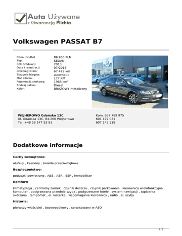 Volkswagen PASSAT B7 Cena (brutto) Typ: Rok produkcji: Data I rejestracji: Przebieg w km: Skrzynia biegów: Moc silnika: Pojemność skokowa: Rodzaj paliwa: Kolor: 89 900 PLN SEDAN 2013 07/2013 67 472 km automatic 177 KM 1968 cm3 Diesel BRĄZOWY metaliczny WEJHEROWO Gdańska 13C Ul. Gdańska 13C, 84-200 Wejherowo Tel. +48 58 677 53 91 Kom. 667 789 975 601 197 021 607 145 518 Dodatkowe informacje Cechy zewnętrzne: alufelgi , ksenony , światła przeciwmgłowe Bezpieczeństwo: poduszki powietrzne , ABS , ASR , ESP , immobiliser Komfort: klimatyzacja , centralny zamek , czujnik deszczu , czujnik parkowania , kierownica wielofunkcyjna , komputer , podgrzewana przednia szyba , podgrzewane fotele , system nawigacji , tapicerka skórzana , tempomat , el. lusterka , wspomaganie kierownicy , radio , el. szyby Historia: pierwszy właściciel , bezwypadkowy , serwisowany w ASO 1/2 Gwarancja Szanowni Państwo, Pragniemy Państwa poinformować, iż firma Plichta – Autoryzowany Dealer Škoda Auto prowadzi skup oraz sprzedaż samochodów używanych wszystkich marek, oferując także samochody używane z gwarancją objęte programem „Auta używane z Gwarancją Plichta”. W ramach programu „Auta Używane z Gwarancją Plichta ” każdy Klient otrzymuje atrakcyjny pakiet zniżek pozwalający zoptymalizować koszty eksploatacji samochodu: -50% na serwis klimatyzacji -50% na ustawienie zbieżności -50% na kosmetykę auta -50% na ścieżkę diagnostyczną -25% na wymiany oleju -25% na zakup opon + 5zł na sezon za hotelowanie opon -15% na części i akcesoria Oferujemy również kompleksową obsługę w zakresie finansowania i ubezpieczenia: - kredyty już od 4,99% - leasingi i kredyty bez zaświadczeń - uproszczone procedury – decyzja już od 30 min. - atrakcyjne pakiety AC/OC/NW/ASS wiodących firm ubezpieczeniowych Możliwość pozostawienia dotychczas użytkowanego auta w rozliczeniu – BEZPŁATNA WYCENA!!! Zapraszamy wszystkich Klientów na jazdę próbną wybranym autem. Numer oferty: A779 Informacja nie stanowi oferty w rozumieniu art. 66 KC. Podane dane mają charakter wyłącznie informacyjny. 2/2 Powered by TCPDF (www.tcpdf.org)