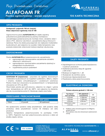 . OPIS PRODUKTU Dostępność: pojemnik 750 ml; (wężyk) Klasa odporności ogniowej: max EI 180 Ogniochronna piana ALFAFOAM FR jest ciężko zapalną poliuretanową jednoskładnikową pianką montażowouszczelniającą przeznaczoną do montażu futryn, ościeżnic okien i drzwi z PVC, drewna i aluminium, uszczelniania złączy liniowych i dylatacji. Piana ma dobrą przyczepność do większości materiałów budowlanych, jest odporna na wysokie i niskie temperatur oraz posiada doskonałe właściwości izolacji cieplnej i akustycznej. ZASTOSOWANIE Pianka ALFAFOAM FR jest przeznaczona do uszczelniania: • ognioodpornej i dymoszczelne uszczelnianie ościeżnic okiennych i drzwiowych, • ognioodporne i dymoszczelne uszczelnienia dylatacji w przegrodach budowlanych, • wypełnienie pustych przestrzeni . ZALETY PRODUKTU • Zapobiegawcza ochrona przeciwpożarowa w jednym produkcie • Materiał budowlany klasy B1 zgodnie z DIN 4102-1 • Reakcja na Ogień: B-s 1, d0 • Wydajność do 46 litrów piany • Gwarancja nieprzywieralności: • Przedłużony okres przechowywania CECHY PRODUKTU ALFAFOAM FR (wężykowa) – przywiera do ogólnie stosowanych materiałów budowlanych za wyjątkiem polietylenu, silikonu, olejów i smarów, środków antyadhezyjnych i podobnych substancji. Pianka może być stosowana na powierzchniach i w temperaturze otoczenia od +5°C do 30°C. Wyschnięta pianka jest pół-sztywna, odporna na wilgoć i gnicie oraz temperaturę od -40°C do +80°C. Jest odporna na starzenie, ale nie na promieniowanie UV. Redukuje ciepło oraz hałas. . KLASYFIKACJA OGNIOWA Ściana sztywna grubość ≥ 150 mm Typ złącza/ max szerokość ≤ 10 mm ≤ 20 mm ≤ 50 mm Drewniana rama ≤ 20 mm PRZESYŁANIE i PRZECHOWYWANIE Zawartość 750ml Jedn. opakowanie 12 puszek Jedn. paleta 60 opakowań Na opakowaniu podano datę przydatności. Jeśli podano datę produkcji, okres przydatności wynosi 18 miesięcy od daty produkcji. Idealna temperatura przechowywania to pomiędzy +10°C a +20°C. Pojemnik musi być przechowywany pionowo z dala od źródła ciepła i zimna. 1) 2) Min głębokość uszczelnienia ≥ 150 mm ≥ 150 mm 1) ≥ 50 mm ≥ 150 mm 2) EI EI 90 EI 60 EI 180 EI 90 Podkład z wełny mineralnej gęstość min 90kg/m3, grubość 50 mm. Piana pokryta z obu stron drewnianym wykończeniem (ramą) TDS KARTA TECHNICZNA ALFAFOAM FR | 1 PRZYGOTOWANIE PRAC Powierzchnie muszą być solidne, czyste, bez kurzu i tłuszczu. Należy usunąć luźne cząstki i zwilżyć powierzchnię wodą przed użyciem. Dodatkowo, użycie podkładu zwiększa stabilność. Należy mieć w pobliżu wszystkie części gotowe do złączenia. Idealna temperatura do pracy to +20°C. Pojemniki, które są za zimne mogą być ostrożnie podgrzane w letniej wodzie. Wstrząsnąć pojemnikiem, około 20-25 razy, przed użyciem. Uwaga: Nigdy nie należy podgrzewać powyżej +50°C, z uwagi na możliwość wybuchu pojemnika. Pojemniki, które są zbyt ciepłe, jak np. takie pozostawione latem w samochodzie, mogą być ochłodzone w zimnej wodzie, ale nie wolno wstrząsać! 1. Dopasować adapter na klapkę. 4. Potrząsać pojemnikiem ok. 20 -25 razy, aby wymieszać zawartość. 2. Dopasować adapter na klapkę. 3. Usunąć zawór bezpieczeństwa z zatrzasku. 5. Obrócić pojemnik do góry dnem i rozpocząć wytwarzanie piany. 6. Zapewnić ciasne umocowanie. Aby wykorzystać ponownie należy ściągać pierścień uszczelniający. TDS KARTA TECHNICZNA ALFAFOAM FR | 2 APLIKACJA Przestrzegaj instrukcji umieszczonych na pojemniku. Wypełniaj ubytki małą ilością, gdyż świeża pianka można rozszerzyć się do około 200%. Poziom uwalniania pianki może być regulowalny poprzez różne ciśnienie na adapterze. Ostrożnie naciskaj adapter, aby kontrolować ilość pianki. Zwilż równomiernie powierzchnie, przed nałożeniem pianki. Dla większych szczelin i ubytków zwilżanie jest zalecane po każdej warstwie pianki. Niewystarczające zwilżenie i/lub przepełnienie otworu może prowadzić w następstwie do mimowolnego wypływu pianki. Usuń jakiekolwiek pozostałości pianki. Wyschnięta pianka może być tylko usunięta za pomocą specjalnych preparatów lub mechanicznie. Po aplikacji, należy przesuną pierścień adaptera do zatrzasku i umieścić go na uszczelce wargowej. Upewnij się, aby zabezpieczyć dokładnie. To umożliwi przerwę w pracach na kilka tygodni. W celu ponownego użycia, usuń wężyk adaptera z zatrzasku. DANE TECHICZNE (warunki laboratoryjne, temperatura +23°C, wilgotność 50%) Struktura komórki Gęstość objętościowa (produkcja piany) Czas pyłosuchości (suche podanie) Przydatność do obróbki (30mm pasmo, suche podanie) W pełni utwardzona (30 mm pasmo) Minimalna / optymalna / maksymalna temperatura aplikacji Odporność na temperaturę utwardzonej pianki Klasa materiałów budowlanych według DIN 4102 część 1 Reakcja na ogień wg. UNE-EN 13501-1: 200+A1:2010 Odporność ogniowa Wydajność pianki z pojemnika 750 ml drobna 15 - 17 kg/m 3 około 10 min około 200 min około 24 godz. +5°C / +20°C / +30°C -40°C do +80°C (krótko poniżej +100°C) B1 B-s1, d0 Do El 240 Do 39 litrów (+/- 1) TDS KARTA TECHNICZNA ALFAFOAM FR | 3