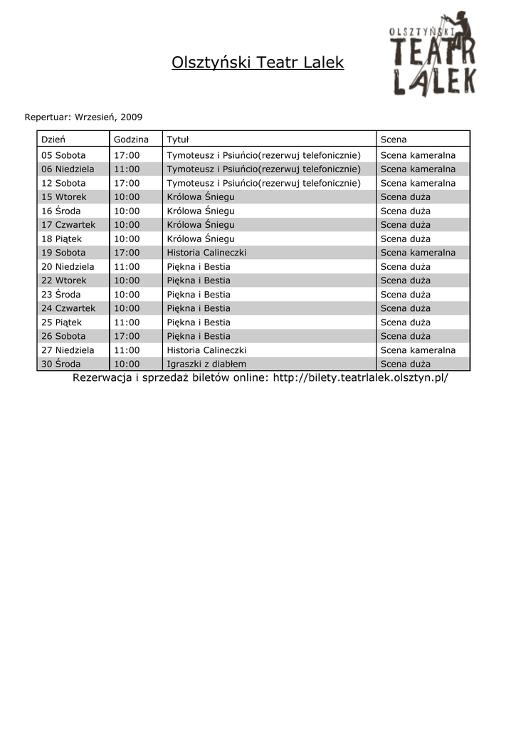 Olsztyński Teatr Lalek Repertuar: Wrzesień, 2009 Dzień Godzina Tytuł Scena 05 Sobota 17:00 Tymoteusz i Psiuńcio(rezerwuj telefonicznie) Scena kameralna 06 Niedziela 11:00 Tymoteusz i Psiuńcio(rezerwuj telefonicznie) Scena kameralna 12 Sobota 17:00 Tymoteusz i Psiuńcio(rezerwuj telefonicznie) Scena kameralna 15 Wtorek 10:00 Królowa Śniegu Scena duża 16 Środa 10:00 Królowa Śniegu Scena duża 17 Czwartek 10:00 Królowa Śniegu Scena duża 18 Piątek 10:00 Królowa Śniegu Scena duża 19 Sobota 17:00 Historia Calineczki Scena kameralna 20 Niedziela 11:00 Piękna i Bestia Scena duża 22 Wtorek 10:00 Piękna i Bestia Scena duża 23 Środa 10:00 Piękna i Bestia Scena duża 24 Czwartek 10:00 Piękna i Bestia Scena duża 25 Piątek 11:00 Piękna i Bestia Scena duża 26 Sobota 17:00 Piękna i Bestia Scena duża 27 Niedziela 11:00 Historia Calineczki Scena kameralna 30 Środa 10:00 Igraszki z diabłem Scena duża Rezerwacja i sprzedaż biletów online: http://bilety.teatrlalek.olsztyn.pl/