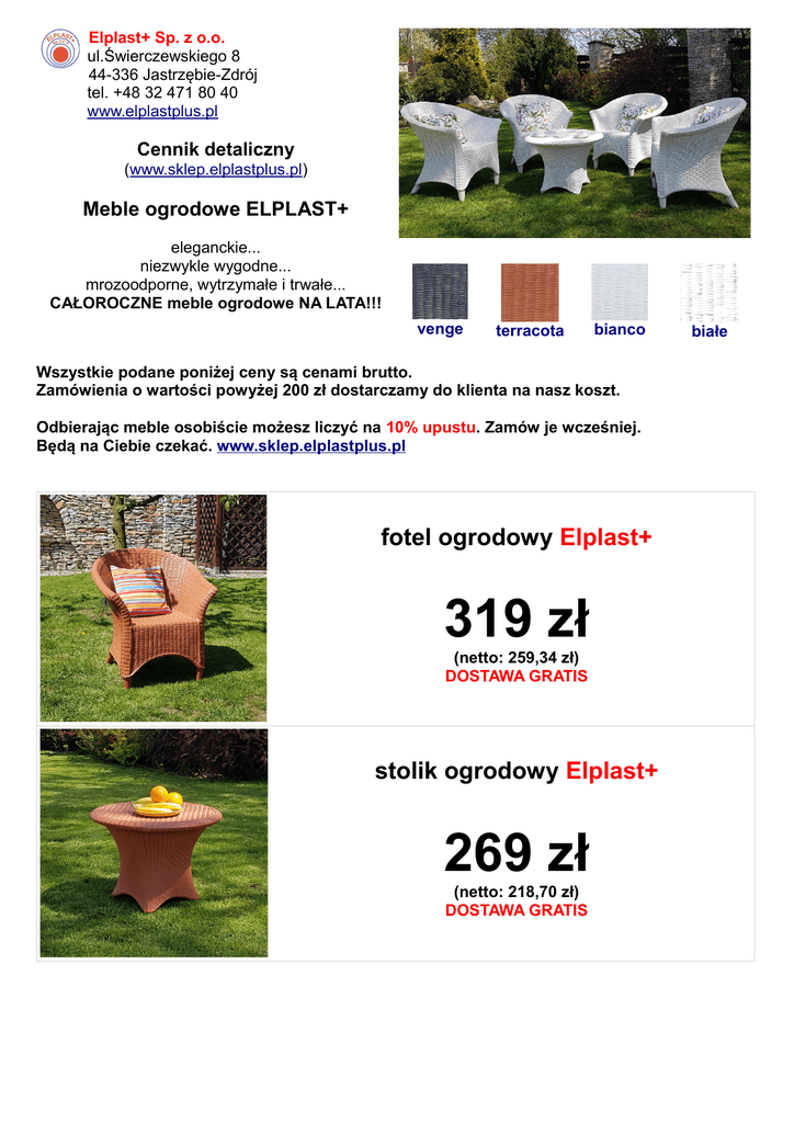 Elplast+ Sp. z o.o. ul.Świerczewskiego 8 44-336 Jastrzębie-Zdrój tel. +48 32 471 80 40 www.elplastplus.pl Cennik detaliczny (www.sklep.elplastplus.pl) Meble ogrodowe ELPLAST+ eleganckie... niezwykle wygodne... mrozoodporne, wytrzymałe i trwałe... CAŁOROCZNE meble ogrodowe NA LATA!!! venge terracota bianco Wszystkie podane poniżej ceny są cenami brutto. Zamówienia o wartości powyżej 200 zł dostarczamy do klienta na nasz koszt. Odbierając meble osobiście możesz liczyć na 10% upustu. Zamów je wcześniej. Będą na Ciebie czekać. www.sklep.elplastplus.pl fotel ogrodowy Elplast+ 319 zł (netto: 259,34 zł) DOSTAWA GRATIS stolik ogrodowy Elplast+ 269 zł (netto: 218,70 zł) DOSTAWA GRATIS białe Zestaw mebli ogrodowych Elplast+ 2+1 (2 fotele, 1 stolik) 899 zł (netto: 730,89 zł) DOSTAWA GRATIS Zestaw mebli ogrodowych Elplast+ 3+1 (2 fotele, 1 stolik) 1199 zł (netto: 974,80 zł) DOSTAWA GRATIS Zestaw mebli ogrodowych Elplast+ 4+1 (2 fotele, 1 stolik) 1499 zł (netto: 1218,70 zł) DOSTAWA GRATIS Zamawiając zestaw 4 + 1 możesz zamówić dodatkowe elementy w korzystnych cenach: fotel ogrodowy ELPLAST+ 289 zł (netto: 234,96 zł) stolik ogrodowy ELPLAST+ 239 zł (netto: 194,31 zł) Cennik obowiązuje do 28.02.2017 lub do wcześniejszego odwołania. Zamówienia: www.sklep.elplastplus.pl [email protected] +48 667 68 68 81