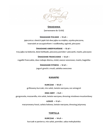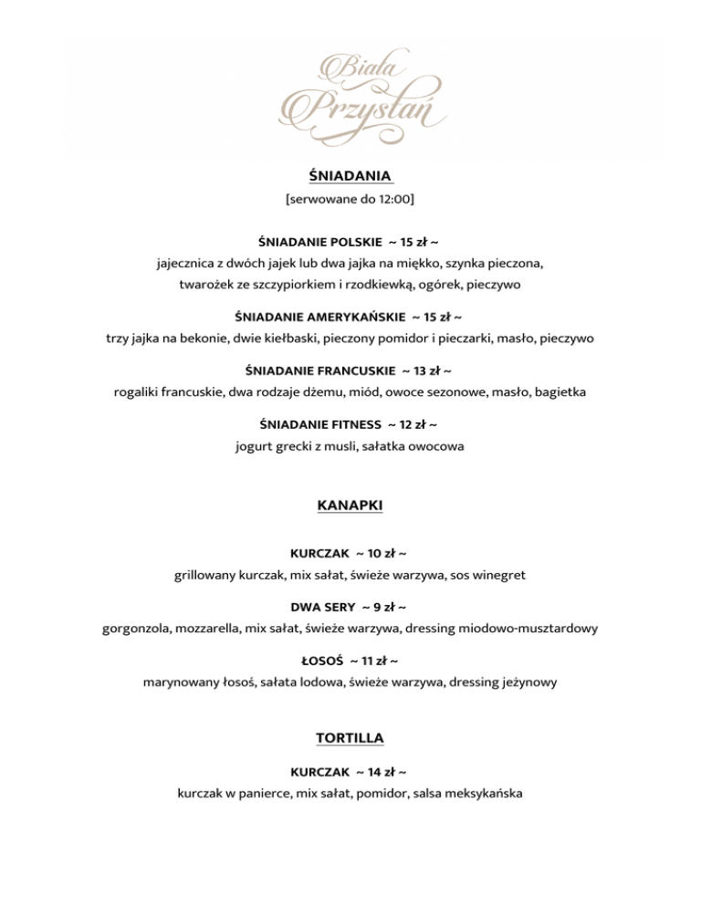 ŚNIADANIA [serwowane do 12:00] ŚNIADANIE POLSKIE ~ 15 zł ~ jajecznica z dwóch jajek lub dwa jajka na miękko, szynka pieczona, twarożek ze szczypiorkiem i rzodkiewką, ogórek, pieczywo ŚNIADANIE AMERYKAŃSKIE ~ 15 zł ~ trzy jajka na bekonie, dwie kiełbaski, pieczony pomidor i pieczarki, masło, pieczywo ŚNIADANIE FRANCUSKIE ~ 13 zł ~ rogaliki francuskie, dwa rodzaje dżemu, miód, owoce sezonowe, masło, bagietka ŚNIADANIE FITNESS ~ 12 zł ~ jogurt grecki z musli, sałatka owocowa KANAPKI KURCZAK ~ 10 zł ~ grillowany kurczak, mix sałat, świeże warzywa, sos winegret DWA SERY ~ 9 zł ~ gorgonzola, mozzarella, mix sałat, świeże warzywa, dressing miodowo-musztardowy ŁOSOŚ ~ 11 zł ~ marynowany łosoś, sałata lodowa, świeże warzywa, dressing jeżynowy TORTILLA KURCZAK ~ 14 zł ~ kurczak w panierce, mix sałat, pomidor, salsa meksykańska ZUPY Rosół z makaronem ~ 9 zł ~ Zupa wiosenna ~ 12 zł ~ Barszcz czerwony z uszkami z mięsem ~ 9 zł ~ Żurek z jajkiem i kiełbasą wiejską ~ 10 zł ~ Krem z pieczonych białych warzyw z serem gorgonzola i grzanką ~ 10 zł ~ DANIA MIĘSNE Pierś z kaczki na sosie gruszkowo-figowym z rozetkami ziemniaczanymi i gruszką marynowaną w czerwonym winie ~ 37 zł ~ Kotlet devolay z masłem i pietruszką serwowany z młodymi ziemniakami i mizerią ~ 24 zł ~ Grillowana pierś z kurczaka z mozzarellą i pomidorem na mixie sałat z ziemniakami opiekanymi ~ 23 zł ~ Polędwiczka wieprzowa faszerowana kurkami podawana z sosem serowym, kaszą pęczak i kaszą jęczmienną z warzywami ~ 26 zł ~ Rolada ze schabu faszerowana borowikami na sosie pieczeniowym z kluskami śląskimi i surówką z pieczonych buraczków ~ 26 zł ~ Kotlet schabowy z kością podany z ziemniakami z wody i młodą kapustą ~ 24 zł ~ Karkówka z grilla z ziemniakami z pieca z masłem czosnkowym i grillowanymi warzywami ~ 23 zł ~ Rolada z piersi indyka faszerowana warzywami i fetą, serwowana na sosie serowo - szafranowym z kopytkami szpinakowymi i fasolką szparagową z bułką tartą ~ 28 zł ~ DANIA Z RYB Filet z łososia podawany na grillowanych warzywach z rosti ziemniaczanymi ~ 35 zł ~ Filet z sandacza z sosem borowikowym i pieczonym karmelizowanym burakiem ~ 30 zł ~ Pstrąg marynowany w ziołach serwowany z mixem sałat i ziemniakami z rozmarynem ~ 26 zł ~ MAKARONY Penne z grillowanymi warzywami i polędwiczkami z kurczaka ~ 18 zł ~ Pappardelle z krewetkami w sosie śmietanowo- cytrynowym ~ 22 zł ~ PIEROGI Pierogi z mięsem ~ 12 zł ~ Szare pierogi z kiszoną kapustą i pieczoną kaczką na sosie żurkowym ~ 18 zł ~ Pierogi ruskie z masłem i złocistą cebulką ~ 12 zł ~ Pierogi z owocami sezonowymi i bitą śmietaną ~ 12 zł ~ SAŁATKI KURCZAK ~ 17 zł ~ grillowany kurczak, sałata lodowa, warzywami sezonowe, sos jeżynowy GRECKA ~ 15 zł ~ ser feta, mix sałat, pomidor, świeży ogórek, papryka, czerwona cebula, oliwki czarne i zielone, sos winegret SZYNKA PARMEŃSKA I JAJKO ~ 19 zł ~ chipsy z szynki parmeńskiej, jajko w koszulce, rukola, świeży ogórek, papryka, czerwona cebula, sos chrzanowy MENU DLA DZIECI Rosół z makaronem ~ 4 zł ~ Nuggetsy z frytkami i surówką z marchewki ~ 10 zł ~ Racuszki z jabłkami ~ 7 zł ~ Naleśniki z serem posypane cukrem pudrem ~ 10 zł ~ SURÓWKI Mix sałat z warzywami sezonowymi ~ 8 zł ~ Kapusta zasmażana z grzybami ~ 8 zł ~ Surówka z kapusty pekińskiej ~ 6 zł ~ Surówka z białej kapusty z marchewką i natką pietruszki ~ 5 zł ~ Surówka z pieczonych buraków z dodatkiem soku malinowego ~ 5 zł ~ Mizeria ~ 5 zł ~ STEKI [podawane na kamieniu lawowym z trzema dipami] Stek z polędwicy wołowej ~ 25 zł /100g ~ Stek z rostbefu wołowego ~ 18 zł /100g ~ Stek z antrykotu wołowego ~ 16 zł /100g ~ DODATKI DO STEKOW Frytki (120g) ~ 6 zł ~ Ziemniaki pieczone z czosnkiem i rozmarynem (120g) ~ 6 zł ~ Ziemniaki pieczone z twarożkiem (160g) ~ 7 zł ~ Ziemniaki pieczone z masłem czosnkowym (120g) ~ 6 zł ~ Pomidor pieczony z czosnkiem i rozmarynem ~ 4 zł ~ Mix sałat z warzywami sezonowymi ~ 8 zł ~ BURGERY [bułka sezamowa, 100 % polskiej wołowiny, frytki w zestawie] CLASSIC ~ 15 zł ~ cebula, sałata, pomidor, ogórek CHEESEBURGER ~ 17 zł ~ cebula, ser, sałata, pomidor, ogórek BACON CHEESEBURGER ~ 19 zł ~ bekon, cebula, ser, sałata, pomidor, ogórek SZANOWNY GOŚCIU! Dbamy o jakość i świeżość naszych posiłków, nie używamy glutaminianu sodu oraz innych sztucznych „polepszaczy”, a każdą potrawę przygotowujemy specjalnie dla Ciebie. Wszystko to zajmuje więcej czasu niż wszechobecny fast food, dlatego czas oczekiwania może być nieco wydłużony. Prosimy o cierpliwość! Informacja o ALERGENACH znajduje się w barze. Prosimy zapytać kelnera.