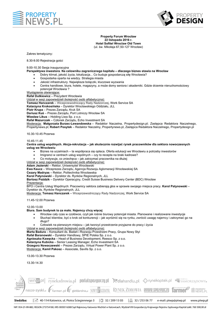 Property Forum Wrocław 22 listopada 2016 r. Hotel Sofitel Wroclaw Old Town (ul. św. Mikołaja 67,50-127 Wrocław) Zakres tematyczny: 8.30-9.00 Rejestracja gości 9.00-10.30 Sesja inauguracyjna Perspektywa inwestora. Na celowniku zagranicznego kapitału – dlaczego biznes stawia na Wrocław • Dobry klimat, jakość życia, lokalizacja... Co buduje gospodarczą siłę Wrocławia? • Gospodarka oparta na wiedzy. Strategia miasta • Jakość infrastruktury. Największe bolączki, kluczowe wyzwania • Centra handlowe, biura, hotele, magazyny, a może domy seniora i akademiki. Gdzie drzemie nieruchomościowy potencjał Wrocławia ? Wystąpienie otwierające: Rafał Dutkiewicz – Prezydent Wrocławia Udział w sesji zapowiedzieli (kolejność osób alfabetyczna): Tomasz Hanczarek – Wiceprzewodniczący Rady Nadzorczej, Work Service SA Katarzyna Krokosińska – Dyrektor Wrocławskiego Oddziału, JLL Piotr Krupa – Prezes Zarządu, Kruk SA Dariusz Kuś – Prezes Zarządu, Port Lotniczy Wrocław SA Wiesław Likus – Holding Liwa Sp. z o.o. Rafał Mazurczak – Członek Zarządu, Echo Investment SA Moderacja: Małgorzata Burzec-Lewandowska – Redaktor Naczelna, Propertydesign.pl; Zastępca Redaktora Naczelnego, Propertynews.pl; Robert Posytek – Redaktor Naczelny, Propertynews.pl, Zastępca Redaktora Naczelnego, Propertydesign.pl 10.30-10.45 Przerwa 10.45-11.45 Centra usług wspólnych. Akcja-rekrutacja – jak skutecznie rozwijać rynek pracowników dla sektora nowoczesnych usług we Wrocławiu • Biznes na uczelniach – ta współpraca się opłaca. Oferta edukacji we Wrocławiu a potrzeby inwestorów • Imigranci w centrach usług wspólnych – czy to recepta na braki kadrowe? • Co motywuje, co zniechęca – jak zatrzymać pracownika na dłużej Udział w sesji zapowiedzieli (kolejność osób alfabetyczna): Adam Jezierski – Rektor, Uniwersytet Wrocławski Ewa Kaucz – Wiceprezes Zarządu, Agencja Rozwoju Aglomeracji Wrocławskiej SA Cezary Madryas – Rektor, Politechnika Wrocławska Karol Patynowski – Dyrektor ds. Rynków Regionalnych, JLL Bartosz Poździk – Dyrektor Operacyjny, Credit Suisse Business Delivery Center (BDC) Wrocław Prezentacja: BPO i Centra Usług Wspólnych: Pracownicy sektora zabierają głos w sprawie swojego miejsca pracy. Karol Patynowski – Dyrektor ds. Rynków Regionalnych, JLL Moderacja: Tomasz Hanczarek – Wiceprzewodniczący Rady Nadzorczej, Work Service SA 11.45-12.00 Przerwa 12.00-13.00 Biura. Sam budynek to za mało. Najemcy chcą więcej • Wrocław cały czas w czołówce, czyli jak rośnie biurowy potencjał miasta. Planowane i realizowane inwestycje • Słuchać klientów, być o krok od konkurencji – jak wyróżnić się na rynku, zwrócić uwagę najemcy i zatrzymać go na długo? • Człowiek na pierwszym miejscu – jak tworzyć przestrzenie przyjazne do pracy i życia Udział w sesji zapowiedzieli (kolejność osób alfabetyczna): Marta Badura – Konsultant ds. Badań i Rozwoju Przestrzeni Pracy, Grupa Nowy Styl Rafał Baranowski – Dyrektor Handlowy, SPIE Polska Sp. z o.o. Agnieszka Kawęcka – Head of Business Development, Reesco Sp. z o.o. Katarzyna Kubicka – Senior Leasing Manager, Echo Investment SA Grzegorz Nowaczewski – Prezes Zarządu, Virtual Power Plant Sp. z o.o. Moderacja: Kamil Pakosz – Associate, Savills Sp. z o.o. 13.00-13.30 Przerwa 13.30-14.30 Magazyny. Dolny Śląsk szykuje się na kolejną falę nowych projektów • To czas inwestycji, ale czy nie zbliża się górka? Magazynowy plan na Dolny Śląsk • Program „S3 – Droga wielkich możliwości" i co jeszcze... – czego oczekują inwestorzy, co dają władze regionu? • Branża motoryzacyjna, sektor AGD czy logistyka – w czym jeszcze drzemie potencjał dla rozwoju rynku w regionie? Udział w sesji zapowiedzieli (kolejność osób alfabetyczna): Jerzy Czajkowski – Pełnomocnik Zarządu ds. Inwestycji, 7R Logistic SA Łukasz Czajkowski – Dyrektor Centrum Wspierania Biznesu, Agencja Rozwoju Aglomeracji Wrocławskiej SA Damian Kowalczyk – Senior Development Manager, Panattoni Europe Łukasz Maciejewski – Project Manager, Legnicka Specjalna Strefa Ekonomiczna SA Hubert Wojtera – Senior Konsultant, Axi Immo Group Sp. z o.o. Moderacja: Kamil Szymański – Associate Director, Dział Powierzchni Magazynowych i Przemysłowych, Savills Sp. z o.o. 14.30-14.45 Przerwa 14.45-15.30 Centra handlowe. „Kopiuj-wklej” już nie działa! Czy na handlowej mapie Wrocławia są jeszcze nisze? Jak przyciągnąć najemców i klientów? • Najważniejsza jest lokalizacja – która jest najlepsza we Wrocławiu? • Centra handlowe nie potrafią się wyróżnić. Architektura, technologia, jeszcze więcej usług i rozrywki. Na co postawić? • Starcie Dawida z Goliatem? Jakie atuty w rynkowej grze mają starsze obiekty handlowe? Udział w sesji zapowiedzieli (kolejność osób alfabetyczna): Grzegorz Grajkowski – Head of Operating Management, Unibail-Rodamco Małgorzata Laskowska – Zastępca Dyrektora, Dział Wynajmu Powierzchni Handlowych, CBRE Jarosław Okupski – Dyrektor ds. Rozwoju, Kindermagnet Polska Sp. z o.o. Agnieszka Szczepaniak – Architekt, Dyrektor ds. Rozwoju i PR, AP Szczepaniak Prezentacja: Wroclavia – 4* centrum handlowe. Grzegorz Grajkowski – Head of Operating Management, Unibail-Rodamco Moderacja: Elżbieta Dmowska-Mędrzycka – Prezes Zarządu, Mediadem Communication 15.30-15.40 Przerwa 15.40-16.30 Hotele. Smart lifestyle, czyli turystyka, kultura i rozrywka 2.0 • Prezentacje. Krótkie historie spektakularnych projektów o Trendy projektowaniu hoteli na przykładzie Novotel Wroclaw Centrum. Piotr Kalinowski – Architect Design Manager, Branch Principal Wrocław, Tremend Sp. z o.o. o AC by Marriott we Wrocławiu. Janusz Mitulski – Dyrektor Rozwoju na Europę Środkowo-Wschodnią i Kraje Bałtyckie, Sieć Marriott International • Dyskusja: o Przemysł czasu wolnego kwitnie we Wrocławiu – jak to dobrze wy