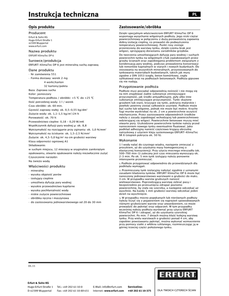 Instrukcja techniczna PL Opis produktu Zastosowanie/obróbka Producent Dzięki specjalnym właściwościom ERFURT KlimaTec DP 6 wspomaga wysychanie wilgotnych podłoży. Jego niski ciężar powierzchniowy w połączeniu z dużą porowatością zapewnia dobrą izolację cieplną, co prowadzi do podwyższenia temperatury powierzchniowej. Punkt rosy zostaje przeniesiony do warstwy tynku, dzięki czemu brak jest wilgoci, sprzyjającej dorastaniu zarodników grzybów. Erfurt & Sohn KG Hugo-Erfurt-Straße 1 42399 Wuppertal www.erfurt.com Nazwa produktu ERFURT-KlimaTec DP 6 Surowce/produkcja ERFURT-KlimaTec DP 6 jest mineralną suchą zaprawą Dane produktu · Nr zamówienia 551 · Forma dostawy: worek 2-kg 4 worki/karton 32 kartony/paleta Przygotowanie podłoża Baza: Zaprawa sucha Kolor: jasnoszary Temperatura podłoża / obróbki: +5 ℃ do +25 ℃ Ilość potrzebnej wody: 1 l / worek Czas obróbki: ok. 60 min. Gęstość zaprawy stałej: ok. 0,5-0,55 kg/dm3 Zużycie wody: ok. 1,1–1,5 kg/m3/24 h Porowatość: ok. 70 % Przewodnictwo cieplne: 0,18 - 0,20 W/mK Współczynnik dyfuzji pary wodnej μ: ok. 8,8 Wytrzymałość na rozciąganie przy zginaniu: ok. 1,0 N/mm2 Wytrzymałość na ściskanie: ok. 1,5–2,5 N/mm2 Zużycie: ok. 4,5–5,0 kg/m2 na cm grubości warstwy Klasa odporności ogniowej A1 Składowanie: w suchym miejscu, 12 miesięcy w oryginalnie zamkniętym opakowaniu, otwarte opakowanie należy niezwłocznie zużyć Czyszczenie narzędzi: Na świeżo wodą Podłoże musi posiadać odpowiednią nośność i nie mogą się na nim znajdować żadne substancje zmniejszające przyczepność, jak środki antyadhezyjne, pyły albo inne substancje zmniejszające przyczepność. Tynki skażone grzybem lub stare, kruszące się tynki, pokrycia malarskie i powłoki powinny zostać całkowicie usunięte. Podłoże może być suche lub wilgotne, jednak nie może być mokre. Kruche fugi murów wyskrobać na ok. 2 cm a powierzchnie oczyścić mechanicznie. Przez zastosowanie odpowiednich środków należy z zasady zapobiegać wchodzącej lub powierzchniowo wdzierającej się wilgoci. Powierzchnie betonowe muszą mieć otwarte pory. Uszkodzone powierzchnie tynków należy przed naniesieniem nowego tynku ewentualnie fluatować. Jako podkład adhezyjny nanieść częściowo kryjącą obrzutkę natryskową z użyciem kleju systemowego ERFURT-KlimaTec SR 6 (stopień pokrycia ok. 50 %). Wykonanie 1 l wody nalać do czystego wiadra, następnie zmieszać z proszkiem, aż do uzyskania masy homogenicznej o elastycznej konsystencji. Przy użyciu mocnego mieszadła (ok. 500–700 min-1) zalecany jest czas mieszania wynoszący ok. 2–3 min. Po ok. 5 min tynk izolujący należy ponownie intensywnie przemieszać. 1. Podłoże przygotować odpowiednio do przewidzianych dla podkładu wymagań. Właściwości produktu 2. Przemieszany tynk izolacyjny nałożyć zgodnie z uznanymi zasadami kładzenia tynków. ERFURT KlimaTec DP 6 może być nanoszony jednowarstwowo warstwami o grubości do maks. 3 cm. W przypadku warstw grubszych nanosić wielowarstwowo. Poprzedzającą warstwę zebrać pacą i bezpośrednio po przesunięciu zdrapać poziomo powierzchnię, by stała się szorstka, a następnie odczekać aż wyschnie. Na każdy 1 mm grubości warstwy odczekać jeden dzień na wyschnięcie. · mineralny · wysoka objętość porów · izolujący cieplnie · umożliwia dyfuzję pary wodnej · wysokie przewodnictwo kapilarne · wysoka pochłanialność wody · niskie zużycie powierzchniowe · obróbka ręczna i maszynowa Do tworzenia umożliwiających dyfuzję pary wodnej i suchych powierzchni tynku na wilgotnych i/lub zaatakowanych przez grzyby ścianach oraz zapobiegania problemom związanym z kondensacją pary wodnej, podczas prowadzenia konserwacji lub remontów kapitalnych w starych i nowych budynkach. Do stosowania na wszystkich mineralnych, przystosowanych do tynkowania materiałach budowlanych, takich jak mury zgodne z DIN 1053 (cegła, beton komórkowy, cegła sylikatowa) oraz na podłożach betonowych. Podłoża gipsowe się nie nadają. · do zastosowania jednowarstwowego od 20 do 30 mm 3. W przypadku mocno popękanych lub nierównych podłoży należy liczyć się z pojawieniem się naprężeń spowodowanych różnymi grubościami warstw oraz utwardzeniem, co może prowadzić do pęknięć oraz odparzeń. W tym przypadku wcześniej należy podłoża wyrównać przy użyciu ERFURT KlimaTec DP 6 i zdrapać, aż do uzyskania szorstkiej powierzchni. Po min. 7 dniach można kłaść kolejną warstwę tynku. Przy wielu warstwach o grubości ponad 4 cm, aby zapobiec powstawaniu pęknięć, można wykonać wzmocnienie przy pomocy siatki z włókna szklanego, rozmieszczając ją w górnej trzeciej części położonego tynku. 01.11 Erfurt & Sohn KG Hugo-Erfurt-Straße 1 D-42399 Wuppertal Tel.: +49 202 61 10-0 Fax: +49 202 61 10-89 451 E-Mail: [email protected] Internet: www.erfurt.com Serviceline: +49 202 61 10-375 DLA TWOICH CZTERECH ŚCIAN Instrukcja techniczna PL 4. Powierzchnie ERFURT KlimaTec DP 6 po dostatecznym utwardzeniu, w zależności od grubości warstwy oraz temperatur otoczenia należy po 1 do 3 dni obrobić przy użyciu kratki tynkarskiej. Tak obrobione powierzchnie należy przed nałożeniem kolejnej warstwy oczyścić z substancji zmniejszających przyczepność powierzchni, jak np. pył. 5. Gładkie, równe powierzchnie uzyskuje się dzięki zastosowaniu szpachli mineralnej. Obróbka powierzchni może mieć miejsce przy grubości warstwy wynoszącej od 2 cm (przy temperaturze otoczenia +20 °C/65 % wzgl. wilgotności) najwcześniej po upływie 3 dni. Niskie temperatury otoczenia oraz wysoka wilgotność powietrza wydłużają czas schnięcia. ERFURT KlimaTec DP 6 może być poddawany obróbce przy pomocy wszystkich dostępnych w handlu pomp mieszających (np. mit Putzmeister MP 25) z dodatkowym mieszadłem. Małe ilości mogą być mieszane mieszadłem ręcznie. Wskazówki: ·W przypadku silnego 