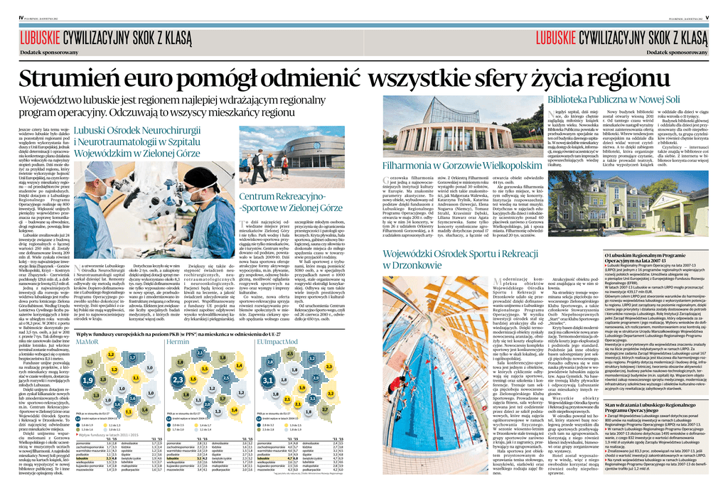IV PULS BIZNESU, 26 KWIETNIA 2012 PULS BIZNESU, 26 KWIETNIA 2012 lubuskie cywilizacyjny skok z klasĄ V lubuskie cywilizacyjny skok z klasĄ Dodatek sponsorowany Dodatek sponosorowany Strumień euro pomógł odmienić wszystkie sfery życia regionu Województwo lubuskie jest regionem najlepiej wdrażającym regionalny program operacyjny. Odczuwają to wszyscy mieszkańcy regionu Jeszcze cztery lata temu województwo lubuskie było daleko za pozostałymi regionami pod względem wykorzystania funduszy z Unii Europejskiej. Jednak dzięki determinacji i opracowaniu konkretnego planu działania szybko wskoczyło na najwyższy stopień podium. Dziś może służyć za przykład regionu, który świetnie wykorzystuje hojność Unii Europejskiej, na czym korzystają wszyscy mieszkańcy regionu — od przedsiębiorców przez studentów po najmłodszych. Dzięki dotacjom z Lubuskiego Regionalnego Programu Operacyjnego realizuje się 800 inwestycji. Większość unijnych pieniędzy województwo przeznacza na poprawę komunikacji — budowane są obwodnice, drogi regionalne, powstają linie kolejowe. Lubuskie zrealizowało już 24 inwestycje związane z budową dróg regionalnych o łącznej wartości 250 mln zł. Zostały one dofinansowane kwotą 209 mln zł. Wiele zyskała również kolej — trzy najważniejsze inwestycje: linia Zbąszynek — Gorzów Wielkopolski, Krzyż — Kostrzyn oraz Zbąszynek— Czerwieńsk pochłonęły 129,6 mln zł, a dofinansowano je kwotą 63,5 mln zł. Jedną z najważniejszych inwestycji dla rozwoju województwa lubuskiego jest rozbudowa portu lotniczego Zielona Góra-Babimost. Według Urzędu Lotnictwa Cywilnego liczba pasażerów korzystających z lotniska w ubiegłym roku wzrosła aż o 91,3 proc. W 2010 r. z portu w Babimoście skorzystało ponad 3,5 tys. osób, a już w 2011 r. prawie 7 tys. Tak dobrego wyniku nie zanotowało żadne inne polskie lotnisko. Już wkrótce terminal zostanie rozbudowany, a lotnisko wzbogaci się o system bezpieczeństwa ILS i meteo. Fundusze unijne pozwalają na realizację projektów, z których mieszkańcy mogą korzystać w czasie wolnym, dostarczających rozrywki i rozwijających młodych Lubuszan. Dzięki unijnym dotacjom region zyskał kilkanaście nowych lub zmodernizowanych obiektów sportowo-rekreacyjnych, m.in. Centrum Rekreacyjno-Sportowe w Zielonej Górze oraz Wojewódzki Ośrodek Sportu i Rekreacji w Drzonkowie. To dziś najczęściej odwiedzane przez mieszkańców miejsca. Dzięki unijnemu wsparciu melomani z Gorzowa Wielkopolskiego i okolic uczestniczą w muzycznych ucztach w nowej filharmonii. A najmłodsi mieszkańcy Nowej Soli przygód szukają na kartach książek, które mogą wypożyczyć w nowej bibliotece publicznej. Te i inne inwestycje opisujemy obok. Biblioteka Publiczna w Nowej Soli N Lubuski Ośrodek Neurochirurgii i Neurotraumatologii w Szpitalu Wojewódzkim w Zielonej Górze Filharmonia w Gorzowie Wielkopolskim G Centrum Rekreacyjno-Sportowe w Zielonej Górze T N a utworzenie Lubuskiego Ośrodka Neurochirurgii i Neurotraumatologii szpital czekał dziesięć lat. Remonty odbywały się metodą małych kroków. Dopiero dofinansowanie z Lubuskiego Regionalnego Programu Operacyjnego pozwoliło szybko dokończyć inwestycję. Dziś specjaliści z całej Polski nie mają wątpliwości, że jest to najnowocześniejszy ośrodek w kraju. Dotychczas leczyło się w nim około 2 tys. osób, a zakupiony dzięki unijnej dotacji sprzęt medyczny wykorzystano około 8,3 tys. razy. Dzięki dofinansowaniu nie tylko wyposażono ośrodek w nowy sprzęt, ale przebudowano go i zmodernizowano infrastrukturę związaną z ochroną zdrowia. Efektem jest zwiększenie liczby specjalnych badań medycznych, z których może korzystać więcej osób. o dziś najczęściej odwiedzane miejsce przez mieszkańców Zielonej Góry i nie tylko. Park wodny i hala widowiskowo-sportowa przyciągają nie tylko mieszkańców, ale i turystów. Centrum wybudowano od podstaw, powstawało w latach 2009-10. Dziś nowa baza sportowa oferuje atrakcyjne formy aktywnego wypoczynku, m.in. pływanie, gry zespołowe, odnowę biologiczną, możliwość oglądania rozgrywek sportowych na żywo oraz występy i imprezy kulturalne. Co ważne, nowa oferta sportowo-rekreacyjna sprzyja również rozwiązywaniu problemów społecznych w mieście. Zapewnia ciekawy sposób spędzania wolnego czasu Zwiększy się także dostępność świadczeń neurochirurgicznych, neurotraumatologicznych i neuroonkologicznych. Pacjenci będą krócej oczekiwali na leczenie, a jakość świadczeń zdecydowanie się poprawi. Współfinansowany z funduszy UE projekt ma również zapobiec odpływowi wysoko wykwalifikowanej kadry lekarskiej i pielęgniarskiej. szczególnie młodym osobom, przyczynia się do ograniczenia przestępczości i patologii społecznych. Kryta pływalnia, hala sportowa, gabinet odnowy biologicznej, sauna czy siłownia to doskonałe miejsca do miłego spędzenia czasu w towarzystwie przyjaciół i rodziny. W hali sportowej z trybunami, które mogą pomieścić 5080 osób, a w specjalnych przypadkach nawet o 1000 więcej, stale organizowane są rozgrywki ekstraligi koszykarskiej. Odbywa się tam także wiele innych prestiżowych imprez sportowych i kulturalnych. Od uruchomienia Centrum Rekreacyjno-Sporto-wego, czyli od 26 czerwca 2010 r., odwiedziło je 650 tys. osób. Wpływ funduszy europejskich na poziom PKB (w PPS*) na mieskzńca w odniesieniu do UE-27 MaMoR Hermin EUImpactMod 2,1 1,2 1,7 1,3 2,5 1,8 1,8 1,0 1,2 1,9 2,3 1,1 1,3 1,0 1,0 1,8 1,6 1,1 1,6 1,1 PKB pc w stosunku do EU-27 1,4 3,1 2,9 1,8 1,9 1,2 2,2 1,8 1,7 3,1 2,1 2,1 2,0 1,3 PKB pc w stosunku do EU-27 1,6 średni wpływ w latach 2004-15 2,3 1,8 2,5 1,5 1,2 1,0 1,3 1,4 1,5 3,2 2,8 1,4 1,8 PKB pc w stosunku do EU-27 1,6 średni wpływ w latach 2004-15 2,7 1,6 średni wpływ w latach 2004-15 1,6 do 1,9 1,1 do 1,3 2,0 do 2,5 1,4 do 1,7 2,8 do 3,2 1,9 do 2,5 1,3 do 1,6 1,0 do 1,1 1,7 do 2,0 1,1 do 1,4 