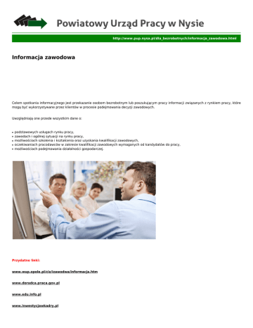 http://www.pup.nysa.pl/dla_bezrobotnych/informacja_zawodowa.html Informacja zawodowa INFORMACJA ZAWODOWA Celem spotkania informacyjnego jest przekazanie osobom bezrobotnym lub poszukującym pracy informacji związanych z rynkiem pracy, które mogą być wykorzystywane przez klientów w procesie podejmowania decyzji zawodowych. Uwzględniają one przede wszystkim dane o: ● ● ● ● ● podstawowych usługach rynku pracy, zawodach i ogólnej sytuacji na rynku pracy, możliwościach szkolenia i kształcenia oraz uzyskania kwalifikacji zawodowych, oczekiwaniach pracodawców w zakresie kwalifikacji zawodowych wymaganych od kandydatów do pracy, możliwościach podejmowania działalności gospodarczej. Przydatne linki: www.wup.opole.pl/ciz/izawodwa/informacja.htm www.doradca.praca.gov.pl www.edu.info.pl www.inwestycjawkadry.pl www.pracainauka.pl telefon: 774.489.921 - Agnieszka Wajdzik 774.489.921- Bernadeta Gołuszko pokój: Klub Pracy e-mail: Nazwa pliku Rozmiar Pobierz Kategoria: Informacja zawodowa [ 4 ] Adresy stron internetowych przydatnych dla osób planujących rozpoczęcie własnej działalności gospodarczej 72.27KB pobierz Dane adresowe instytucji specjalistycznych pomocnych w rozwiązywaniu problemu zawodowego bezrobotnego lub poszukującego pracy 99.07KB pobierz harmonogram grupowych informacji zawodowych - I kwartał 2017 77.5KB pobierz harmonogram grupowych informacji zawodowych -II kwartał 2017 82.5KB pobierz