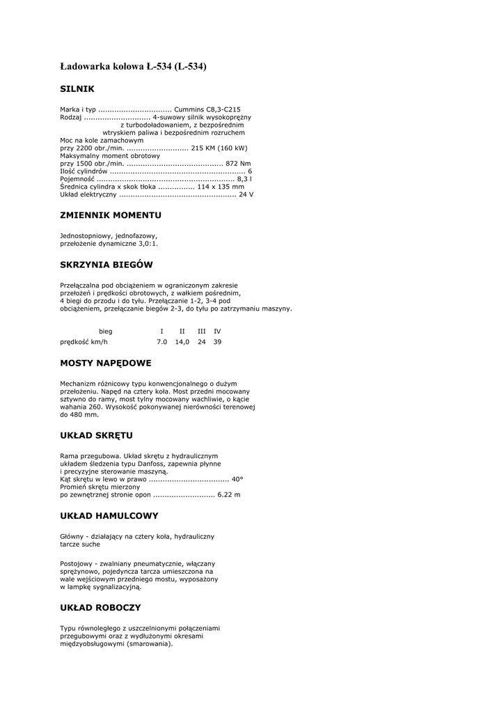 Ładowarka kołowa Ł-534 (L-534) SILNIK Marka i typ ................................ Cummins C8,3-C215 Rodzaj ............................. 4-suwowy silnik wysokoprężny z turbodoładowaniem, z bezpośrednim wtryskiem paliwa i bezpośrednim rozruchem Moc na kole zamachowym przy 2200 obr./min. ........................... 215 KM (160 kW) Maksymalny moment obrotowy przy 1500 obr./min. .......................................... 872 Nm Ilość cylindrów ........................................................... 6 Pojemność ............................................................ 8,3 l Średnica cylindra x skok tłoka ................ 114 x 135 mm Układ elektryczny ................................................... 24 V ZMIENNIK MOMENTU Jednostopniowy, jednofazowy, przełożenie dynamiczne 3,0:1. SKRZYNIA BIEGÓW Przełączalna pod obciążeniem w ograniczonym zakresie przełożeń i prędkości obrotowych, z wałkiem pośrednim, 4 biegi do przodu i do tyłu. Przełączanie 1-2, 3-4 pod obciążeniem, przełączanie biegów 2-3, do tyłu po zatrzymaniu maszyny. bieg prędkość km/h I II III IV 7.0 14,0 24 39 MOSTY NAPĘDOWE Mechanizm różnicowy typu konwencjonalnego o dużym przełożeniu. Napęd na cztery koła. Most przedni mocowany sztywno do ramy, most tylny mocowany wachliwie, o kącie wahania 260. Wysokość pokonywanej nierówności terenowej do 480 mm. UKŁAD SKRĘTU Rama przegubowa. Układ skrętu z hydraulicznym układem śledzenia typu Danfoss, zapewnia płynne i precyzyjne sterowanie maszyną. Kąt skrętu w lewo w prawo ................................... 40° Promień skrętu mierzony po zewnętrznej stronie opon ........................... 6.22 m UKŁAD HAMULCOWY Główny - działający na cztery koła, hydrauliczny tarcze suche Postojowy - zwalniany pneumatycznie, włączany sprężynowo, pojedyncza tarcza umieszczona na wale wejściowym przedniego mostu, wyposażony w lampkę sygnalizacyjną. UKŁAD ROBOCZY Typu równoległego z uszczelnionymi połączeniami przegubowymi oraz z wydłużonymi okresami międzyobsługowymi (smarowania). OPONY 23,5 x 25 -20PR (L-3) HYDRAULIKA UKŁADU ROBOCZEGO Typu otwartego Czas podnoszenia wysięgnika 6,5 sek. Czas opuszczania wysięgnika 3,5sek. Czas wysypu łyżki 2 sek. Zbiornik: wyposażony we wziernik i jeden filtr 10 µ. filtr wlewowy z odpowietrznikiem. Pompy: zębate napędzane od silnika przez przekładnie zębate zmiennika momentu. Układ roboczy: wydatek 400 l/min. przy 2200 obr./min. i ciśnieniu 15 MPa. Układ skrętu: wydatek 160 l/min przy 2200 obr/min i ciśnieniu 10 MPa. Rozdzielacz główny: trójsekcyjny, z zaworem bezpieczeństwa. dwusekcyjny z zaworem bezpieczeństwa. Ciśnienie zaworu bezpieczeństwa: 15 MPa. Cylindry (podwójnego działania) - hartowane i chromowane tłoczyska: - wysięgnik, średnica x skok (2) .................. 160 x 860mm - łyżka, średnica x skok (2) .......................... 160x 470 mm - układ skrętu, średnica x skok (2) ................ 110 x 442 mm STEROWANIE HYDRAULICZNE Położenia wysięgnika: podnoszenie, trzymanie, opuszczanie, położenie pływające Położenie łyżki: zamykanie, trzymanie, otwieranie. POJEMNOŚCI UKŁADÓW (serwisowe) Układ chłodzenia ......................................................... 80 Układ smarowania: - miska olejowa silnika ................................................. 20 - skrzynia biegów i zmiennik momentu ............................ 50 - mechanizm różnicowy i przekładnia planetarna mostu przedniego ...................................................... 40 - mechanizm różnicowy i przekładnia planetarna mostu tylnego .......................................................... 40 Układ hydrauliczny .................................................... 230 Zbiornik paliwa .......................................................... 300 PRZYRZĄDY KONTROLNO-POMIAROWE Wskaźniki: ciśnienia powietrza, temperatury płynu chłodzącego silnik, ciśnienia oleju silnika, poziomu paliwa, temperatury oleju w zmienniku momentu, tachometr, prędkościomierz, woltomierz. Lampki ostrzegawcze: przekroczenia temperatury w zmienniku momentu, przekro-czenia temperatury płynu chłodzącego silnik, niskiego ciśnienia oleju silnika, zanieczyszczenia filtra oleju skrzyni biegów oraz układu roboczego, niskiego ciśnienia powietrza w układzie hamulcowym, niskiego poziomu paliwa, zanieczyszczenia filtra powietrza, włączonego hamulca postojowego. Wzierniki kontrolne: poziomu oleju w zbiorniku hydraulicznym, poziomu oleju w skrzyni biegów.