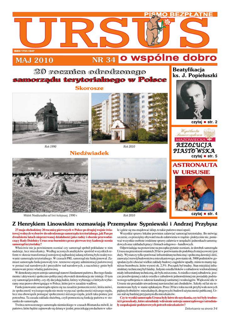 Beatyfikacja ks. J. Popie³uszki Skorosze Fot. I Barski czytaj n str. 2 Rok 1990 Rok 2010 NiedŸwiadek REZOLUCJA PIASTOWSKA czytaj n str. 5 Fot. I Barski ASTRONAUTA W URSUSIE Widok NiedŸwiadka od linii kolejowej, 1990 r. Rok 2010 czytaj n str. 4 Z Henrykiem Linowskim rozmawiaj¹ Przemys³aw Sypniewski i Andrzej Przybysz 27 maja obchodzimy 20 rocznicę pierwszych w Polsce po drugiej wojnie świa− towej wolnych wyborów do odrodzonego samorządu terytorialnego, jak Pan po dwudziestu latach nieprzerwanej działalności jako radny i obecnie przewodni− czący Rady Dzielnicy Ursus oraz burmistrz przez pierwsze trzy kadencje ocenia samorząd terytorialny? Właściwie nie ja powinienem oceniać czy samorząd spełnił pokładane w nim nadzieje, lecz mieszkańcy. Według uczonych analityków spośród wszystkich re− form w okresie transformacji ustrojowej najbardziej udaną reformą było reaktywo− wanie samorządu terytorialnego. W czasach PRL samorząd nie funkcjonował. Za− miast samorządu funkcjonowały tzw. terenowe organy administracji państwowej w postaci rad narodowych i prezydiów rad narodowych, a naczelnicy gmin byli mianowani przez władzę państwową. W demokratycznym ustroju samorząd stanowi fundament państwa. Bez tego funda− mentu i aktywności społeczno−politycznej obywateli demokracja nie istnieje. O tym czy samorząd jest dobry, czy zły decydują ludzie, którzy wybierają i ci których wybie− ramy oraz prawo obowiązujące w Polsce, które jest w zasadzie wadliwe. Funkcjonowanie samorządu opiera się na zasadzie pomocniczości, która mówi, że społeczność wyższego rzędu nie może wyręczać społeczności niższego rzędu, lecz ma obowiązek pomagać społeczności niższego rzędu, jeżeli taka pomoc jest potrzebna. Ta zasada zakłada służebną, czyli pomocniczą funkcję państwa w sto− sunku do samorządu. Twórca nowoczesnego samorządu niemieckiego w czasach Bismarcka mówił, że państwo, które będzie zajmowało się dziurą w jezdni, przeciekającym dachem w szko− le i gdzie się ma znajdować sklep, to takie państwo musi upaść. Wszystkie sprawy lokalne powinien załatwiać samorząd terytorialny. Bo mówiąc szczerze, co przeciętny obywatel ma do załatwienia w rządzie− praktycznie nic, ponie− waż wszystkie osobiste i rodzinne sprawy załatwia w urzędach i jednostkach samorzą− dowych oraz zakładach pracy i firmach usługowo – handlowych. Odpowiadając na postawione na początku pytanie oceniam, że dorobek samorządu Ursusa na przestrzeni ostatnich 20 lat w porównaniu do podobnych miejscowości jest duży. Wystarczy tylko porównać infrastrukturę techniczną i społeczną dawniej i dziś, zauważyć rozwój budownictwa mieszkaniowego, powstanie ok. 5000 podmiotów go− spodarczych i chociaż wielkie zakłady budowy ciągników upadły, mimo to mamy naj− niższe bezrobocie, które wynosi ok. 2,5%. Początek był trudny. Stan miejskiej infra− struktury technicznej był fatalny. Jedynie osiedla bloków o zabudowie wielorodzinnej miały infrastrukturę techniczną, ale była zniszczona. A osiedla o starej zabudowie, jesz− cze przedwojennej a także osiedla o zabudowie jednorodzinnej nie posiadały podsta− wowego uzbrojenia w zakresie kanalizacji sanitarnej i wodociągów. Większość ulic w Ursusie nie posiadało utwardzonej nawierzchni ani chodników. Szkoły od lat nie re− montowane były w stanie opłakanym. Przez 20 lat z roku na rok przybywało nowych pięknych obiektów: mieszkalnych, drogowych i budowli użyteczności publicznej. Ur− sus stał się bardziej przyjaznym dla mieszkańców. Czy te wyniki samorządu Ursusa były łatwe do uzyskania, czy też były trudno− ści i przeszkody, które utrudniały wdrożenie ustroju samorządowego i utrudnia− ły zaspakajanie podstawowych potrzeb mieszkańców? Dokoñczenie na stronie 3-4 2 Ks. Jerzy wyraziciel najg³êbszych pragnieñ Narodu Dziwna ta polska ziemia, która w każdej epoce rodzi wciąż nowych wyznawców, ale i męczenników. Gdy w 1979 r. święciliśmy w Ojczyźnie jubileusz 900−lecia męczeń− skiej śmierci św. Stanisława, biskupa kra− kowskiego, Ojciec Święty mówił wówczas o nim: „Męczennik ładu moralnego”. Rok 1982 był nam okazją do uczczenia św. Maksymiliana Kolbego, którego Jan Paweł II kanonizował i takim pięknym tytułem go obdarzył: Męczennik miłości. Dziś myśl nasza krąży wokół zamordowanego ks. Po− piełuszki − i niektórzy nazywają go Mę− czennikiem prawdy. Bo stróżował przy tej prawdzie, którą przyjął za swoją i której słu− żył (por. kard. Gulbinowicz). 6 czerwca 2010 roku w dniu dziękczy− nienia całą wspólnotą Kościoła w Polsce będziemy świętować, a zarazem dziękować, że mamy nowego orędownika w niebie. Nowego błogosławionego księdza Jerzego Popiełuszkę. Jan Ewangelista na kartach swojej Ewangelii mówi: „Je− żeli ziarno pszenicy wpadłszy w ziemię nie obumrze, zostanie tylko samo, ale jeżeli obumrze, przynosi plon obfity” (J 12, 24). Patrząc na życie sługi Boże− go księdza Jerzego możemy śmiało powiedzieć, że Jego życie wydało plon obfity. „Jego przesłanie, potrzebne ćwierć wieku temu, nie przestało być ak− tualne także i dzisiaj” – mówił ks. abp Kazimierz Nycz podczas sesji nauko− wej o księdzu Jerzym. Śmierć ks. Popiełuszki jest przestrogą, do czego może doprowadzić nienawiść do wiary, do Kościoła, do człowieka. Z dnia męczeń− skiej śmierci nie powinniśmy robić jubileuszu, lecz pamiętać o tym, co się wtedy stało. „Narodził się męczennik, narodził się człowiek dla nieba. Można powiedzieć, że oddał swoje życie w obronie Kościoła, w obronie wiary, w obronie godności człowieka”[por. abp Nycz]. Mamy kapłana, który będzie patronem wszystkich poszukujących Prawdy. Takie osoby przyciągał do sie− bie za życia. Ważne, że przesłanie ks. Jerzego, poparte