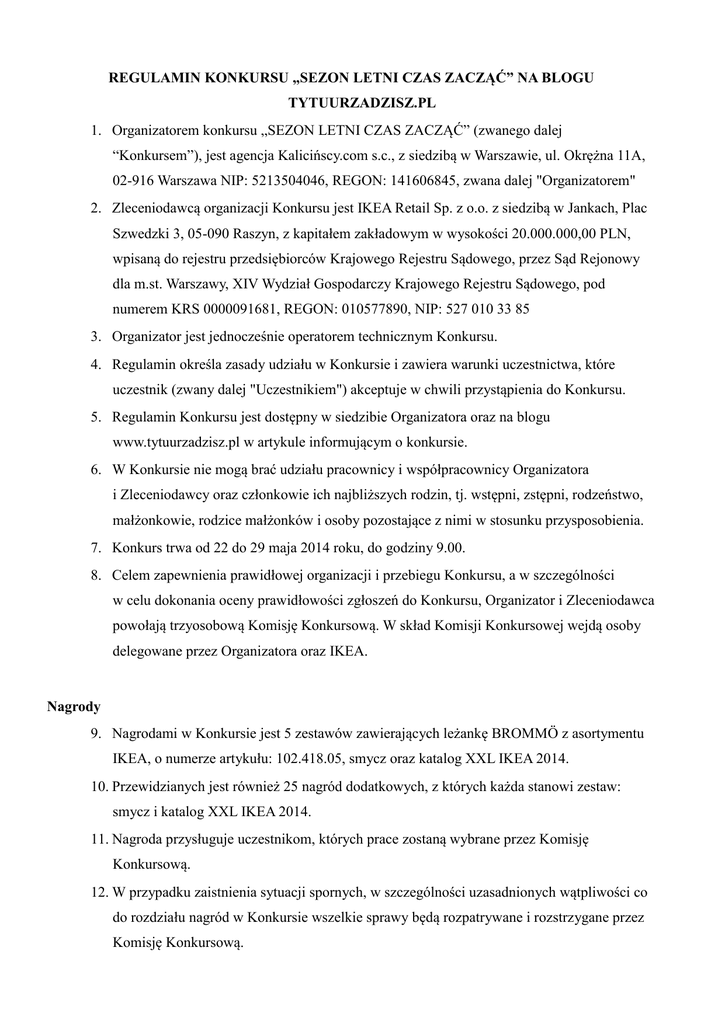 REGULAMIN KONKURSU „SEZON LETNI CZAS ZACZĄĆ” NA BLOGU TYTUURZADZISZ.PL 1. Organizatorem konkursu „SEZON LETNI CZAS ZACZĄĆ” (zwanego dalej “Konkursem”), jest agencja Kalicińscy.com s.c., z siedzibą w Warszawie, ul. Okrężna 11A, 02-916 Warszawa NIP: 5213504046, REGON: 141606845, zwana dalej "Organizatorem" 2. Zleceniodawcą organizacji Konkursu jest IKEA Retail Sp. z o.o. z siedzibą w Jankach, Plac Szwedzki 3, 05-090 Raszyn, z kapitałem zakładowym w wysokości 20.000.000,00 PLN, wpisaną do rejestru przedsiębiorców Krajowego Rejestru Sądowego, przez Sąd Rejonowy dla m.st. Warszawy, XIV Wydział Gospodarczy Krajowego Rejestru Sądowego, pod numerem KRS 0000091681, REGON: 010577890, NIP: 527 010 33 85 3. Organizator jest jednocześnie operatorem technicznym Konkursu. 4. Regulamin określa zasady udziału w Konkursie i zawiera warunki uczestnictwa, które uczestnik (zwany dalej "Uczestnikiem") akceptuje w chwili przystąpienia do Konkursu. 5. Regulamin Konkursu jest dostępny w siedzibie Organizatora oraz na blogu www.tytuurzadzisz.pl w artykule informującym o konkursie. 6. W Konkursie nie mogą brać udziału pracownicy i współpracownicy Organizatora i Zleceniodawcy oraz członkowie ich najbliższych rodzin, tj. wstępni, zstępni, rodzeństwo, małżonkowie, rodzice małżonków i osoby pozostające z nimi w stosunku przysposobienia. 7. Konkurs trwa od 22 do 29 maja 2014 roku, do godziny 9.00. 8. Celem zapewnienia prawidłowej organizacji i przebiegu Konkursu, a w szczególności w celu dokonania oceny prawidłowości zgłoszeń do Konkursu, Organizator i Zleceniodawca powołają trzyosobową Komisję Konkursową. W skład Komisji Konkursowej wejdą osoby delegowane przez Organizatora oraz IKEA. Nagrody 9. Nagrodami w Konkursie jest 5 zestawów zawierających leżankę BROMMÖ z asortymentu IKEA, o numerze artykułu: 102.418.05, smycz oraz katalog XXL IKEA 2014. 10. Przewidzianych jest również 25 nagród dodatkowych, z których każda stanowi zestaw: smycz i katalog XXL IKEA 2014. 11. Nagroda przysługuje uczestnikom, których prace zostaną wybrane przez Komisję Konkursową. 12. W przypadku zaistnienia sytuacji spornych, w szczególności uzasadnionych wątpliwości co do rozdziału nagród w Konkursie wszelkie sprawy będą rozpatrywane i rozstrzygane przez Komisję Konkursową. 13. Wydanie nagród nastąpi zgodnie z obowiązującymi przepisami podatkowymi, a podatek od wygranej nagrody pokrywa Organizator. 14. Zwycięzcy Konkursu nie przysługuje roszczenie o wypłatę wartości nagrody w gotówce. 15. Zwycięzca Konkursu nie ma możliwości zamiany nagrody. 16. Zwycięzca nie może przenieść prawa do nagrody na inne osoby. 17. Ze zwycięzcami Organizator skontaktuje się nie później niż do 4 czerwca 2014 roku. Warunki uczestnictwa 18. Uczestnikiem Konkursu może być: osoba fizyczna mająca ukończone 18 lat, posiadająca obywatelstwo polskie, posiadająca pełną zdolność do czynności prawnych, konsument w myśl art. 221 Kodeksu Cywilnego, oraz posiadająca miejsce stałego zamieszkania w Polsce, 19. Warunkiem przystąpienia do Konkursu jest wypełnienie formularza na blogu oraz odpowiedzenie na pytanie: Jak zaaranżujesz swój balkon przy pomocy produktów IKEA? Uczestnik przystępując do Konkursu wyraża zgodę na opublikowanie swojego zgłoszenia do konkursu, jak też jego modyfikacji i wykorzystania na blogu www.tytuurzadzisz.pl w artykułach związanych z Konkursem. 20. Administratorem danych jest Organizator - Agencja Kalicińscy.com s.c., z siedzibą w Warszawie, ul. Okrężna 11A, 02-916 Warszawa. Organizator będzie przetwarzać dane osobowe Uczestników w celach związanych z organizacją Konkursu, sprawozdawczością podatkową i księgową, w celu zamieszczenia listy Zwycięzców. 21. Dane Uczestników przetwarzane będą zgodnie z postanowieniami ustawy o ochronie danych osobowych (Dz. U. z 2002 r., nr 101, poz. 926 z pózn. zm.). 22. Realizując zadanie Konkursu uczestnik tym samym oświadcza, że zapoznał się z treścią niniejszego Regulaminu, wyraża zgodę na jego treść oraz akceptuje jego warunki. 23. Uczestnictwo w Konkursie polega na spełnieniu oznaczonych w niniejszym Regulaminie zadań, z zastrzeżeniem, iż w ramach ich realizacji Uczestnicy mają obowiązek przestrzegania wszystkich obowiązujących przepisów prawa oraz niniejszego Regulaminu. Zadania Uczestnika Konkursu 24. Uczestnik realizuje zadania Konkursu poprzez wypełnienie formularza na blogu w artykule „Sezon letni czas zacząć”. 25. Zadaniem konkursowym uczestnika jest wypełnienie formularza na blogu oraz odpowiedzenie na pytanie: Jak zaaranżujesz swój balkon przy pomocy produktów IKEA? Z laureatami Konkursu Organizator skontaktuje się nie później niż do 7 czerwca 2014 roku w celu ustalenia danych potrzebnych w celu przekazania nagrody. Odbiór nagród 26. Uczestnik Konkursu, któremu przysługuje nagroda zobowiązany jest przekazać Organizatorowi swoje dane teleadresowe w postaci: imienia i nazwiska, adresu wysyłki oraz numeru telefonu komórkowego, wysyłając je w wiadomości e-mail na adres [email protected]. 27. Uczestnik Konkursu, któremu przysługuje nagroda zobowiązany jest przekazać swoje dane teleadresowe w terminie do 11 czerwca 2014. 28. Wysyłka nagród nastąpi nie później niż 24 czerwca 2014. 29. W przypadku jeśli Uczestnik Konkursu, któremu przysługuje nagroda nie prześle wymaganych danych teleadresowych w terminie określonym w punkcie 27. niniejszego regulaminu, nagroda przepada w takiej sytuacji na rzecz IKEA i pozostaje w jej gestii. 30. Organizator nie ponosi odpowiedzialności za zmianę miejsca zamieszkania lub podanego przez Uczestnika adresu do korespondencji Uczestnika Konkursu lub zmianę innych danych – uniemożliwiającą przesłanie Uczestnikowi nagrody, jak również za niemożność odbioru lub nieodebranie nagrody, z jakiejkolwiek innej przyczyny leżącej po stronie Uczestnika. W takim przypad