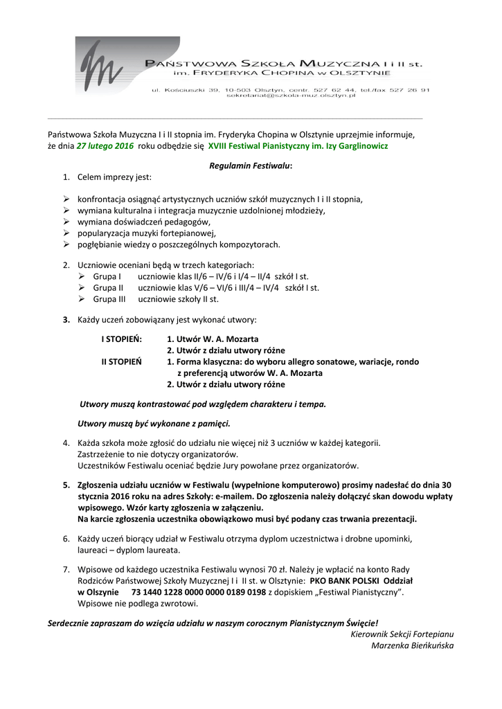 ____________________________________________________________________________________________________ Państwowa Szkoła Muzyczna I i II stopnia im. Fryderyka Chopina w Olsztynie uprzejmie informuje, że dnia 27 lutego 2016 roku odbędzie się XVIII Festiwal Pianistyczny im. Izy Garglinowicz Regulamin Festiwalu: 1. Celem imprezy jest: konfrontacja osiągnąć artystycznych uczniów szkół muzycznych I i II stopnia, wymiana kulturalna i integracja muzycznie uzdolnionej młodzieży, wymiana doświadczeń pedagogów, popularyzacja muzyki fortepianowej, pogłębianie wiedzy o poszczególnych kompozytorach. 2. Uczniowie oceniani będą w trzech kategoriach: Grupa I uczniowie klas II/6 – IV/6 i I/4 – II/4 szkół I st. Grupa II uczniowie klas V/6 – VI/6 i III/4 – IV/4 szkół I st. Grupa III uczniowie szkoły II st. 3. Każdy uczeń zobowiązany jest wykonać utwory: I STOPIEŃ: II STOPIEŃ 1. Utwór W. A. Mozarta 2. Utwór z działu utwory różne 1. Forma klasyczna: do wyboru allegro sonatowe, wariacje, rondo z preferencją utworów W. A. Mozarta 2. Utwór z działu utwory różne Utwory muszą kontrastować pod względem charakteru i tempa. Utwory muszą być wykonane z pamięci. 4. Każda szkoła może zgłosić do udziału nie więcej niż 3 uczniów w każdej kategorii. Zastrzeżenie to nie dotyczy organizatorów. Uczestników Festiwalu oceniać będzie Jury powołane przez organizatorów. 5. Zgłoszenia udziału uczniów w Festiwalu (wypełnione komputerowo) prosimy nadesłać do dnia 30 stycznia 2016 roku na adres Szkoły: e-mailem. Do zgłoszenia należy dołączyć skan dowodu wpłaty wpisowego. Wzór karty zgłoszenia w załączeniu. Na karcie zgłoszenia uczestnika obowiązkowo musi być podany czas trwania prezentacji. 6. Każdy uczeń biorący udział w Festiwalu otrzyma dyplom uczestnictwa i drobne upominki, laureaci – dyplom laureata. 7. Wpisowe od każdego uczestnika Festiwalu wynosi 70 zł. Należy je wpłacić na konto Rady Rodziców Państwowej Szkoły Muzycznej I i II st. w Olsztynie: PKO BANK POLSKI Oddział w Olszynie 73 1440 1228 0000 0000 0189 0198 z dopiskiem „Festiwal Pianistyczny”. Wpisowe nie podlega zwrotowi. Serdecznie zapraszam do wzięcia udziału w naszym corocznym Pianistycznym Święcie! Kierownik Sekcji Fortepianu Marzenka Bieńkuńska