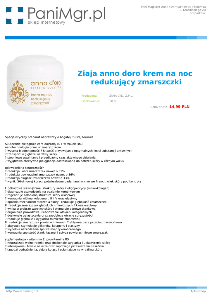 Pani Magister Anna Czerniachowicz-Piskorska ul. Krasińskiego 2B Stąporków Ziaja anno doro krem na noc redukujący zmarszczki Producent: ZIAJA LTD. Z.P.L. Opakowanie: 50 ml Cena brutto: 14,99 PLN Specjalistyczny preparat naprawczy o bogatej, tłustej formule. Skutecznie pielęgnuje cerę dojrzałą 40+ w trakcie snu. nanotechnologia przeciw zmarszczkom ? wysoka biodostępność ? łatwość przyswajania optymalnych ilości substancji aktywnych ? transport w głębsze warstwy skóry ? stopniowe uwalnianie i przedłużony czas aktywnego działania ? wyjątkowo efektywna pielęgnacja dostosowana do potrzeb skóry w różnym wieku udowodniona skuteczność* ? redukcja ilości zmarszczek nawet o 31% ? redukcja powierzchni zmarszczek nawet o 36% ? redukcja długości zmarszczek nawet o 33% * wyniki 56-dniowej kuracji potwierdzone badaniami in vivo we Francji. wiek skóry pod kontrolą I. odbudowa wewnętrznej struktury skóry ? oligopeptydy (mikro-kolagen) ? diagnozuje uszkodzenia na poziomie komórkowym ? regeneruje osłabioną strukturę skóry właściwej ? wzmacnia włókna kolagenu I, II i IV oraz elastyny ? opóźnia mechanizm starzenia skóry i redukuje głębokość zmarszczek II. redukcja zmarszczek głębokich i mimicznych ? kwas ursolowy ? wnika w głębsze warstwy skóry i stymuluje odnowę tkankową ? organizuje prawidłowe usieciowanie włókien kolagenowych ? doskonale uelastycznia oraz zapobiega utracie sprężystości ? redukuje głębokie i wygładza mimiczne zmarszczki III. redukcja zmarszczek powierzchniowych ? aktywna baza przeciwzmarszczkowa ? aktywuje stymulację glikanów, kolagenu i elastyny ? wypełnia uszkodzenia spoiwa międzykomórkowego ? wzmacnia spoistość tkanki łącznej i spłyca powierzchniowe zmarszczki suplementacja - witamina E, prowitamina B5 ? neutralizuje wolne rodniki oraz doskonale wygładza i uelastycznia skórę ? intensywnie i trwale nawilża oraz zapobiega przesuszaniu naskórka ? łagodzi podrażnienia, działa kojąco i osłaniająco na wrażliwą skórę http://www.panimgr.pl AptusShop