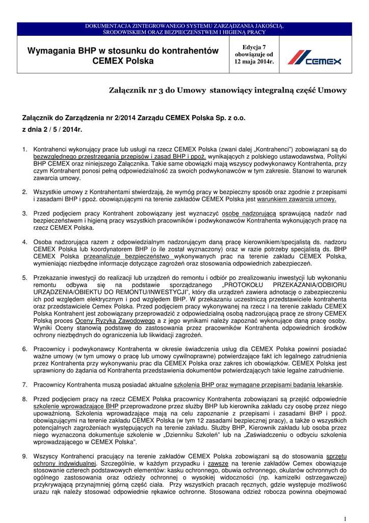 DOKUMENTACJA ZINTEGROWANEGO SYSTEMU ZARZĄDZANIA JAKOŚCIĄ, ŚRODOWISKIEM ORAZ BEZPIECZEŃSTWEM I HIGIENĄ PRACY Wymagania BHP w stosunku do kontrahentów CEMEX Polska Edycja 7 obowiązuje od 12 maja 2014r. Załącznik nr 3 do Umowy stanowiący integralną część Umowy Załącznik do Zarządzenia nr 2/2014 Zarządu CEMEX Polska Sp. z o.o. z dnia 2 / 5 / 2014r. 1. Kontrahenci wykonujący prace lub usługi na rzecz CEMEX Polska (zwani dalej „Kontrahenci”) zobowiązani są do bezwzględnego przestrzegania przepisów i zasad BHP i ppoż. wynikających z polskiego ustawodawstwa, Polityki BHP CEMEX oraz niniejszego Załącznika. Takie same obowiązki mają wszyscy podwykonawcy Kontrahenta, przy czym Kontrahent ponosi pełną odpowiedzialność za swoich podwykonawców w tym zakresie. Stanowi to warunek zawarcia umowy. 2. Wszystkie umowy z Kontrahentami stwierdzają, że wymóg pracy w bezpieczny sposób oraz zgodnie z przepisami i zasadami BHP i ppoż. obowiązującymi na terenie zakładów CEMEX Polska jest warunkiem zawarcia umowy. 3. Przed podjęciem pracy Kontrahent zobowiązany jest wyznaczyć osobę nadzorującą sprawującą nadzór nad bezpieczeństwem i higieną pracy wszystkich pracowników i podwykonawców Kontrahenta wykonujących pracę na rzecz CEMEX Polska. 4. Osoba nadzorująca razem z odpowiedzialnym nadzorującym daną pracę kierownikiem/specjalistą ds. nadzoru CEMEX Polska lub koordynatorem BHP (o ile został wyznaczony) oraz w razie potrzeby specjalistą ds. BHP CEMEX Polska przeanalizuje bezpieczeństwo wykonywanych prac na terenie zakładu CEMEX Polska, wymieniając niezbędne informacje dotyczące zagrożeń oraz stosowania odpowiednich zabezpieczeń. 5. Przekazanie inwestycji do realizacji lub urządzeń do remontu i odbiór po zrealizowaniu inwestycji lub wykonaniu remontu odbywa się na podstawie sporządzanego „PROTOKOŁU PRZEKAZANIA/ODBIORU URZĄDZENIA/OBIEKTU DO REMONTU/INWESTYCJI”, który dla urządzeń zawiera adnotację o zabezpieczeniu ich pod względem elektrycznym i pod względem BHP. W przekazaniu uczestniczą przedstawiciele kontrahenta oraz przedstawiciele Cemex Polska. Przed podjęciem pracy wykonywanej na rzecz i na terenie zakładu CEMEX Polska Kontrahent jest zobowiązany przeprowadzić z odpowiedzialną osobą nadzorującą pracę ze strony CEMEX Polską proces Oceny Ryzyka Zawodowego a z jego wynikami należy zapoznać wykonujące daną pracę osoby. Wyniki Oceny stanowią podstawę do zastosowania przez pracowników Kontrahenta odpowiednich środków ochrony niezbędnych do ograniczenia lub likwidacji zagrożeń. 6. Pracownicy i podwykonawcy Kontrahenta w okresie świadczenia usług dla CEMEX Polska powinni posiadać ważne umowy (w tym umowy o pracę lub umowy cywilnoprawne) potwierdzające fakt ich legalnego zatrudnienia przez Kontrahenta przy wykonywaniu prac dla CEMEX Polska oraz zakres ich obowiązków. CEMEX Polska jest uprawniony do żądania od Kontrahenta przedstawienia dokumentów potwierdzających takie legalne zatrudnienie. 7. Pracownicy Kontrahenta muszą posiadać aktualne szkolenia BHP oraz wymagane przepisami badania lekarskie. 8. Przed podjęciem pracy na rzecz CEMEX Polska pracownicy Kontrahenta zobowiązani są przejść odpowiednie szkolenie wprowadzające BHP przeprowadzone przez służby BHP lub kierownika zakładu czy osobę przez niego upoważnioną. Szkolenia wprowadzające mają na celu zapoznanie z przepisami i zasadami BHP i ppoż. obowiązującymi na terenie zakładu CEMEX Polska (w tym 12 zasadami bezpiecznej pracy), a także o wszystkich potencjalnych zagrożeniach występujących na terenie zakładu. Służby BHP, Kierownik zakładu lub osoba przez niego wyznaczona dokumentuje szkolenie w „Dzienniku Szkoleń” lub na „Zaświadczeniu o odbyciu szkolenia wprowadzającego w CEMEX Polska”. 9. Wszyscy Kontrahenci pracujący na terenie zakładów CEMEX Polska zobowiązani są do stosowania sprzętu ochrony indywidualnej. Szczególnie, w każdym przypadku i zawsze na terenie zakładów Cemex obowiązuje stosowanie czterech podstawowych elementów: kasku ochronnego, obuwia ochronnego, okularów ochronnych do ogólnego zastosowania oraz odzieży ochronnej o wysokiej widoczności (np. kamizelki ostrzegawczej) przykrywającą przynajmniej górną część ciała. Przy wszystkich pracach ręcznych, gdzie występuje możliwość urazu rąk należy stosować odpowiednie rękawice ochronne. Stosowana odzież robocza powinna obejmować 1 koszulę lub kurtkę posiadającą długie rękawy oraz spodnie z długimi nogawkami. Przy przeładunku materiałów sypkich po ciśnieniem (cement, popioły, inne) obowiązuje bezwzględne stosowanie gogli ochronnych. Tam gdzie to konieczne należy stosować inne, właściwe do danego zagrożenia środki ochrony indywidualnej. 10. Sprzęt ochrony indywidualnej stosowany przez pracowników Kontrahenta musi być zgodny z zasadniczymi wymaganiami dla środków ochrony indywidualnej. Wszelki sprzęt pomocniczy – rusztowania, drabiny, narzędzia oraz inne używane materiały muszą posiadać również wymagane atesty lub deklarację zgodności. 11. Prace o szczególnym zagrożeniu muszą być wykonywane – w myśl obowiązujących przepisów, – przez co najmniej 2 osoby i pod bezpośrednim nadzorem wyznaczonych w tym celu przez kontrahenta osób. 12. Transport osób i towarów na terenie, a także do i z zakładów CEMEX Polska musi odbywać się zgodnie z obowiązującymi przepisami w tym przepisami dotyczącymi warunków pracy kierowców, przepisami ruchu drogowego, przepisami i zasadami BHP i ppoż, środkami transportu do tego przystosowanymi oraz posiadającymi wszelkie niezbędne elementy bezpieczeństwa (w tym światła, kierunkowskazy, lusterka oraz wymagane prawem dokumenty dotyczące pojazdu, i danego typu przewozu). Wszelkie inne pojazdy wykorzystywane do świadczenia usług na rzecz CEMEX Polska muszą spełniać powyższe wymagania oraz inne zawarte w odpowiednich pr