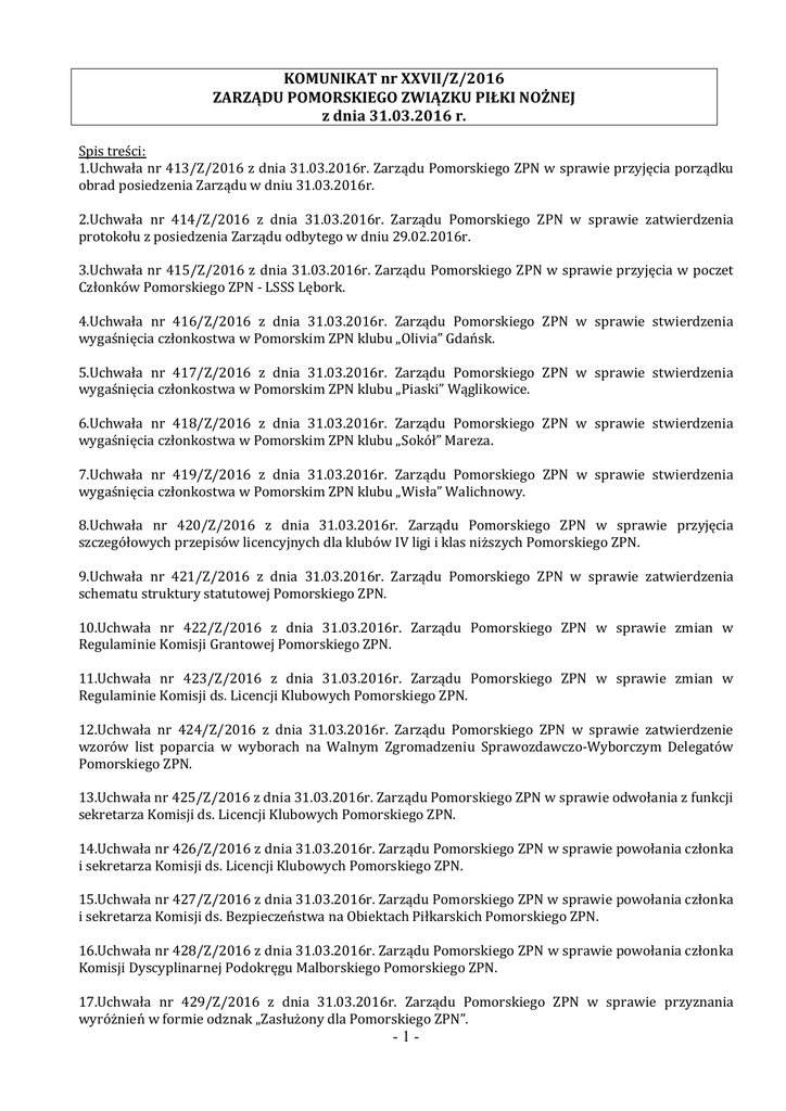 KOMUNIKAT nr XXVII/Z/2016 ZARZĄDU POMORSKIEGO ZWIĄZKU PIŁKI NOŻNEJ z dnia 31.03.2016 r. Spis treści: 1.Uchwała nr 413/Z/2016 z dnia 31.03.2016r. Zarządu Pomorskiego ZPN w sprawie przyjęcia porządku obrad posiedzenia Zarządu w dniu 31.03.2016r. 2.Uchwała nr 414/Z/2016 z dnia 31.03.2016r. Zarządu Pomorskiego ZPN w sprawie zatwierdzenia protokołu z posiedzenia Zarządu odbytego w dniu 29.02.2016r. 3.Uchwała nr 415/Z/2016 z dnia 31.03.2016r. Zarządu Pomorskiego ZPN w sprawie przyjęcia w poczet Członków Pomorskiego ZPN - LSSS Lębork. 4.Uchwała nr 416/Z/2016 z dnia 31.03.2016r. Zarządu Pomorskiego ZPN w sprawie stwierdzenia wygaśnięcia członkostwa w Pomorskim ZPN klubu „Olivia” Gdańsk. 5.Uchwała nr 417/Z/2016 z dnia 31.03.2016r. Zarządu Pomorskiego ZPN w sprawie stwierdzenia wygaśnięcia członkostwa w Pomorskim ZPN klubu „Piaski” Wąglikowice. 6.Uchwała nr 418/Z/2016 z dnia 31.03.2016r. Zarządu Pomorskiego ZPN w sprawie stwierdzenia wygaśnięcia członkostwa w Pomorskim ZPN klubu „Sokół” Mareza. 7.Uchwała nr 419/Z/2016 z dnia 31.03.2016r. Zarządu Pomorskiego ZPN w sprawie stwierdzenia wygaśnięcia członkostwa w Pomorskim ZPN klubu „Wisła” Walichnowy. 8.Uchwała nr 420/Z/2016 z dnia 31.03.2016r. Zarządu Pomorskiego ZPN w sprawie przyjęcia szczegółowych przepisów licencyjnych dla klubów IV ligi i klas niższych Pomorskiego ZPN. 9.Uchwała nr 421/Z/2016 z dnia 31.03.2016r. Zarządu Pomorskiego ZPN w sprawie zatwierdzenia schematu struktury statutowej Pomorskiego ZPN. 10.Uchwała nr 422/Z/2016 z dnia 31.03.2016r. Zarządu Pomorskiego ZPN w sprawie zmian w Regulaminie Komisji Grantowej Pomorskiego ZPN. 11.Uchwała nr 423/Z/2016 z dnia 31.03.2016r. Zarządu Pomorskiego ZPN w sprawie zmian w Regulaminie Komisji ds. Licencji Klubowych Pomorskiego ZPN. 12.Uchwała nr 424/Z/2016 z dnia 31.03.2016r. Zarządu Pomorskiego ZPN w sprawie zatwierdzenie wzorów list poparcia w wyborach na Walnym Zgromadzeniu Sprawozdawczo-Wyborczym Delegatów Pomorskiego ZPN. 13.Uchwała nr 425/Z/2016 z dnia 31.03.2016r. Zarządu Pomorskiego ZPN w sprawie odwołania z funkcji sekretarza Komisji ds. Licencji Klubowych Pomorskiego ZPN. 14.Uchwała nr 426/Z/2016 z dnia 31.03.2016r. Zarządu Pomorskiego ZPN w sprawie powołania członka i sekretarza Komisji ds. Licencji Klubowych Pomorskiego ZPN. 15.Uchwała nr 427/Z/2016 z dnia 31.03.2016r. Zarządu Pomorskiego ZPN w sprawie powołania członka i sekretarza Komisji ds. Bezpieczeństwa na Obiektach Piłkarskich Pomorskiego ZPN. 16.Uchwała nr 428/Z/2016 z dnia 31.03.2016r. Zarządu Pomorskiego ZPN w sprawie powołania członka Komisji Dyscyplinarnej Podokręgu Malborskiego Pomorskiego ZPN. 17.Uchwała nr 429/Z/2016 z dnia 31.03.2016r. Zarządu Pomorskiego ZPN w sprawie przyznania wyróżnień w formie odznak „Zasłużony dla Pomorskiego ZPN”. -1- 18.Uchwała nr 430/Z/2016 z dnia 31.03.2016r. Zarządu Pomorskiego ZPN w sprawie zatwierdzenia obserwatora na sezon rozgrywkowy 2015/2016. -2- -1Uchwała nr 413/Z/2016 z dnia 31 marca 2016 roku Zarządu Pomorskiego Związku Piłki Nożnej w sprawie przyjęcia porządku obrad posiedzenia Zarządu w dniu 31.03.2016r. Na podstawie art. 35 § 1 ust. 19) Statutu Pomorskiego ZPN postanawia się, co następuje: I.Przyjmuje się porządek obrad posiedzenia Zarządu Pomorskiego ZPN odbywającego się w dniu 31.03.2016r. w przedstawionej wersji stanowiącej załącznik do niniejszej Uchwały. II.Realizację Uchwały powierza się prezesowi Pomorskiego ZPN. III.Uchwała wchodzi w życie z dniem podjęcia. Prezes Pomorskiego ZPN Radosław Michalski -2Uchwała nr 414/Z/2016 z dnia 31 marca 2016 roku Zarządu Pomorskiego Związku Piłki Nożnej w sprawie zatwierdzenia protokołu z posiedzenia Zarządu odbytego w dniu 29.02.2016r. Na podstawie art. 35 § 1 ust. 19) i art. 39 § 5 Statutu Pomorskiego ZPN postanawia się, co następuje: I.Zatwierdzenia się protokół z posiedzenia Zarządu Pomorskiego ZPN odbytego w dniu 29.02.2016r. w wersji stanowiącej załącznik do niniejszej Uchwały. II.Uchwała wchodzi w życie z dniem podjęcia. Prezes Pomorskiego ZPN Radosław Michalski -3Uchwała nr 415/Z/2016 z dnia 31 marca 2016 roku Zarządu Pomorskiego Związku Piłki Nożnej w sprawie przyjęcia w poczet Członków Pomorskiego ZPN - LSSS Lębork. Na podstawie art. 35 § 1 ust. 19) w związku z art. 15 i art. 12 § 1 ust. 1 Statutu Pomorskiego ZPN oraz § 5 ust. 1 oraz § 6 Uchwały nr XII/194 Zarządu PZPN z dnia 11 grudnia 2015 roku o członkostwie postanawia się co następuje: I.W poczet Członków Pomorskiego Związku Piłki Nożnej, a tym samym automatycznie w poczet Członków Polskiego Związku Piłki Nożnej, zostaje przyjęte: Lęborskie Stowarzyszenie Sympatyków Sportu z siedzibą w Lęborku. II.Realizację uchwały powierza się sekretarzowi Zarządu Pomorskiego ZPN. III.Uchwała wchodzi w życie z dniem podjęcia. Prezes Pomorskiego ZPN Radosław Michalski -4Uchwała nr 416/Z/2016 z dnia 31 marca 2016 roku Zarządu Pomorskiego Związku Piłki Nożnej w sprawie stwierdzenia wygaśnięcia członkostwa w Pomorskim ZPN klubu „Olivia” Gdańsk. -3- Na podstawie art. 35 § 1 ust. 19) w związku z art. 20 § 1 ust. 6, art. 20 § 3 i art. 35 § 1 ust. 2) Statutu Pomorskiego ZPN oraz § 21 ust. 1 pkt. d) Uchwały nr XII/194 Zarządu PZPN z dnia 11 grudnia 2015 roku o członkostwie postanawia się, co następuje: I.Stwierdza się wygaśnięcie członkostwa w Pomorskim ZPN klubu „Olivia” Gdańsk z związku z brakiem zespołu piłkarskiego uczestniczącego w rozgrywkach. II.Wygaśnięcie członkostwa w Pomorskim ZPN powoduje jednoczesne wygaśnięcie członkostwa w PZPN. III.Przeterminowane zobowiązania finansowe wobec Pomorskiego ZPN w wysokości 388,00zł umarza się i zapisuje po stronie strat Związku. IV.Realizację uchwały powierza się dyrektorowi Biura oraz księgowości Pomorskiego ZPN. V.Uchwała wchodzi w życie z dniem podjęcia. Prezes Pomorskiego ZPN Radosław Michals